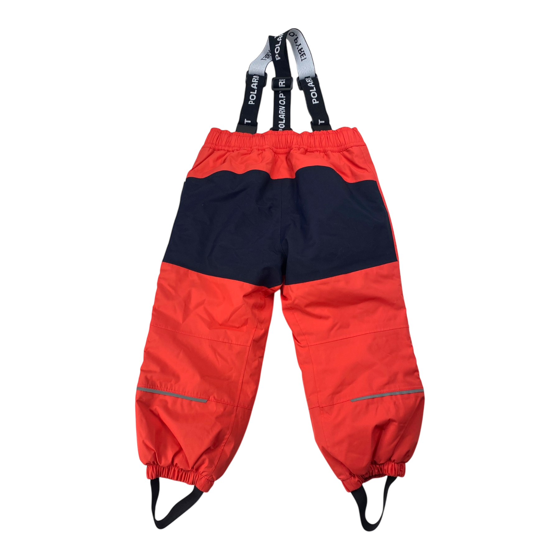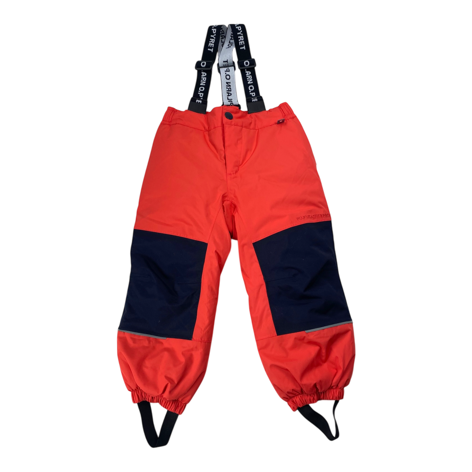 Polarn O. Pyret winter pants with elastic waist and zipper on the side. Elastic suspenders and foot loops. Tags still attached.