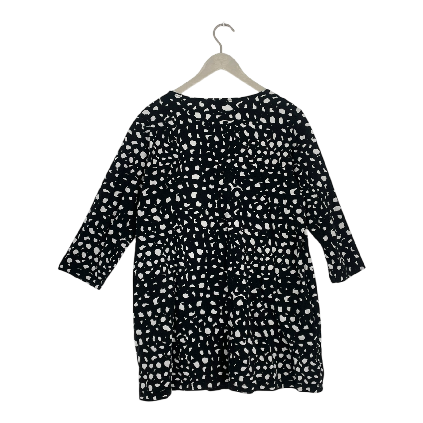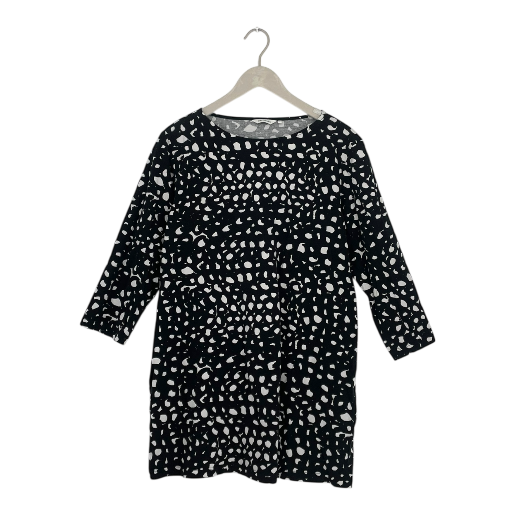 Marimekko Peretta tunic in Vatanuotta print with has a slightly widening A-line cut, 3/4 sleeves, side pockets, and a oval neckline.