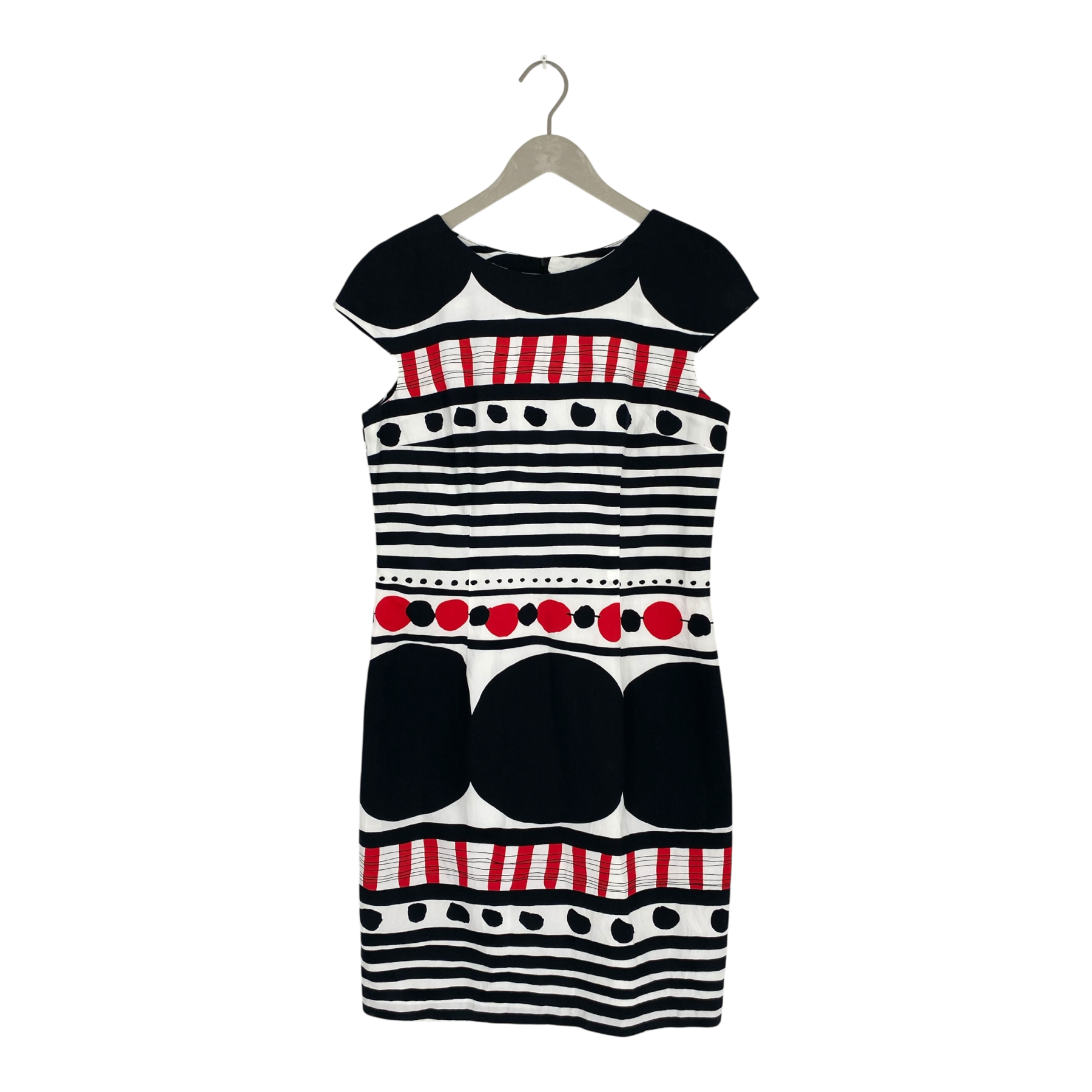 Marimekko's knee-length Pihka dress in the bold Paula print. The Pihka dress is fully lined, has a wide round neckline, short cap sleeves and a hidden zipper on the back. The product tag is still attached, but this item has no fabric belt included.