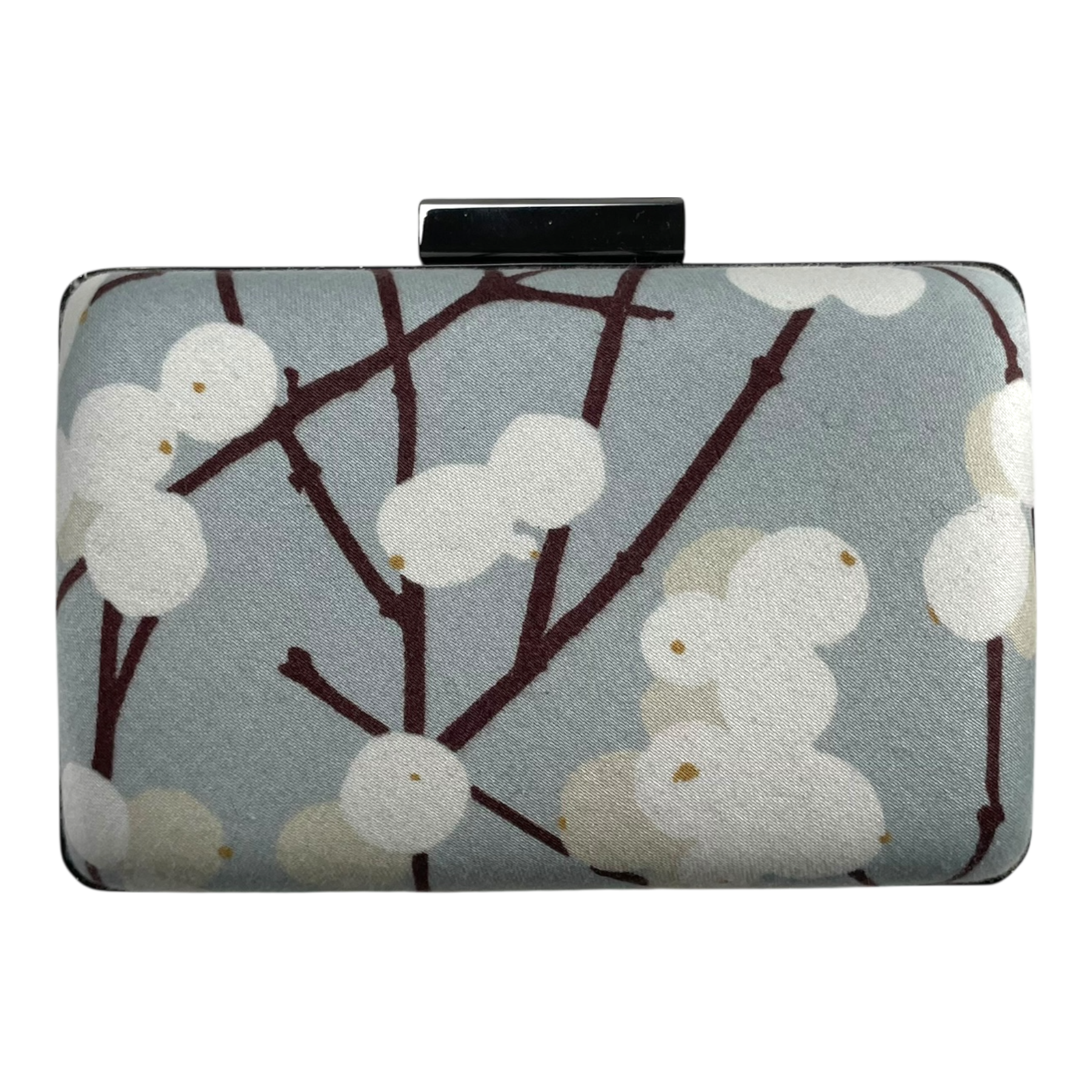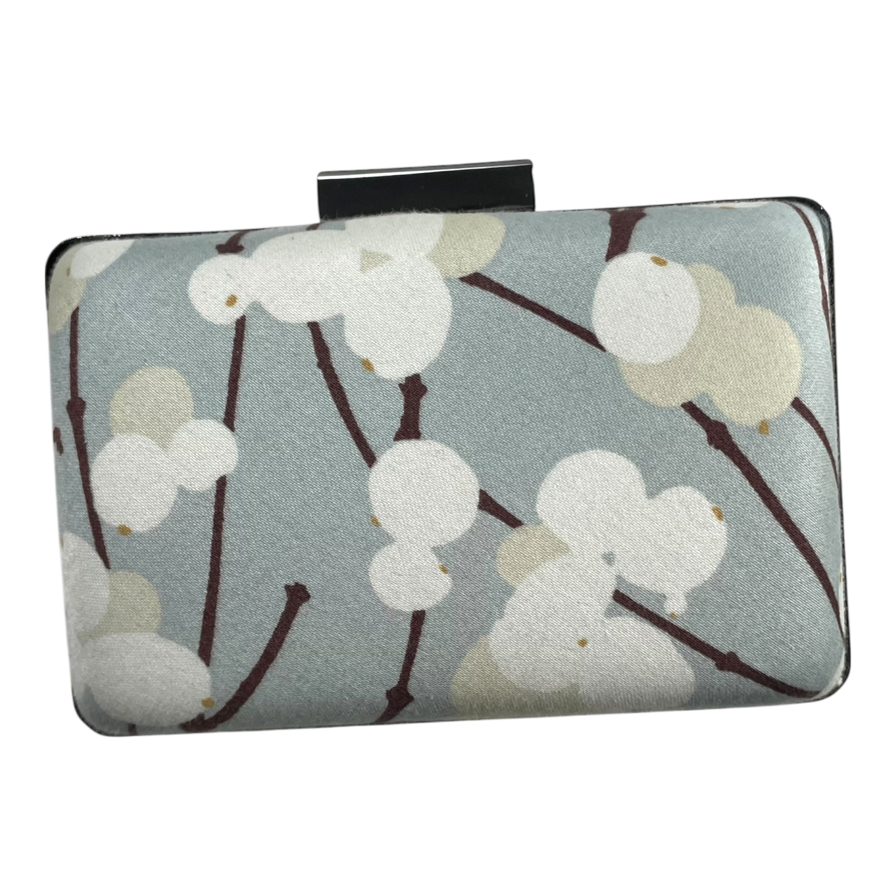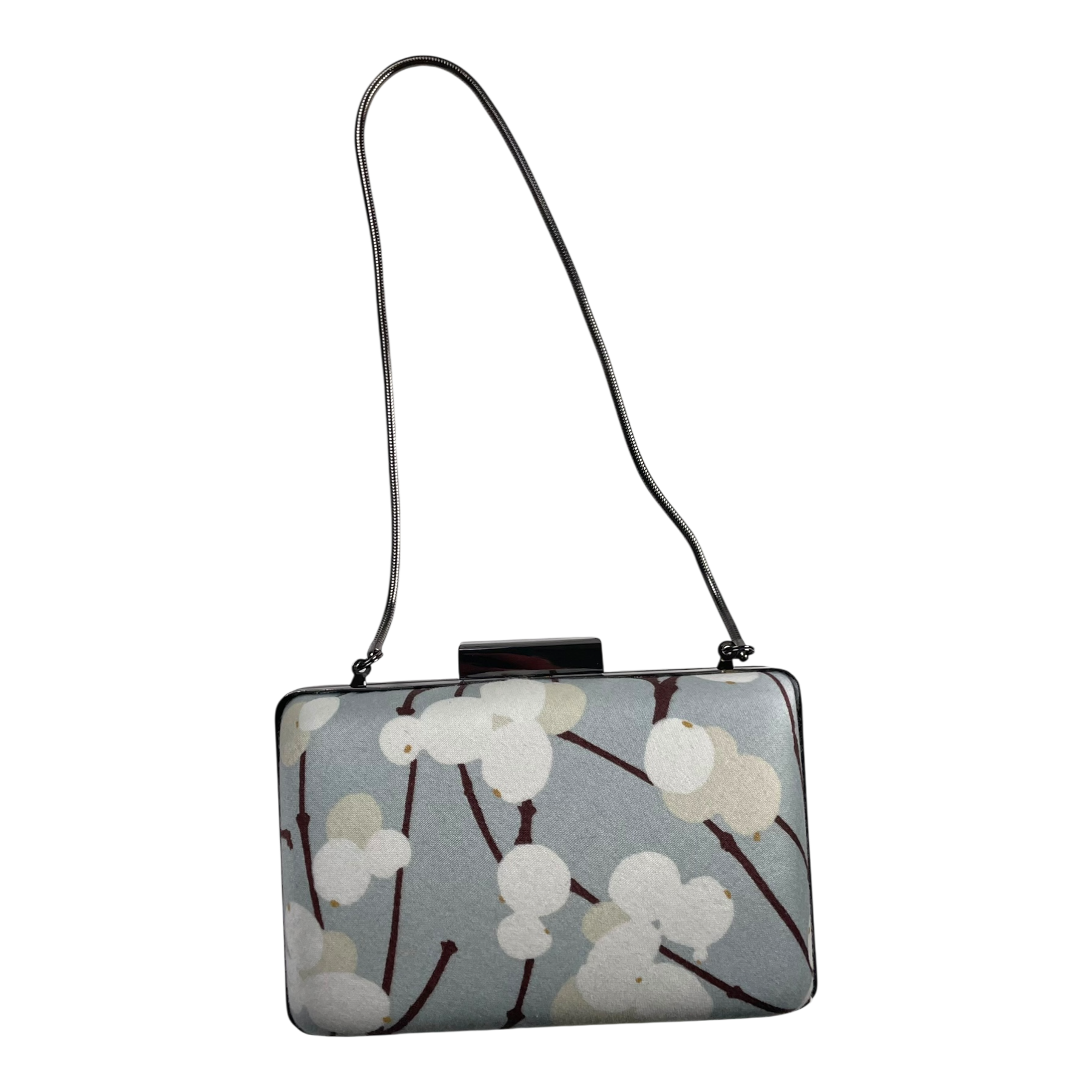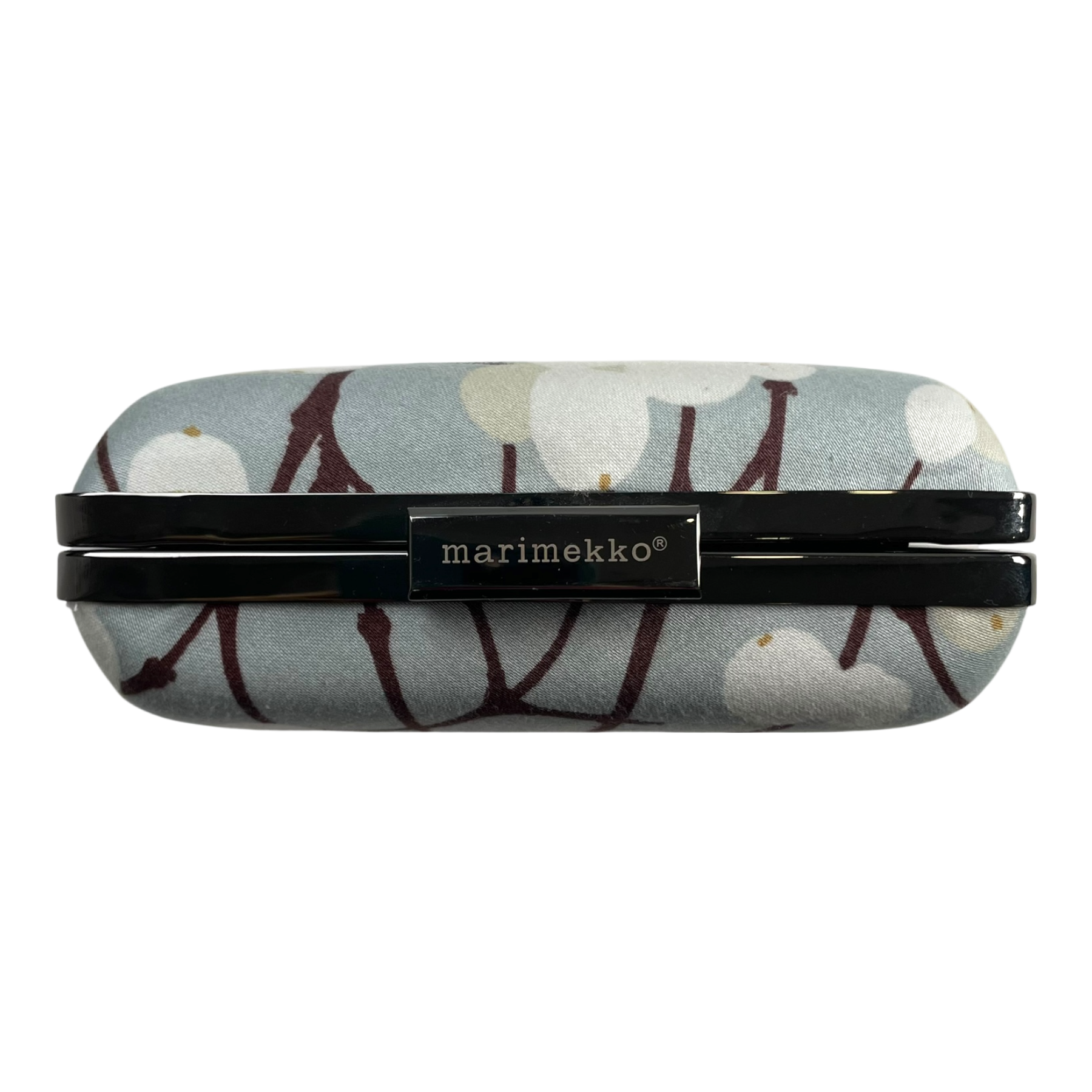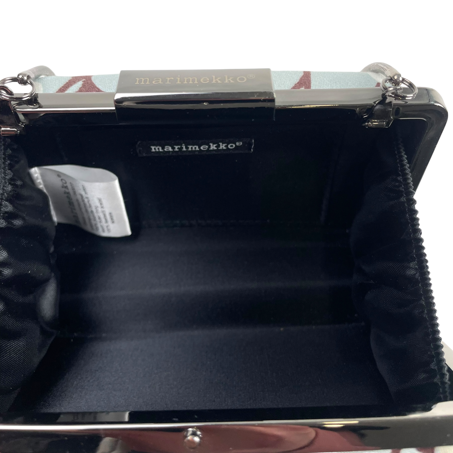 Marimekko evening bag in Lumimarja print. The bag has a metal shoulder strap and a clutch fastening with Marimekko logo text.