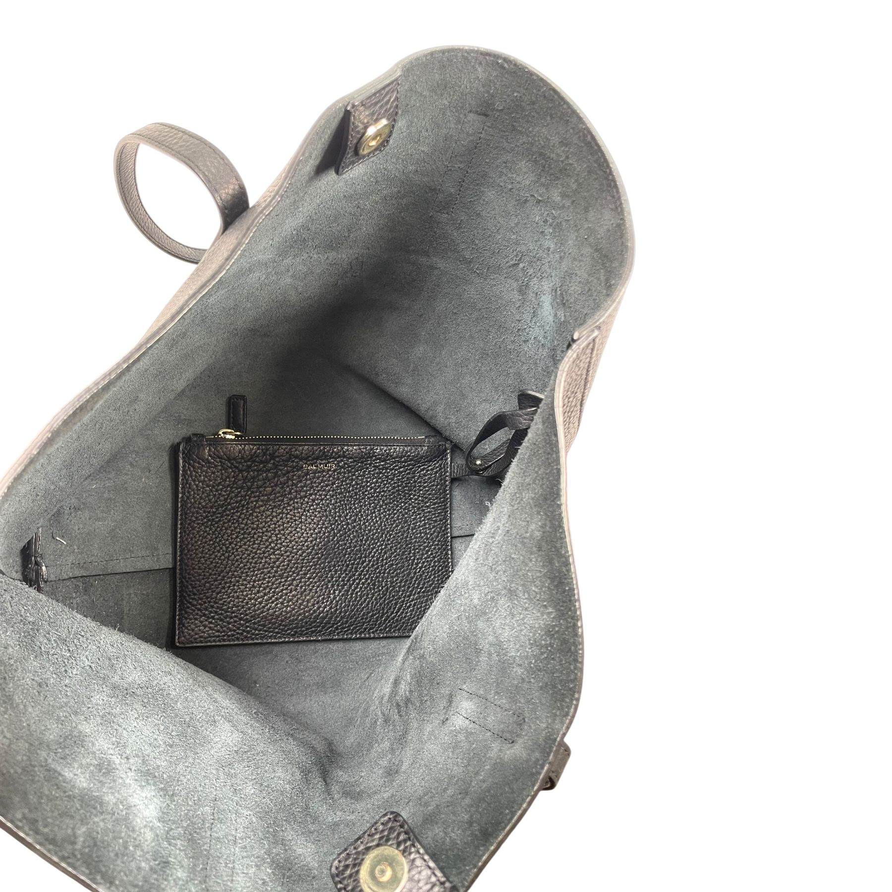 Balmuir shopper bag with gold color details, bottom studs, and a removable inner pouch bag.