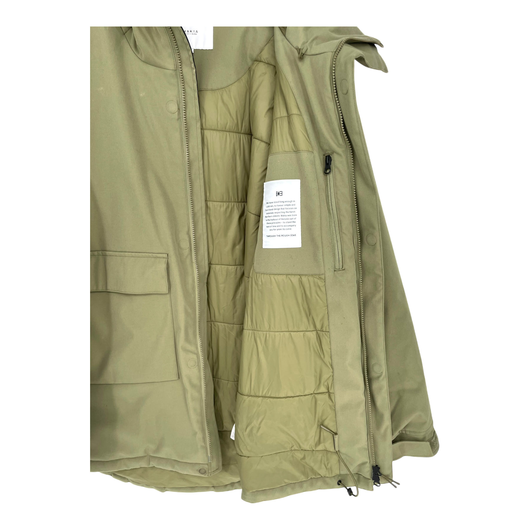 Makia men's jacket has a regular fit perfect for winter, adjustable hood and a zipper closure in the front. There is two welt pockets with zipper closure in the front and velcro adjustment on sleeve opening.