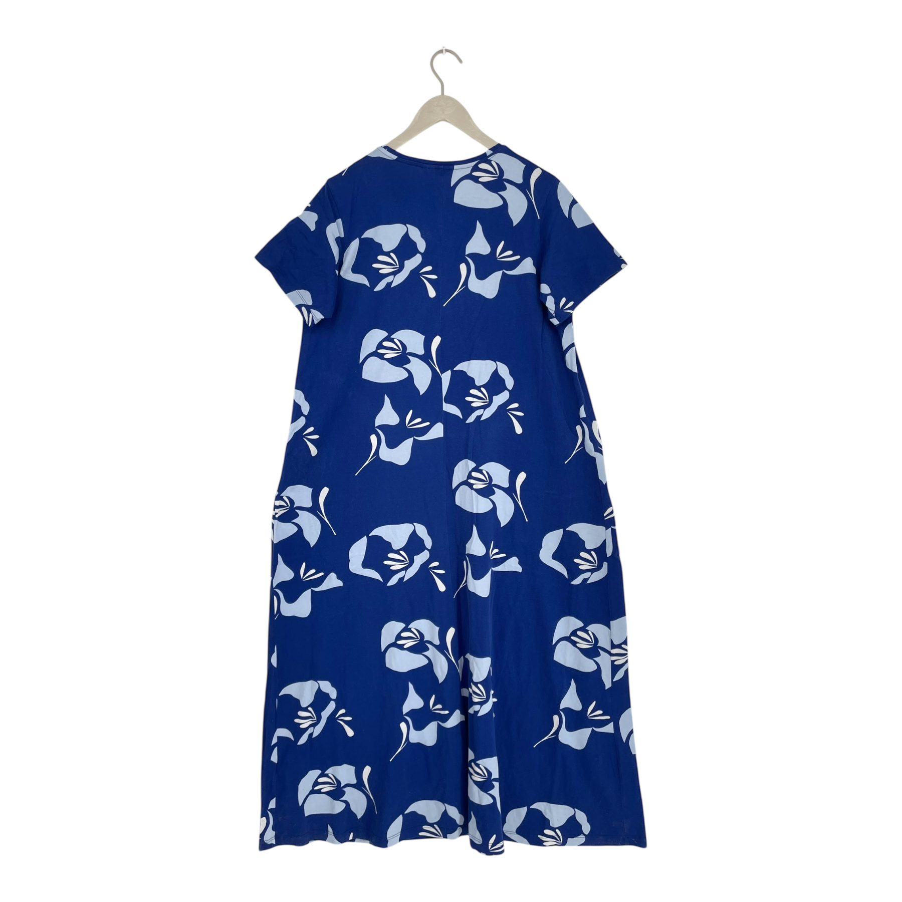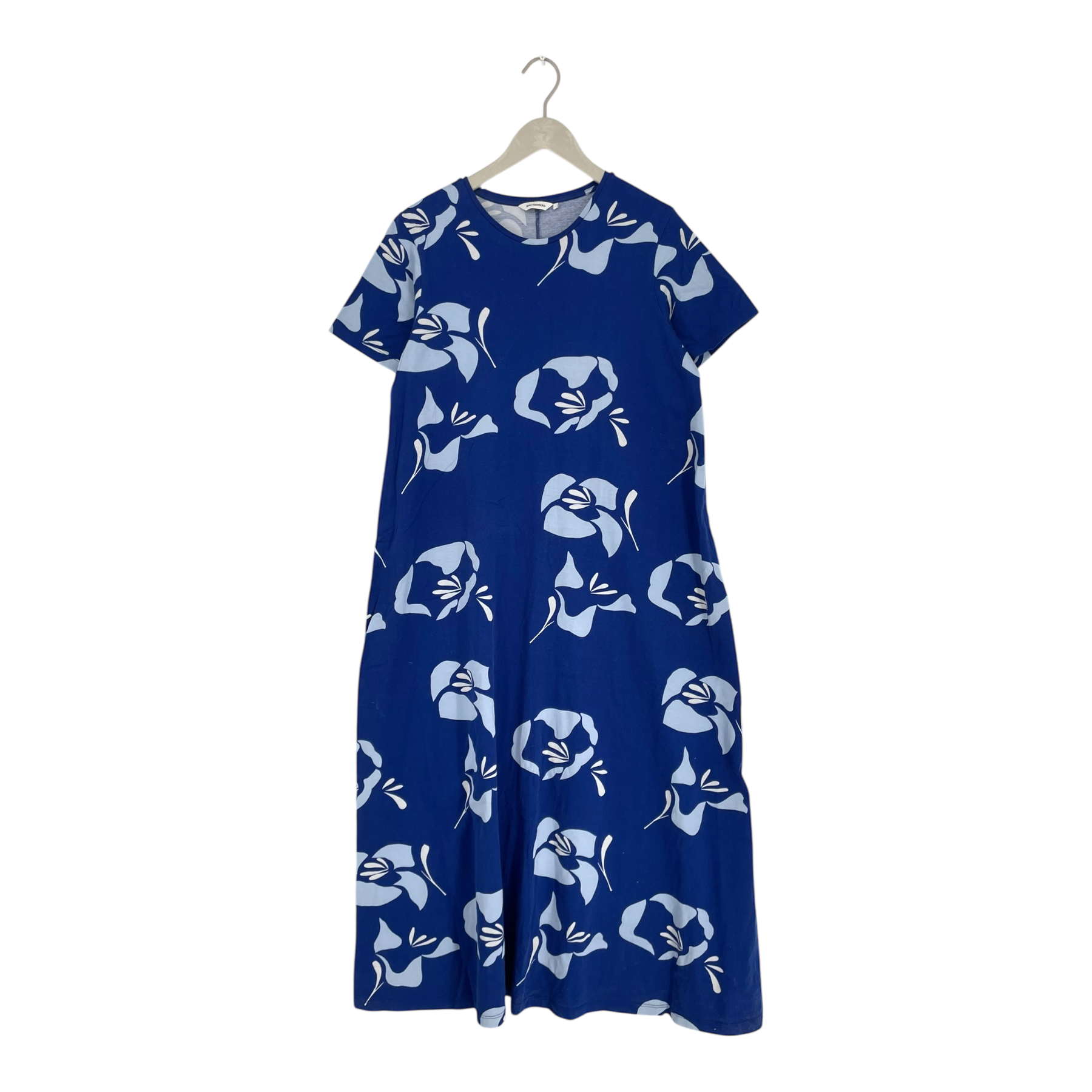 Marimekko Kalliokielo tricot dress in the Helakka print. The Kalliokielo dress has short t-shirt sleeves and a round neckline.
