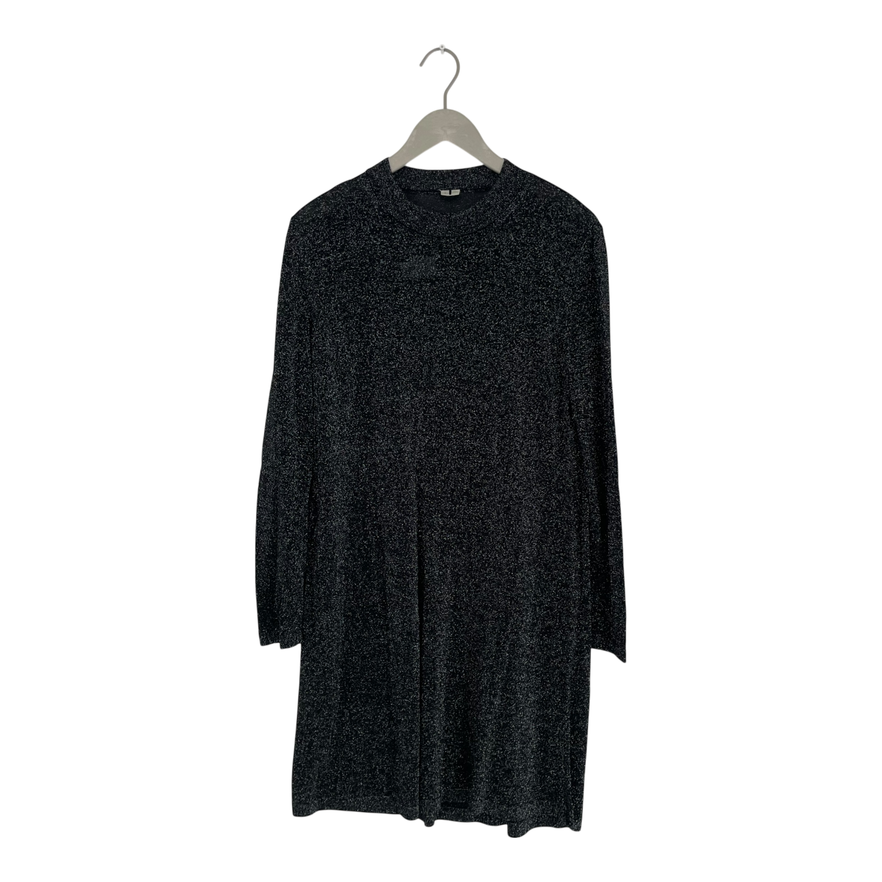 Arket long sleeve slightly sheer knitted dress with black and sliver glitter thread. This dress is knee-length and it features a mock neckline and a straight-cut silhouette.