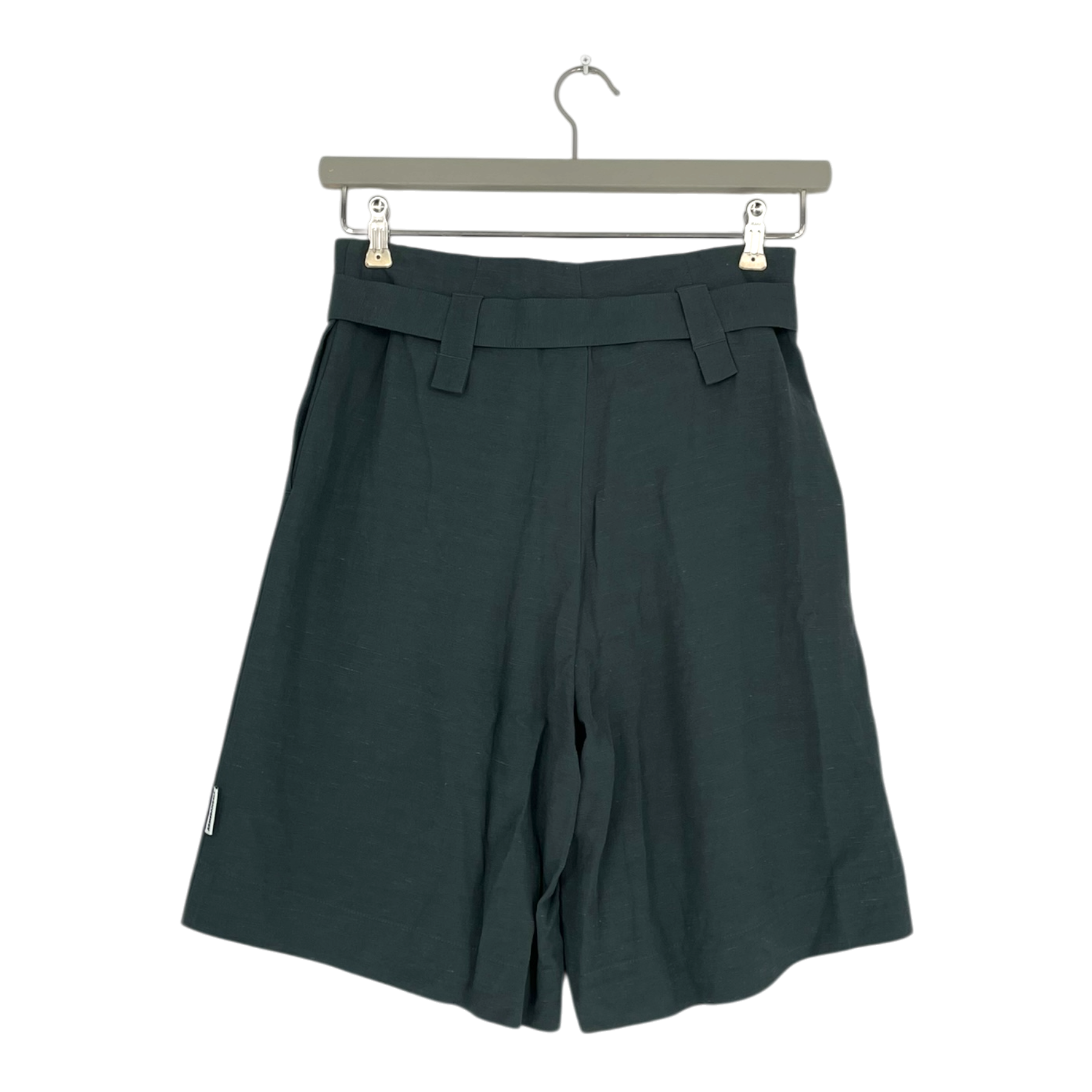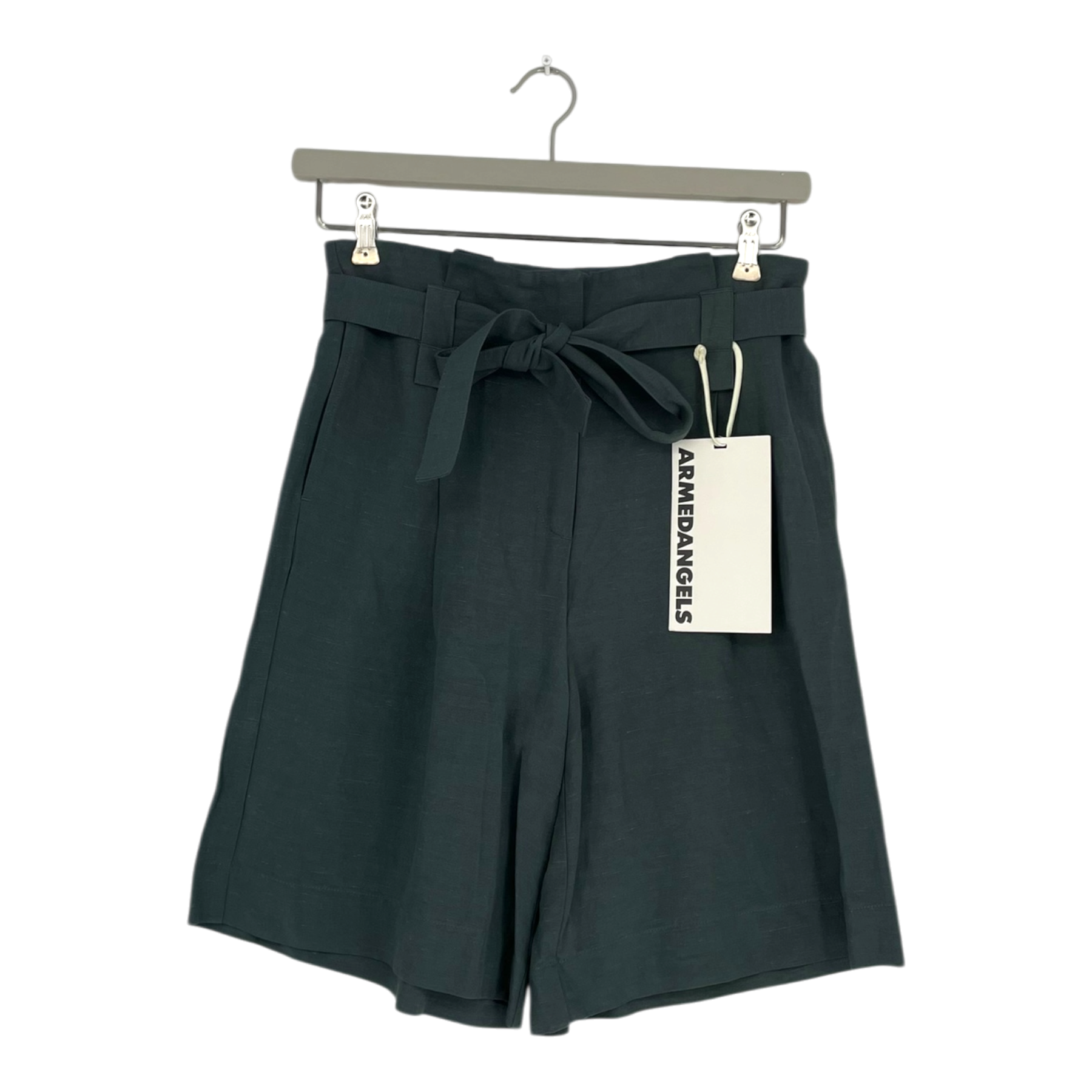 Armedangels Mireena Lino high-waisted shorts with paperbag waistline and self-tie belt. Features relaxed fit through the leg with turned-up cuffs and side pockets. The paperbag waist creates a flattering silhouette while the tie belt allows for adjustable comfort.