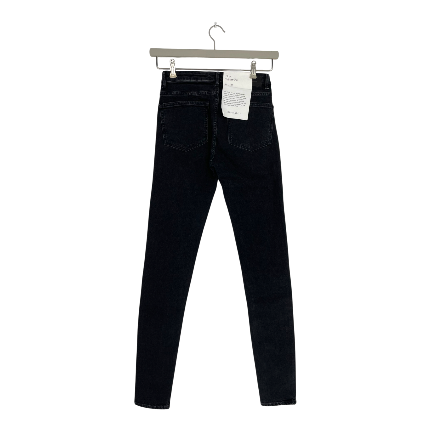 Armedangels high-waisted skinny jeans in black denim with classic five-pocket styling. Features button and zip closure with belt loops. Slim fit through hip and thigh with tapered leg opening.