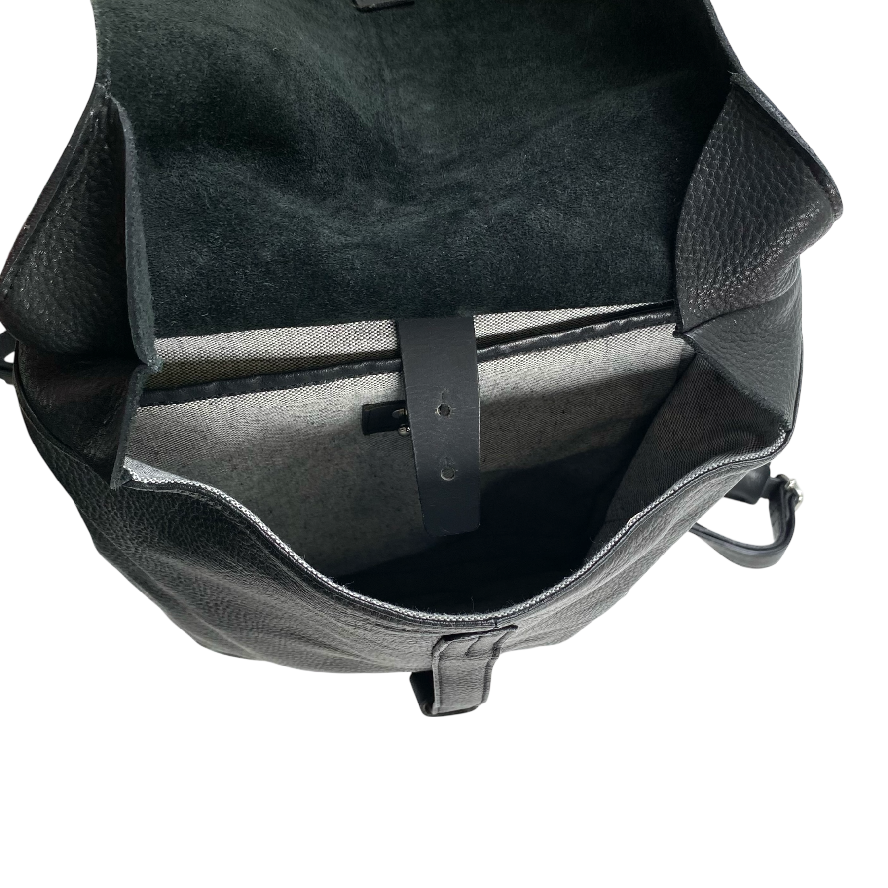 Harold's Lift Notebook Backpack S is made from 100% vegetable-tanned full-grain cowhide. The leather's virtually untreated surface gives it a velvety, rich feel. The main compartment accommodates a medium-sized folder and a 13-inch notebook. It closes with a snap fastener. The snap fastener is not fixed but slides upwards automatically—like an elevator—as the bag's contents grow. In this configuration, the bag expands by about a third. This can be especially practical when shopping, for example, or when you want to temporarily store an extra item of clothing.