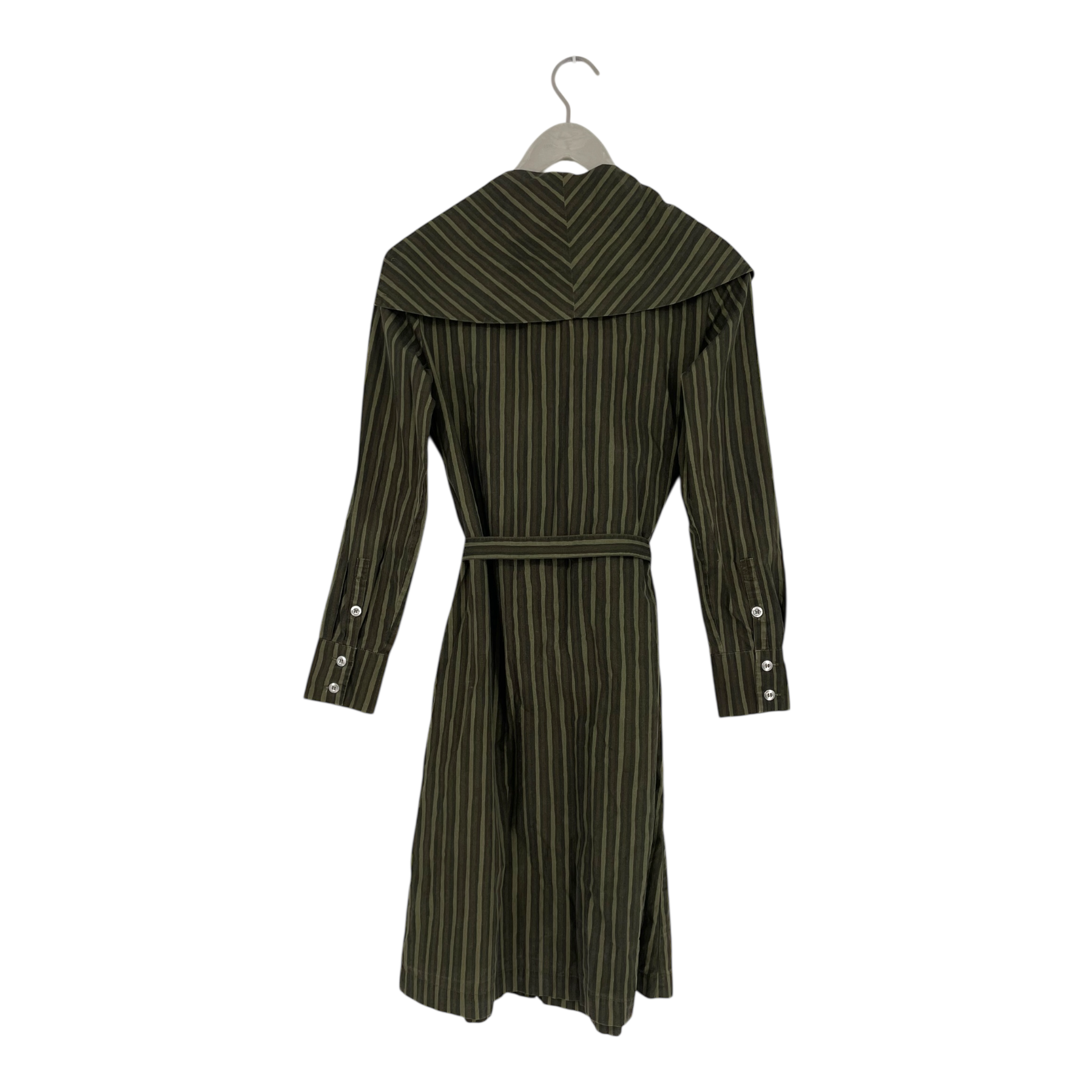 Marimekko Celeste buttoned dress in green and black Piccolo print with a feature flap collar, a front metal button closure and a detachable fabric belt. It has cuffed long sleeves, side seam pockets and an A-line hem that ends below the knee. Spare button included in the laundry tag.