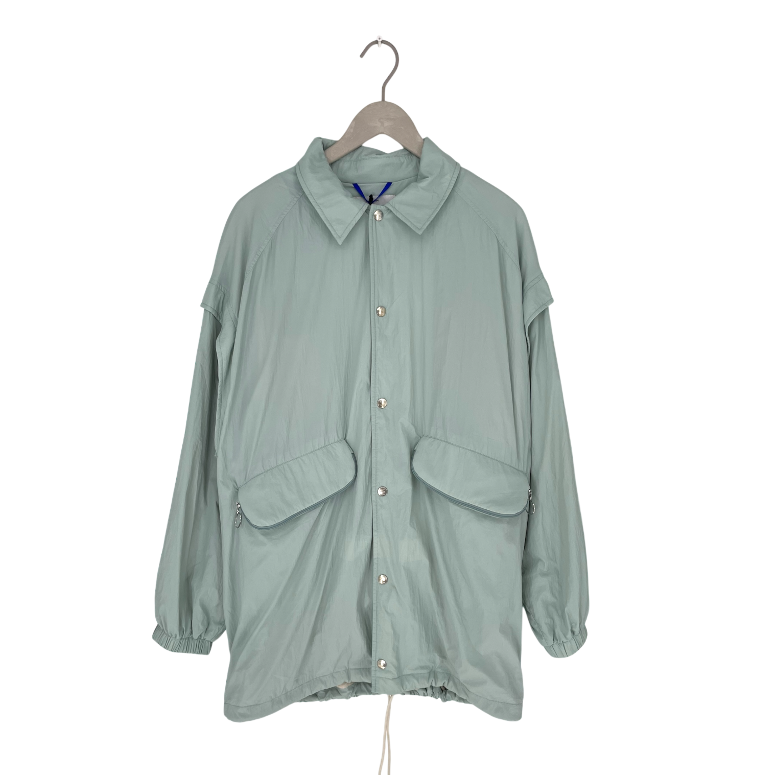 Embassy of Bricks and Logs Nin coach jacket is ode to the 90s. A throwback coach jacket with overlapping shoulder wings, extra big zip pockets and a terry cloth lining. Pocket flap functions as a zippered pocket compartment and there is open magnet pockets under the flaps.