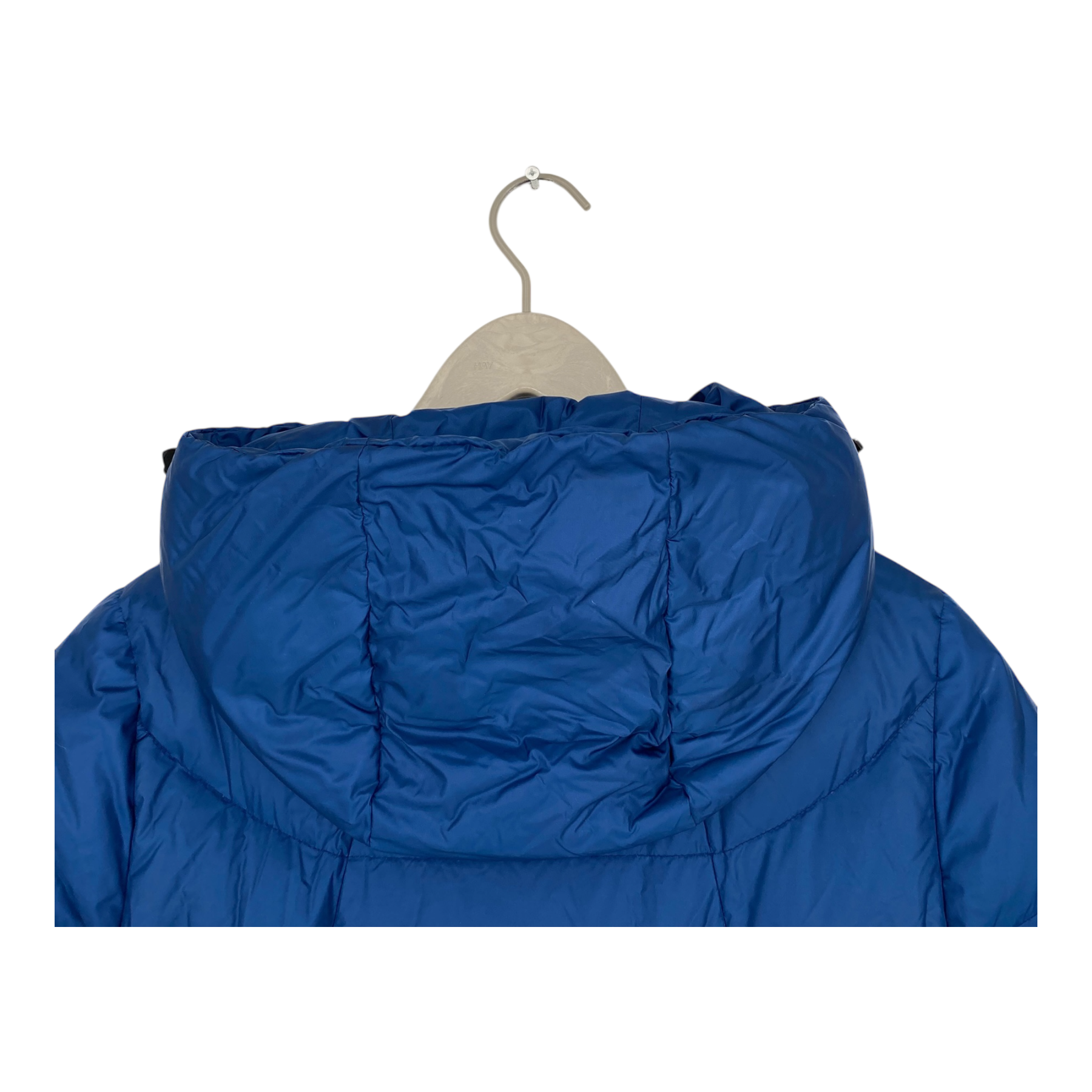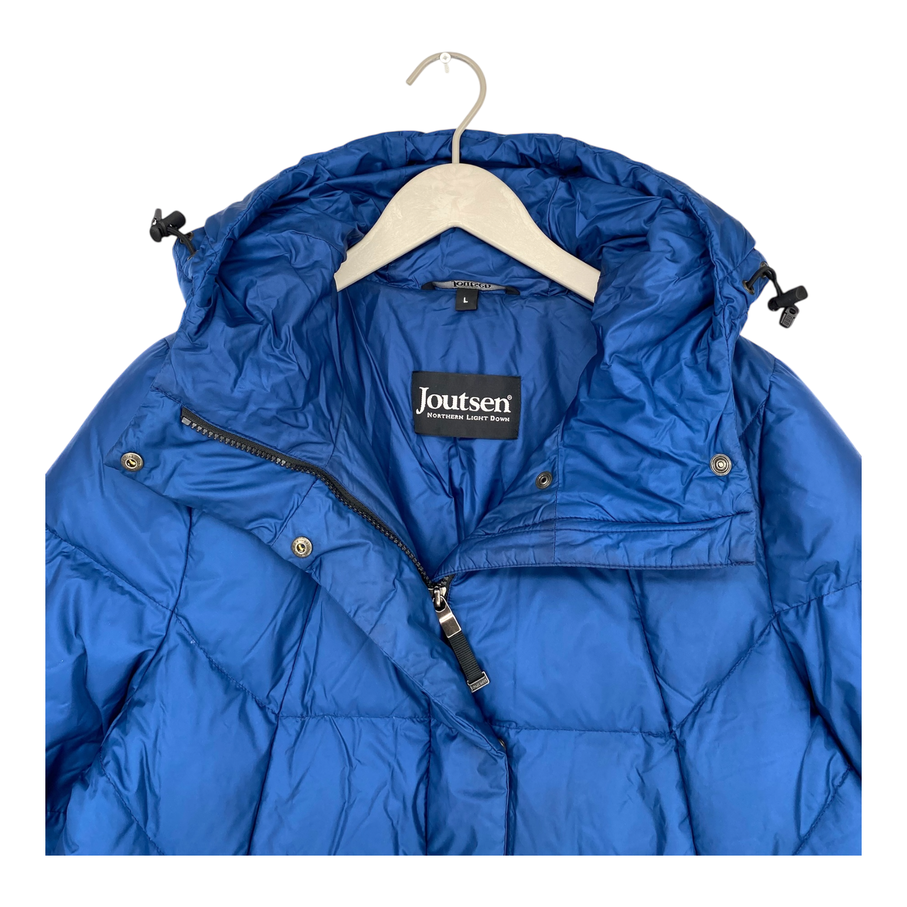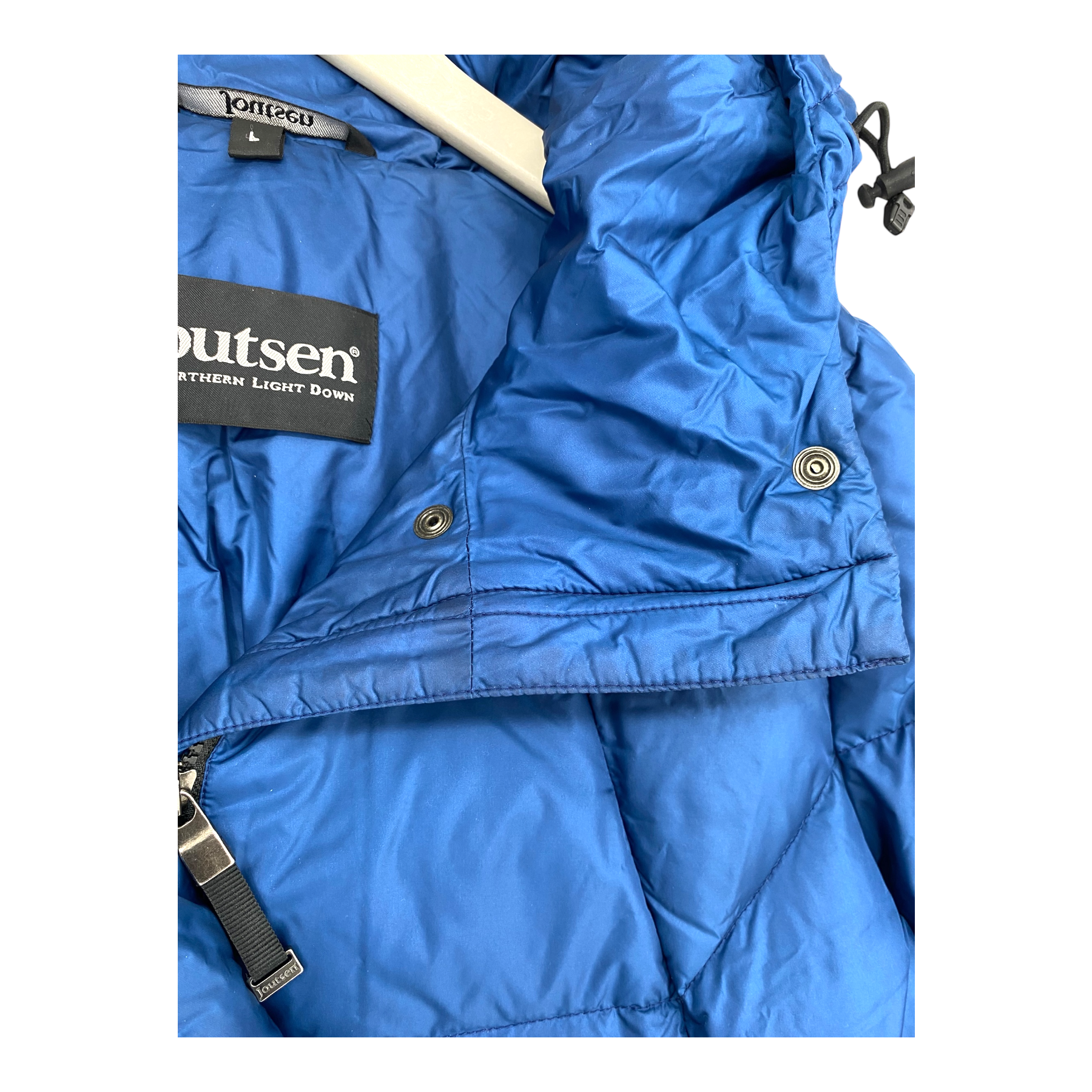 Joutsen Meri jacket is a down jacket perfect for the colder weathers. There is a horizontal stitching and two sealed side pockets. There is snap buttons and a double-slider fastening zipper that adds comfortability and daily functionality in the front. The adjustable hood can be worn down or up according to the weather and there is a high stand-up collar for protection.
