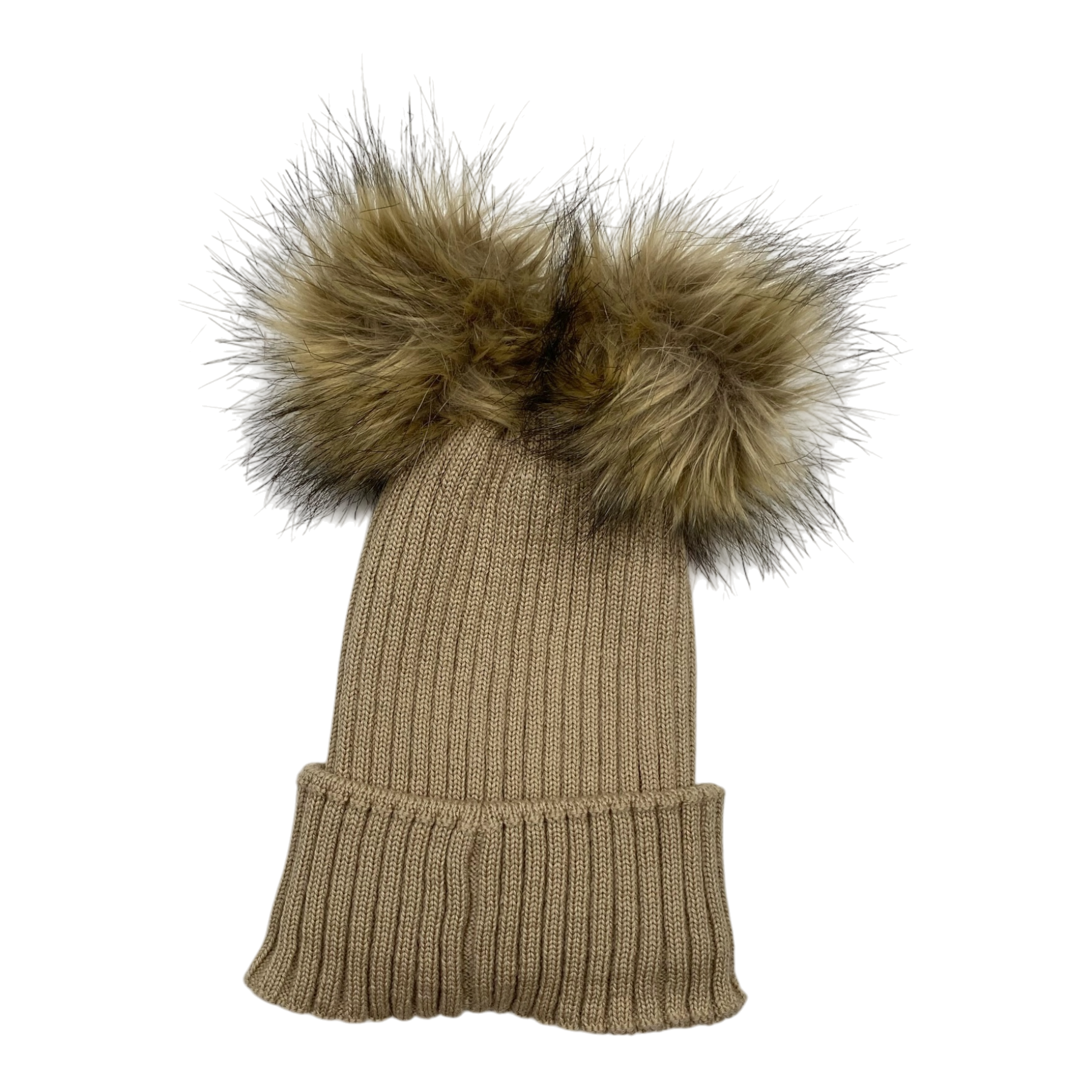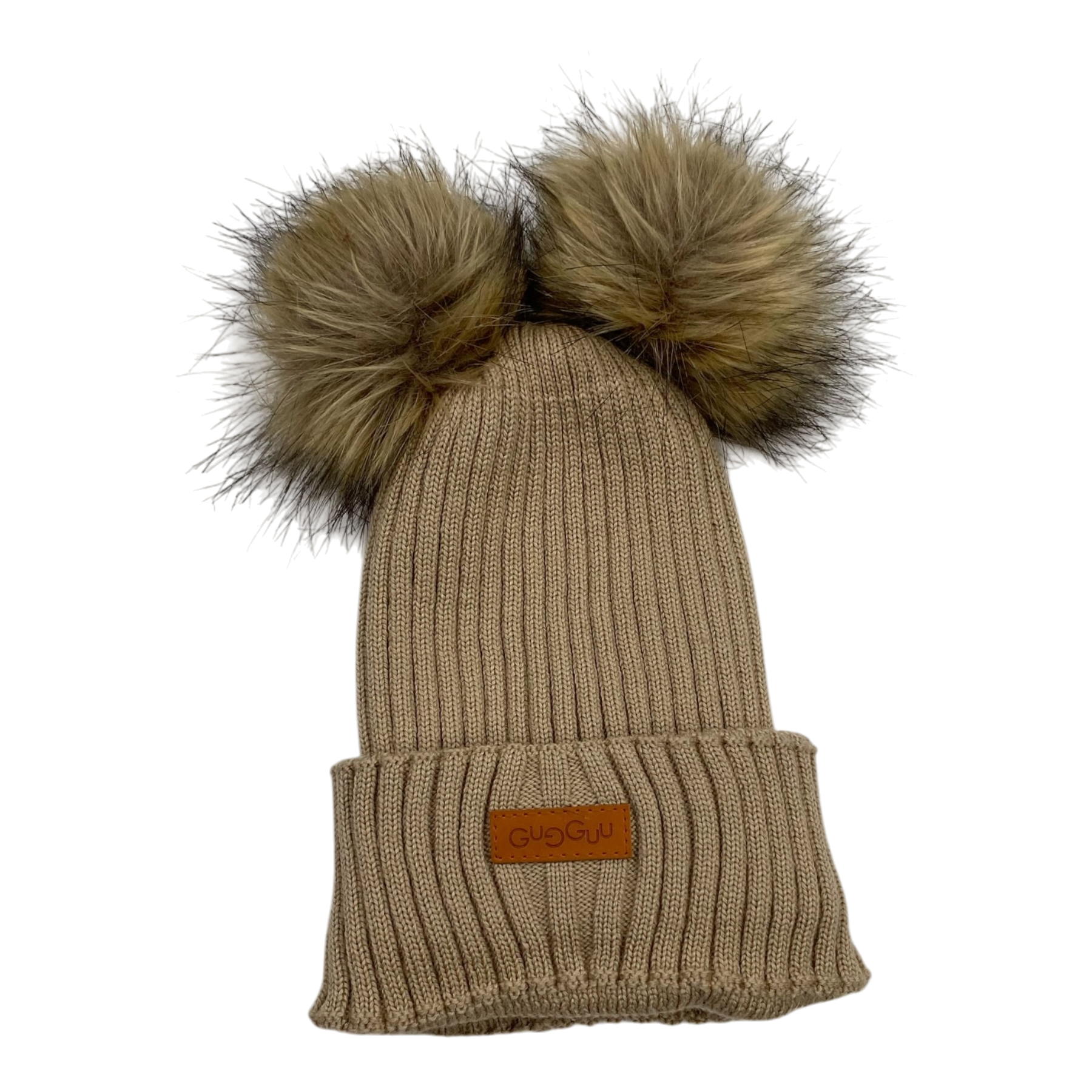 Gugguu merino wool beanie two fake fur poms.