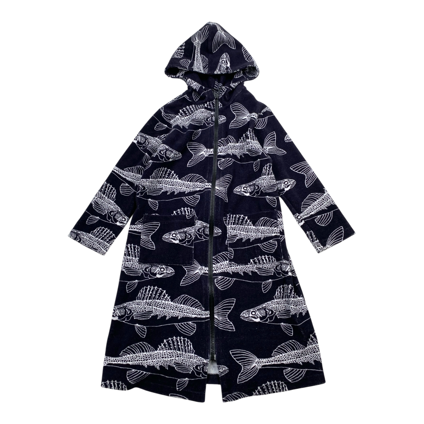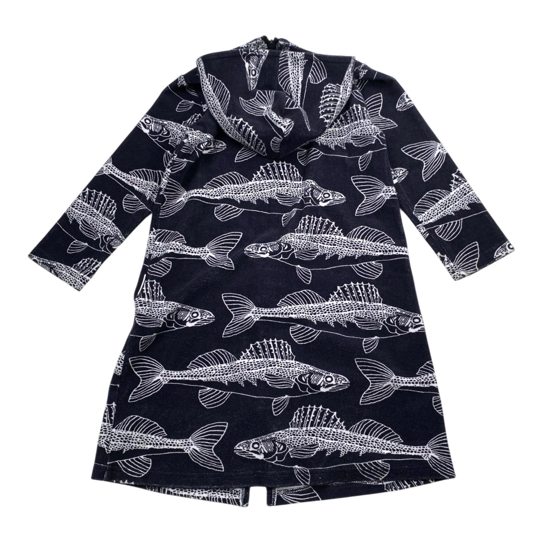 Versonpuoti terry jacket dress in fish print with zipper and pockets in the front.