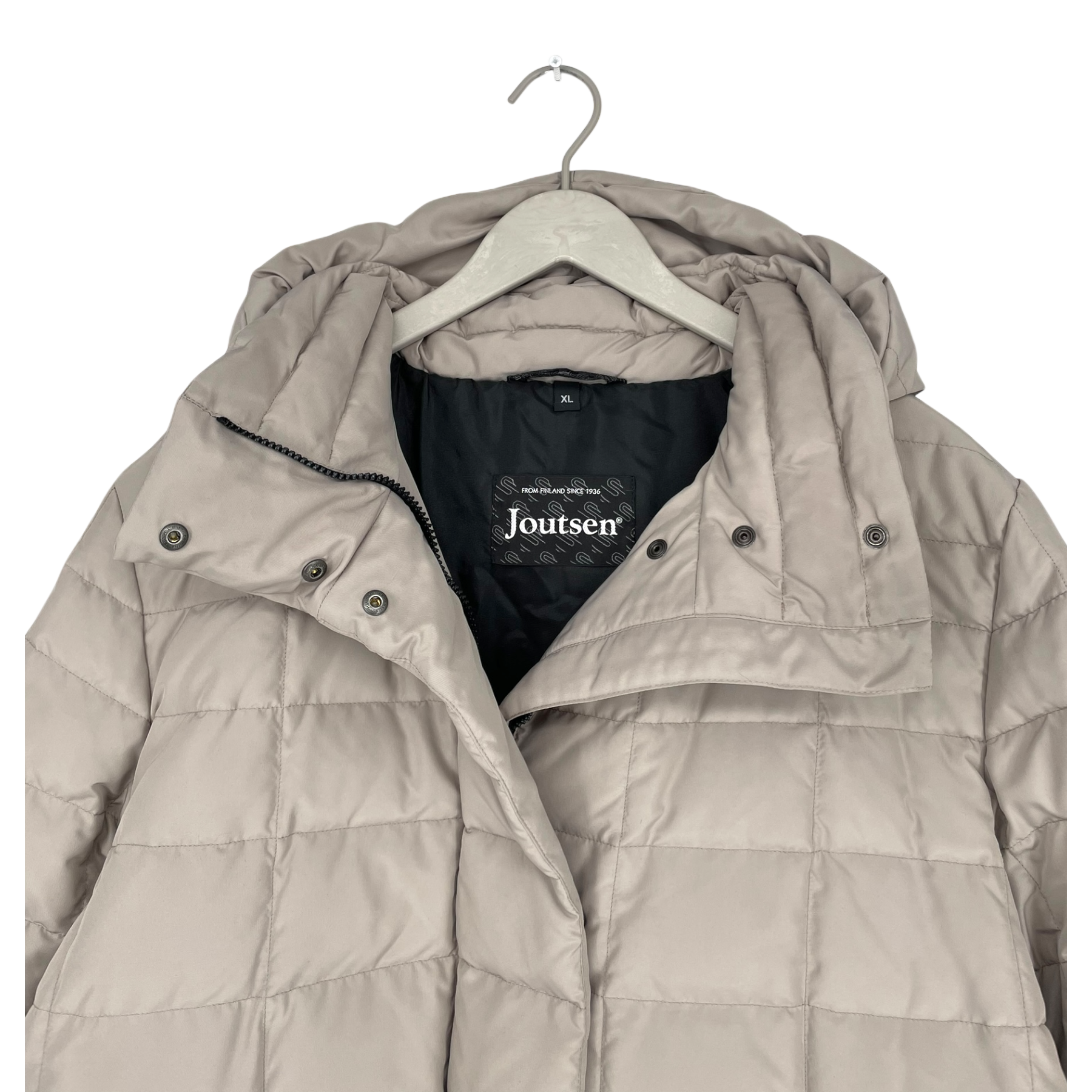 Joutsen Bea jacket is a down jacket perfect for the colder weathers. There is a grid stitching and two side pockets. There is snap buttons and a double-slider fastening zipper that adds comfortability and daily functionality in the front. The detachable and adjustable hood can be worn down or up according to the weather. There is a high stand-up collar for protection and the sleeves can be rolled up for a better fit.