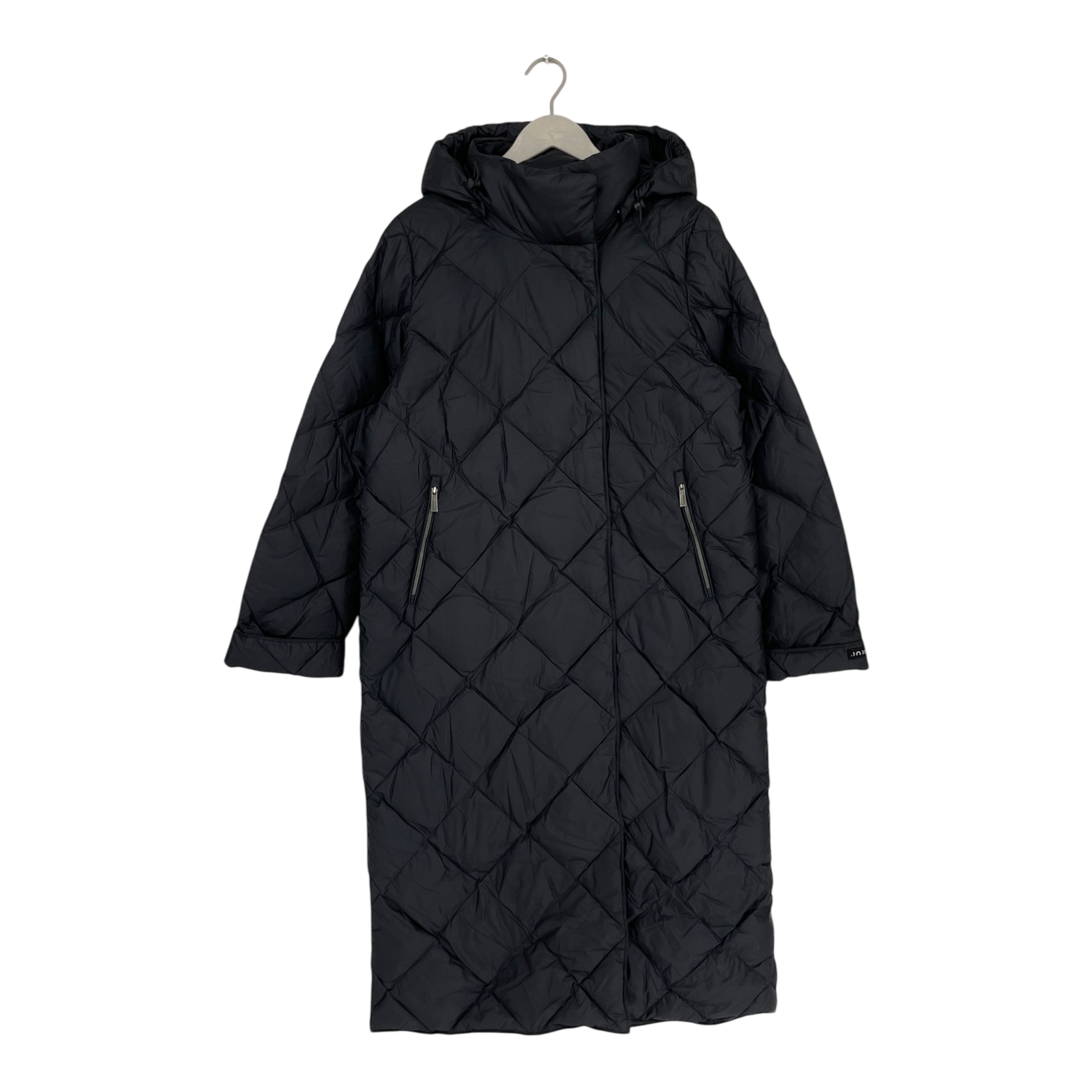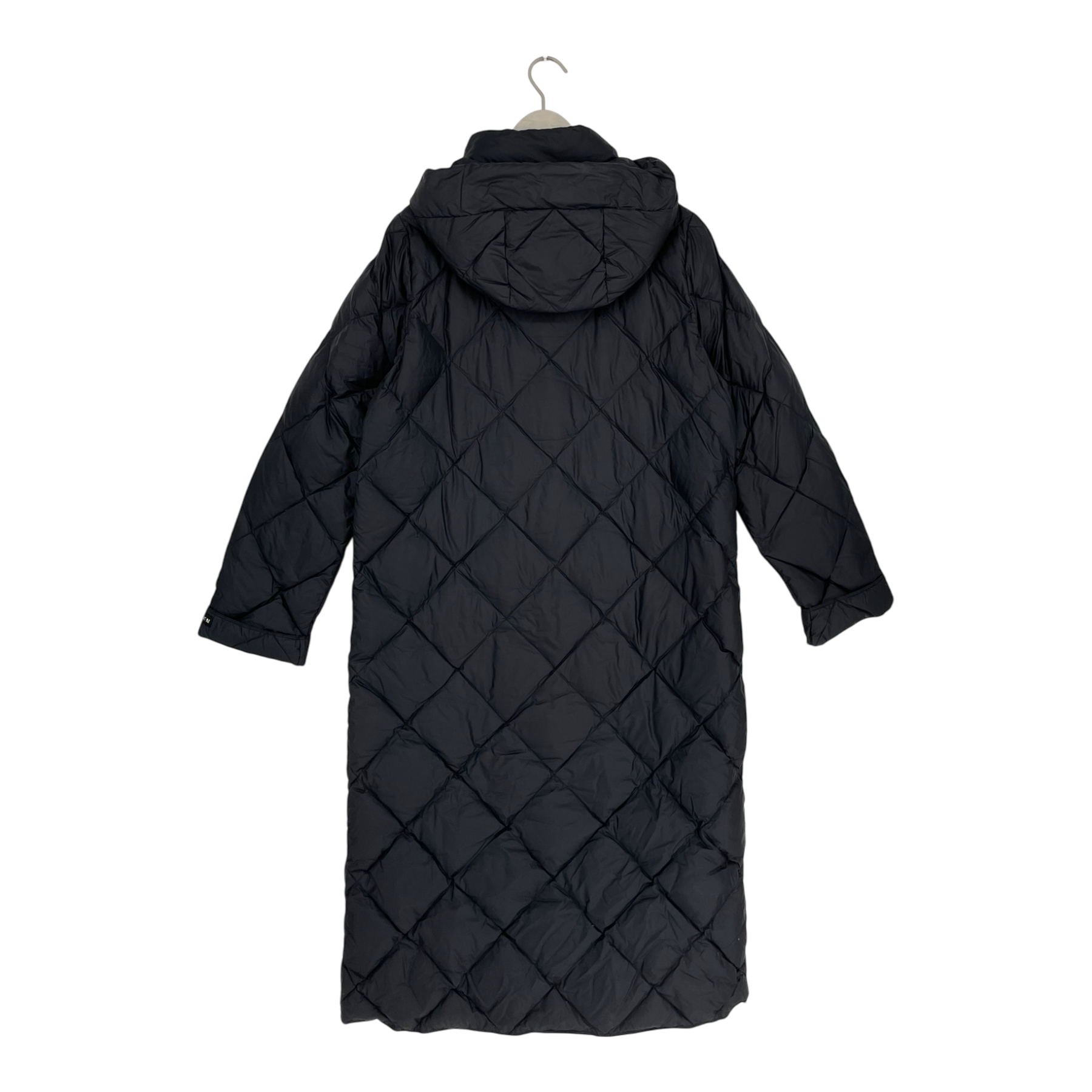 Joutsen lempi jacket is a light down jacket with a diagonal stitching. The two halves of the coat overlap in the front which adds to the feeling fo being wrapped in comfortable warmth. There is two vertical side pockets with zippers and a snap button closure in the front. The tightness of the hood can be adjusted with a drawstring and the hood can be unattached with buttons. Sleeves can be rolled up for a better fit.