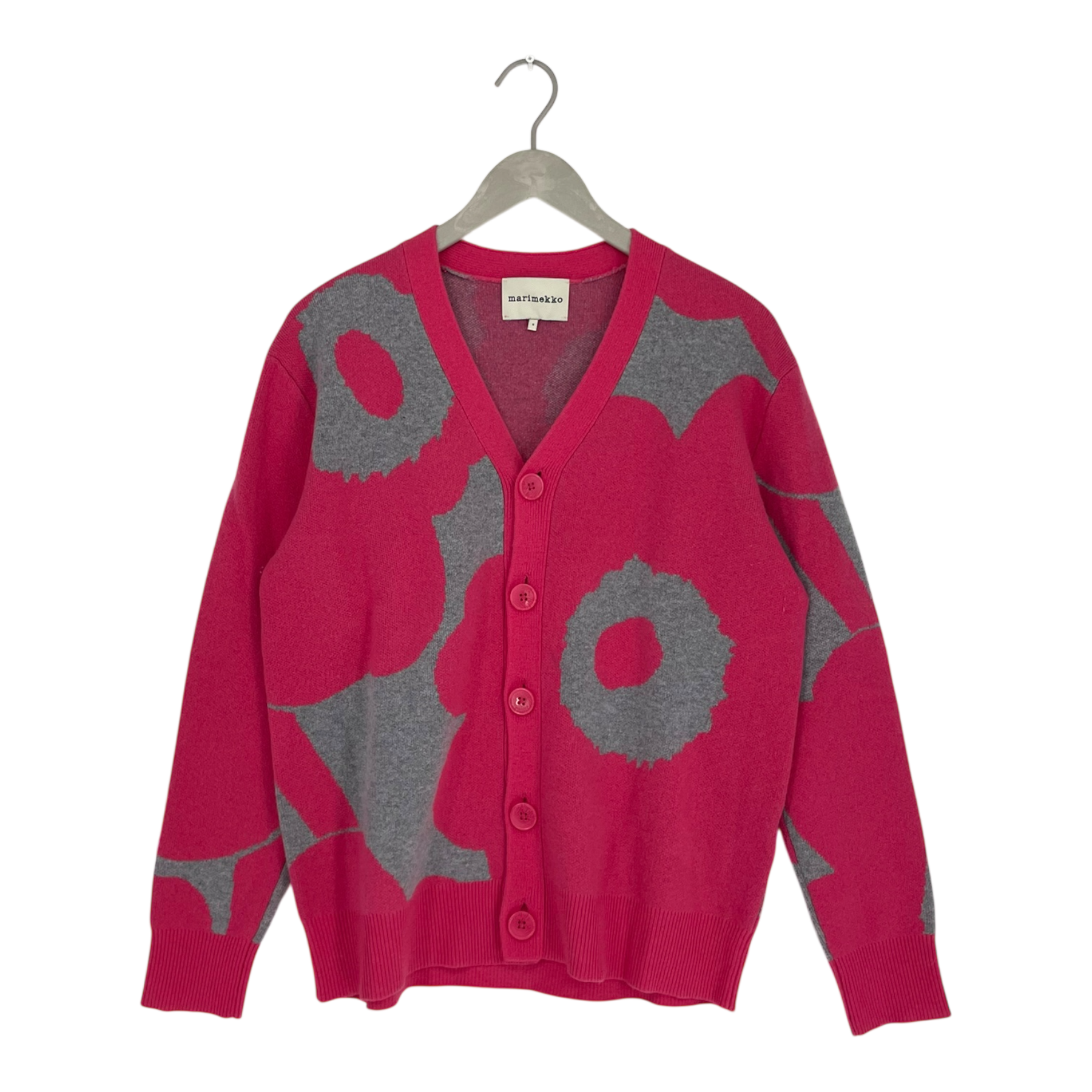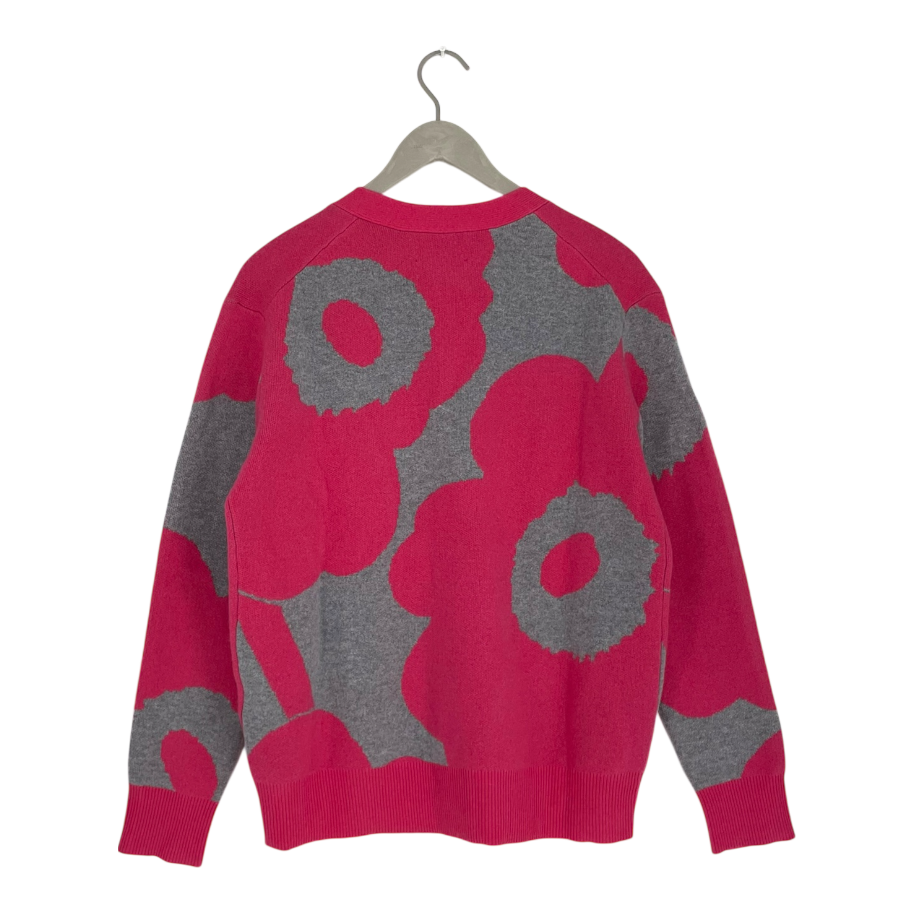 The Sif cardigan, made from a wool blend and jacquard knit, has a relaxed fit, straight cut, and features the Unikko pattern. The heathered cardigan has a V-neckline, button closure, and wide ribbing at the cuffs and hem. The product contains 80% certified, responsibly sourced wool and 20% recycled polyester.