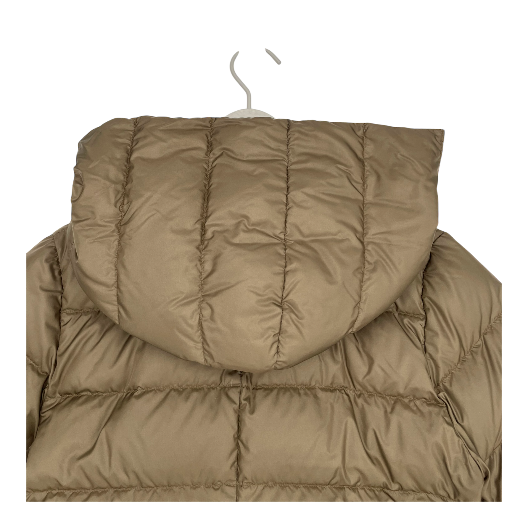 Joutsen Lene down coat. This long, lightweight coat features horizontal quilting, an asymmetrical front closure, and a large fixed hood that doubles as a protective collar. It includes side pockets with flap closures.