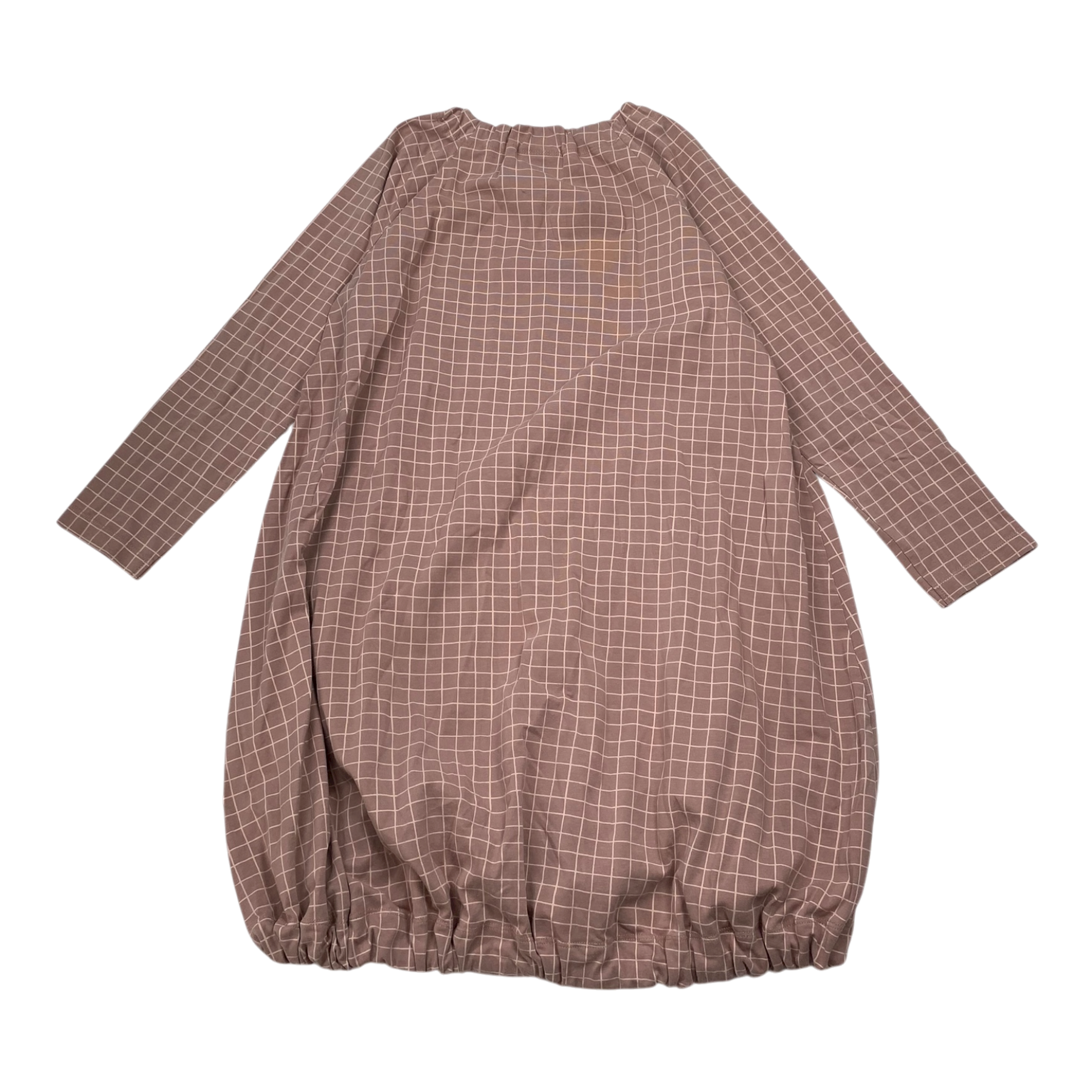 Papu tricot long sleeve dress with elastic hem and neckline and pink squares print.