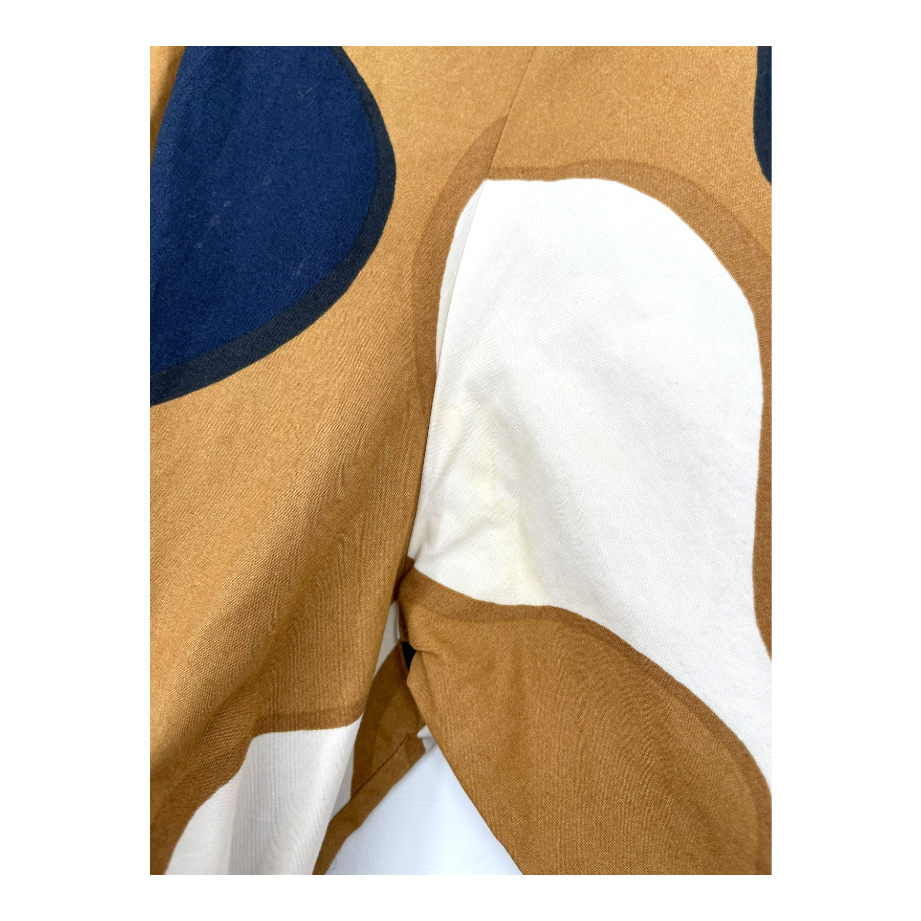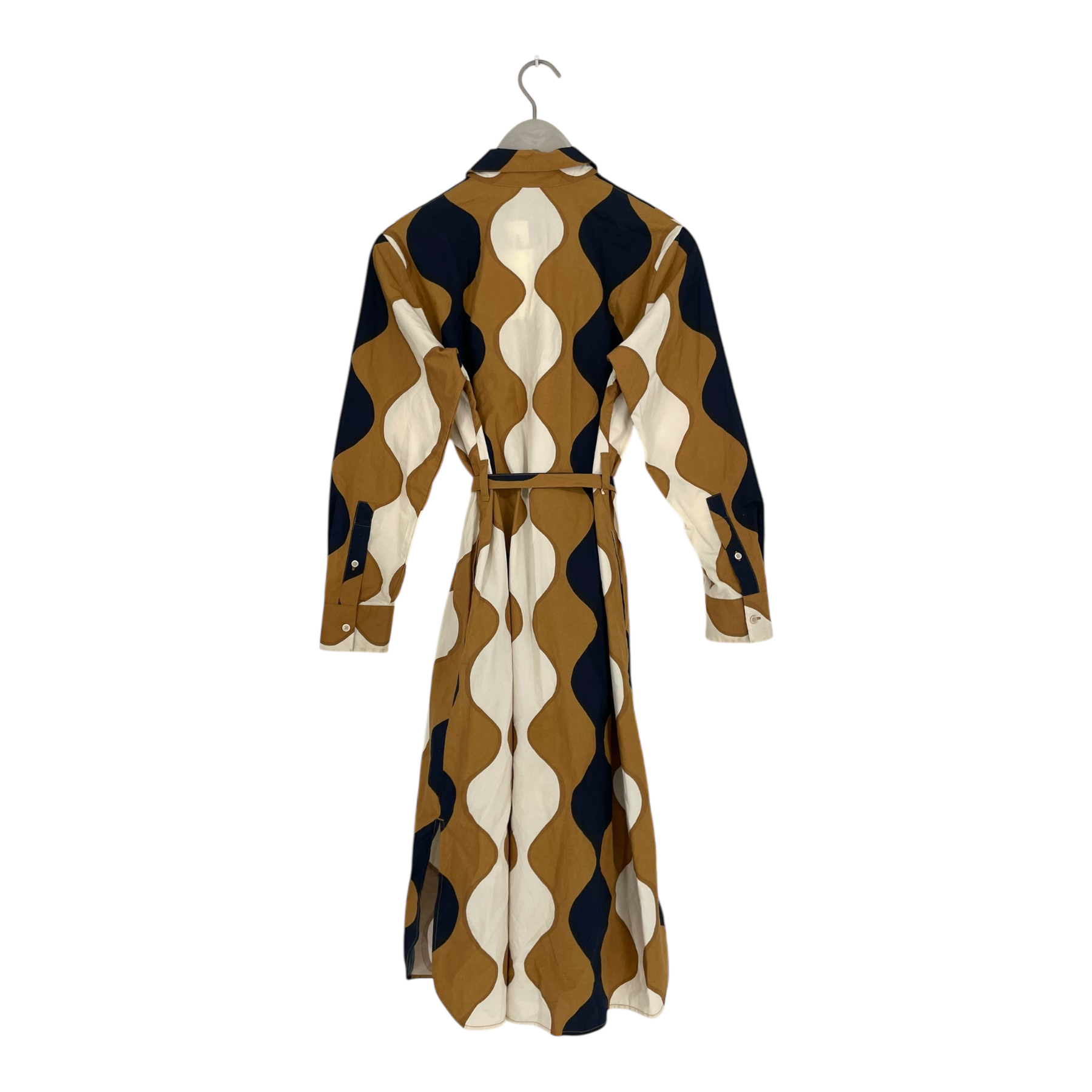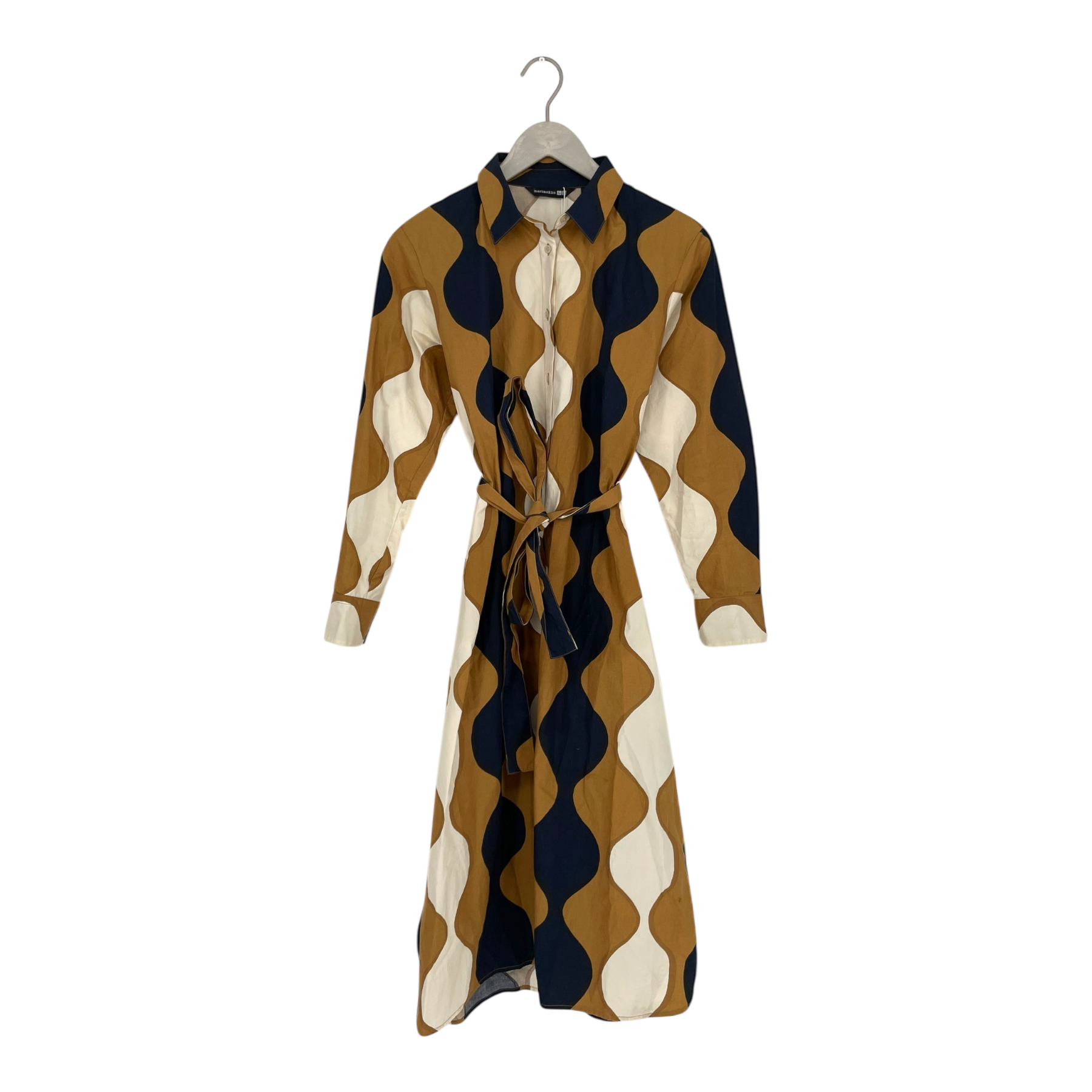 Marimekko x Uniqlo fully buttoned poplin dress with long sleeves and removable fabric belt. The fabric is somewhat stiff, either by design or from the wash.