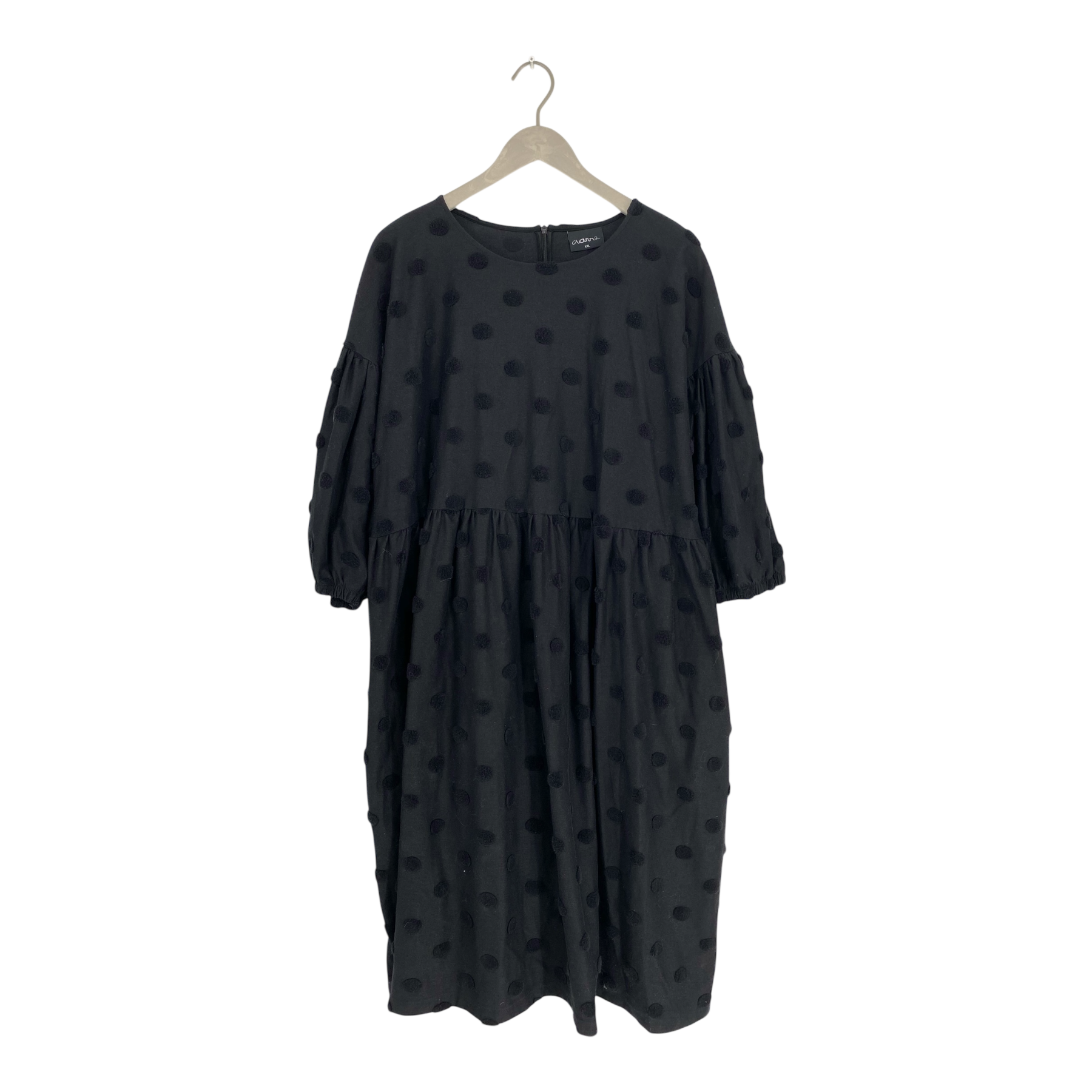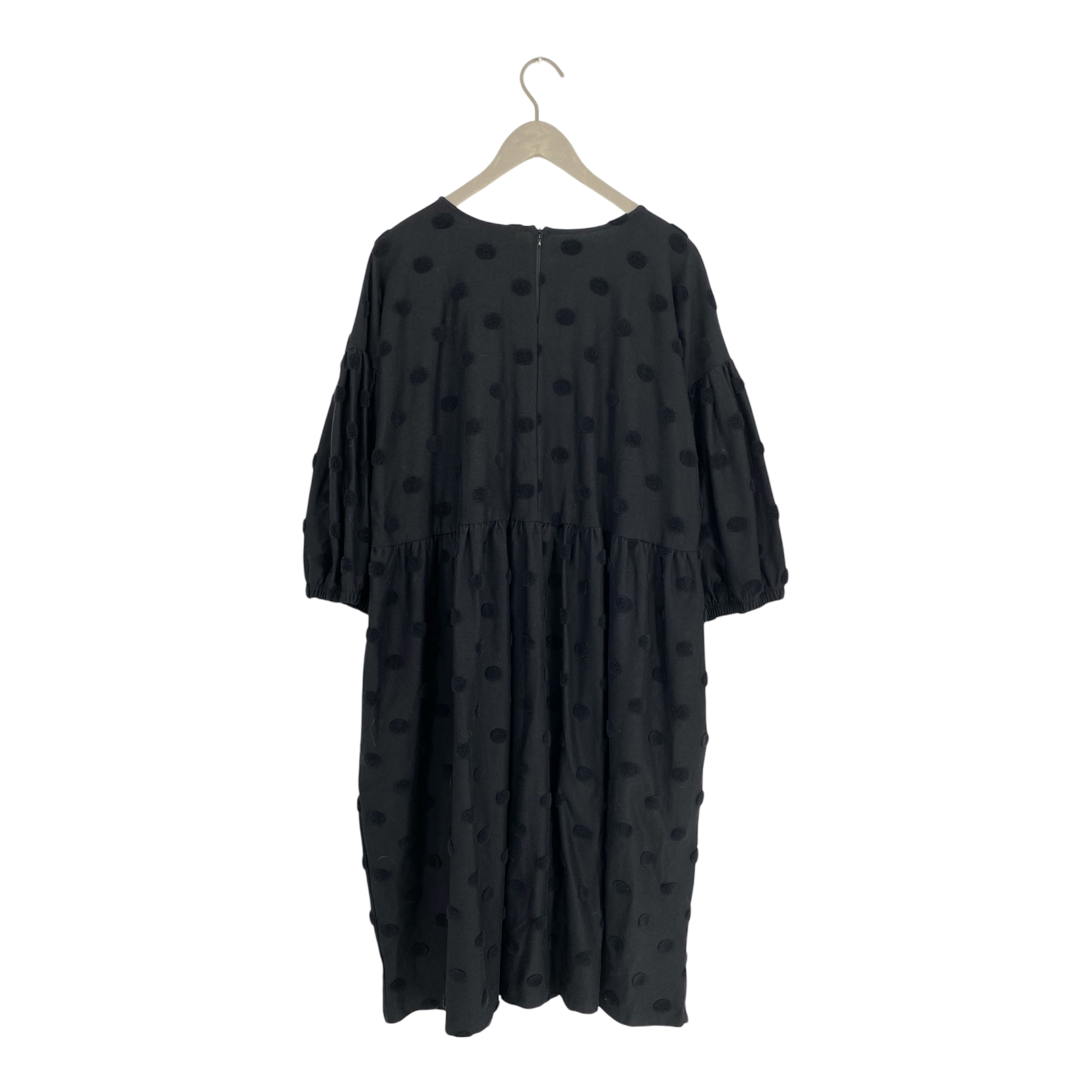 Aarre Elena dress has puffy sleeves and Big Dot structure in the fabric. Big Dot Dot is jersey like fabric with terry spots that rise from the surface of the knit, making it wonderfully lively. The dress also has pockets. Knee-length hem, 3/4 sleeves, dropped shoulder seam. Please note that the material does not include elastane, so the fabric does not stretch much.