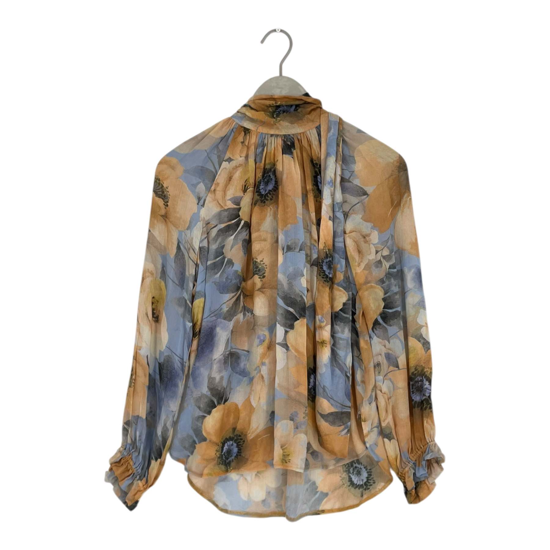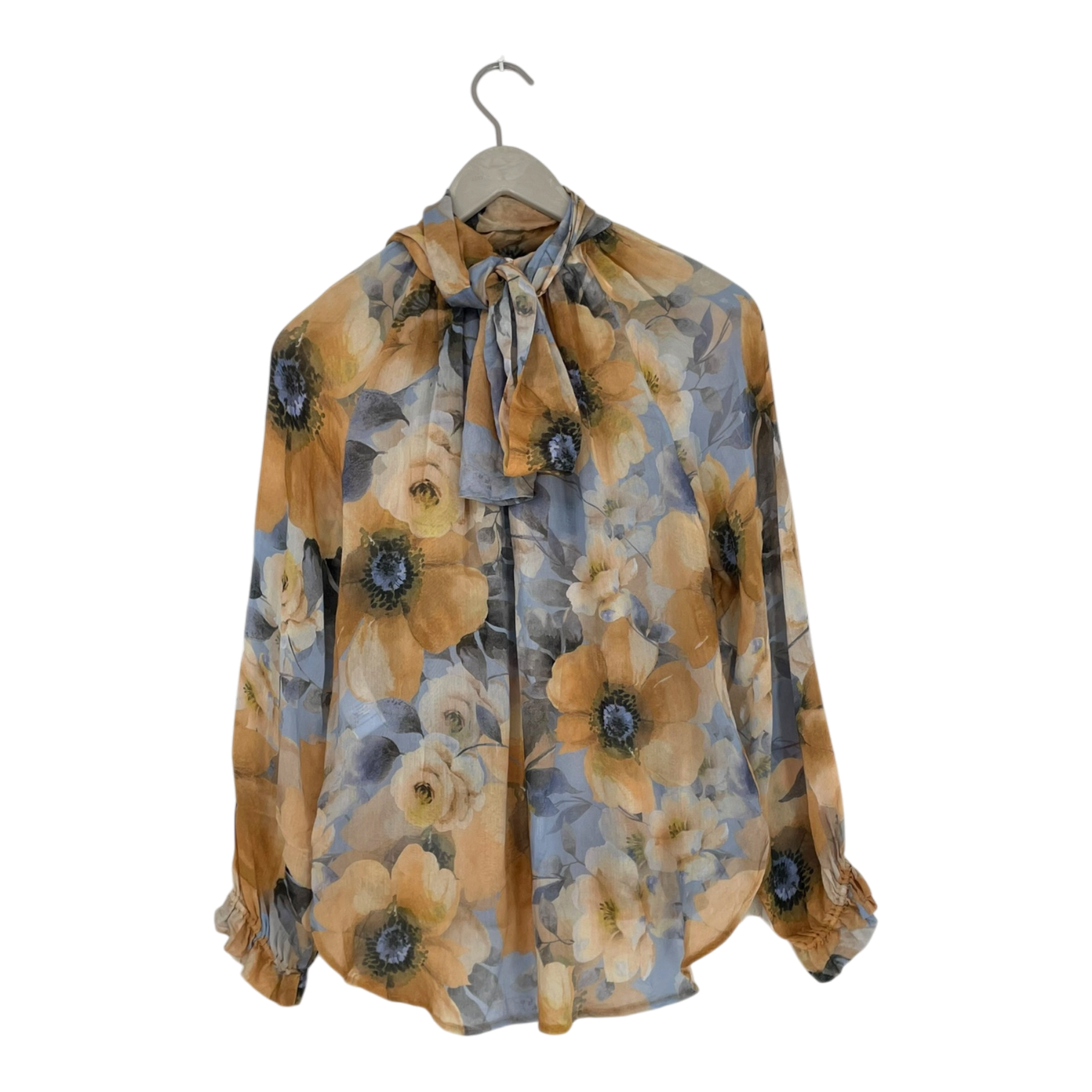 Andiata long-sleeved blouse with a floral print. This lightweight, semi-sheer piece features a high neckline with gathered detailing, full sleeves with smocked cuffs, and a curved hem.