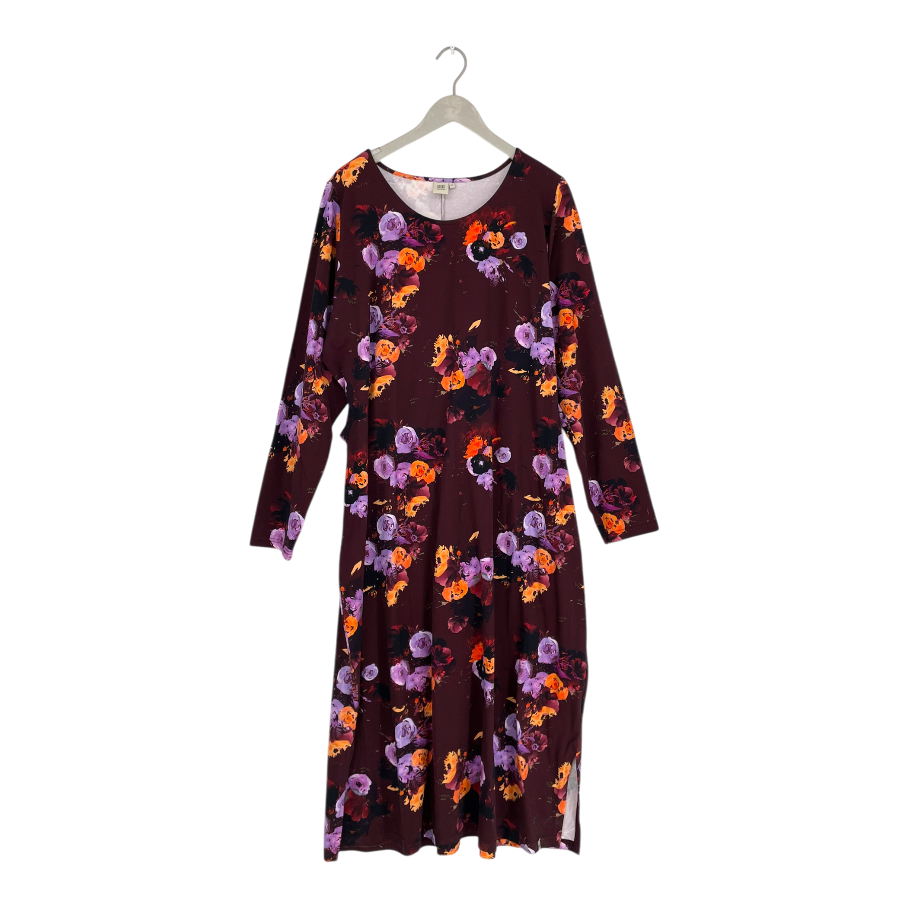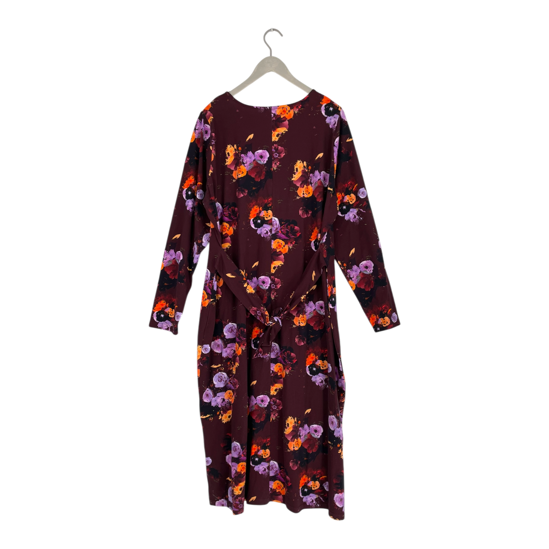 Kaiko belted dress in ruby rose print has a slim, figure-hugging fit. Wide ribbons at the waist can be tied at the front or back. The dress has a rounded neckline and long sleeves.