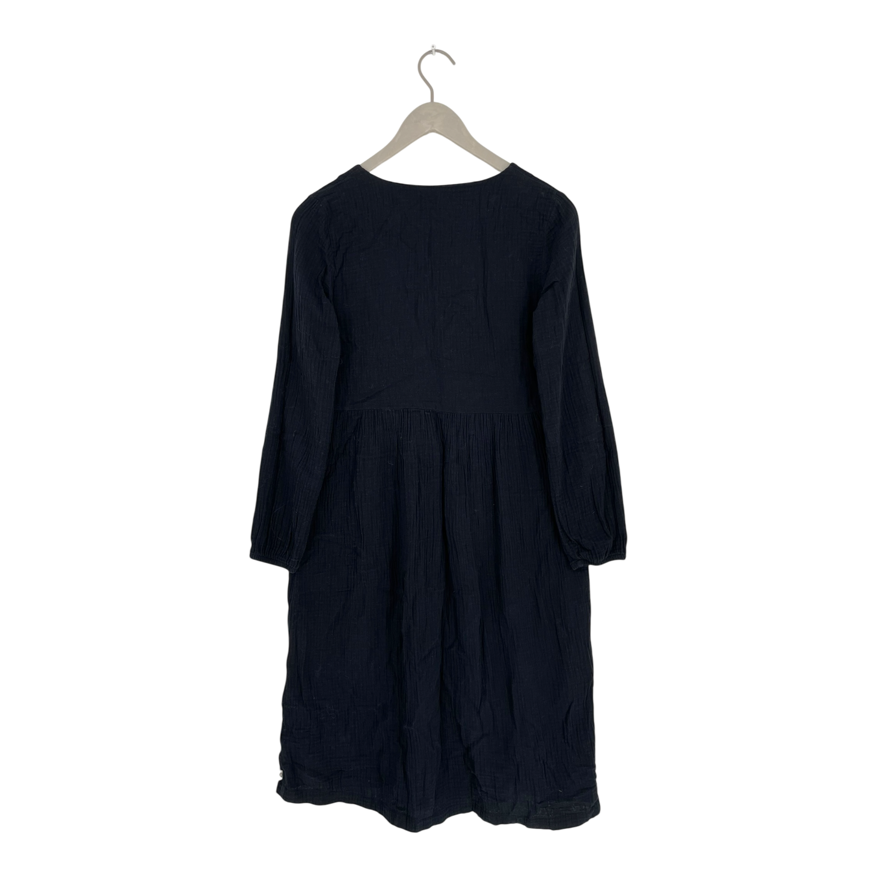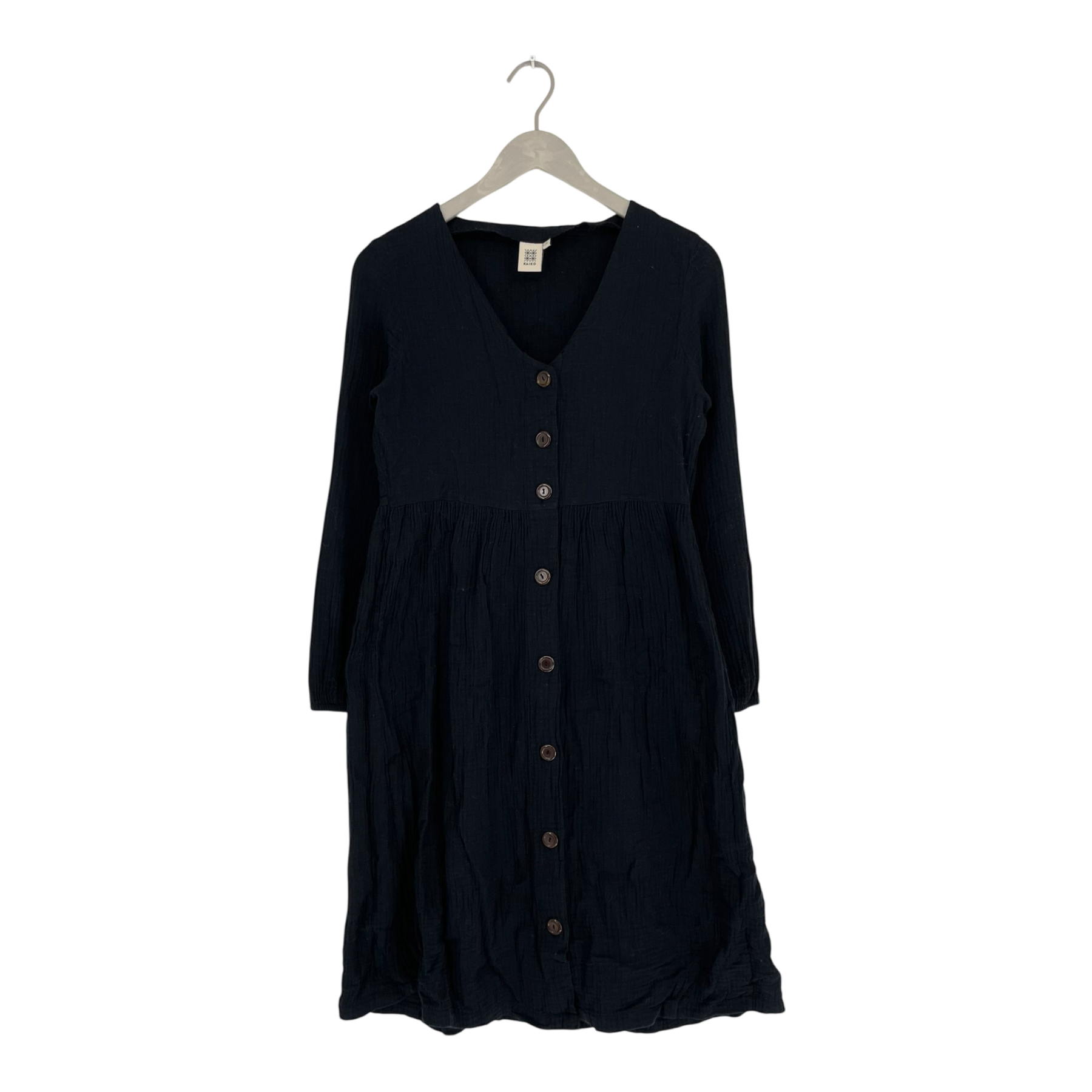 Kaiko button dress with button closure. The bodice is sewn with a princess seam, and the hem is slightly gathered on the waist. An elastic band gathers the cuffs.