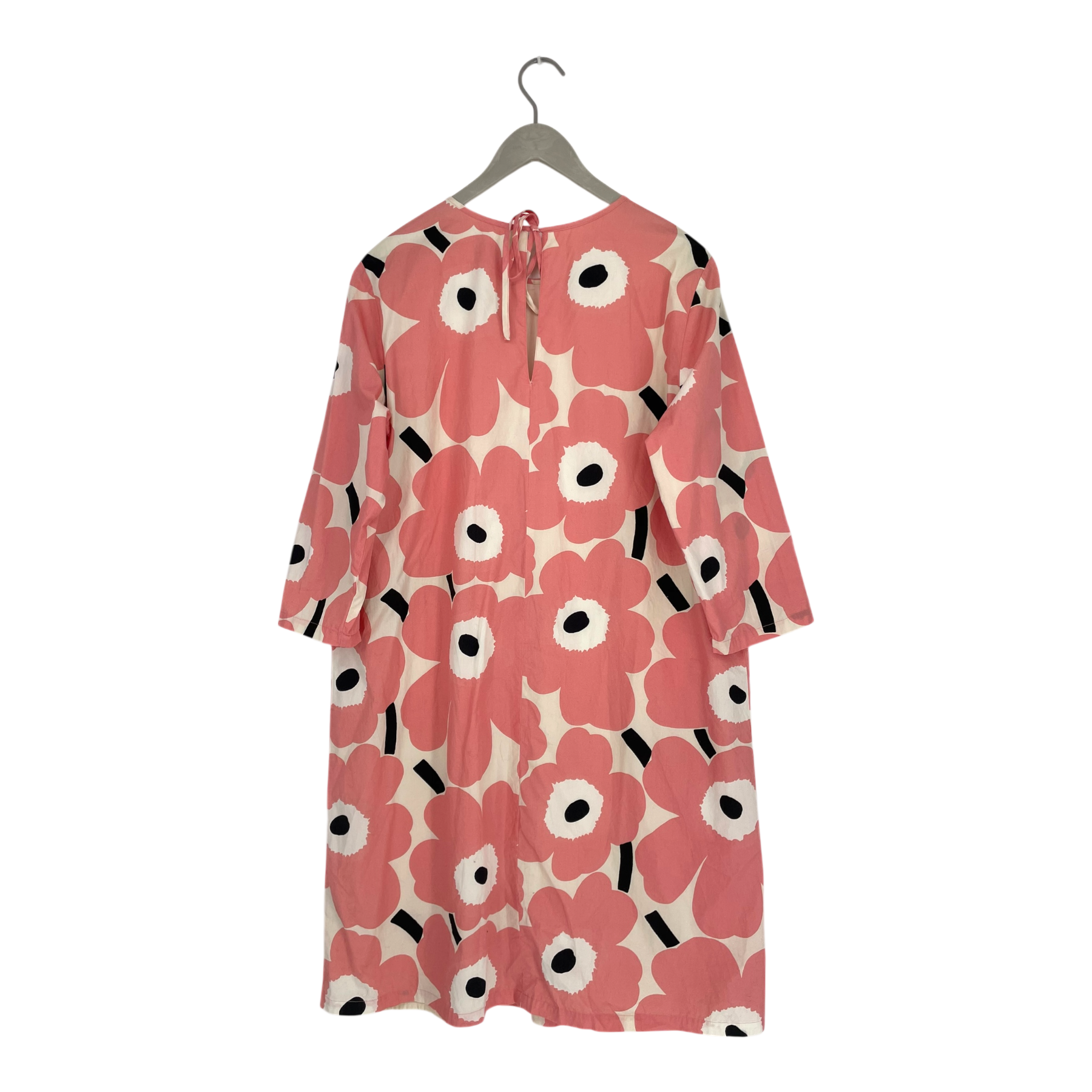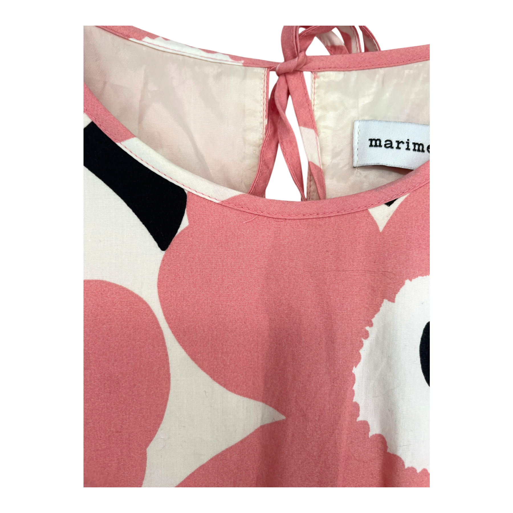 Marimekko lined Havaittu dress with a round neckline, half sleeves and a ribbon closure on the back. The item has a small run of thread on the neckline.