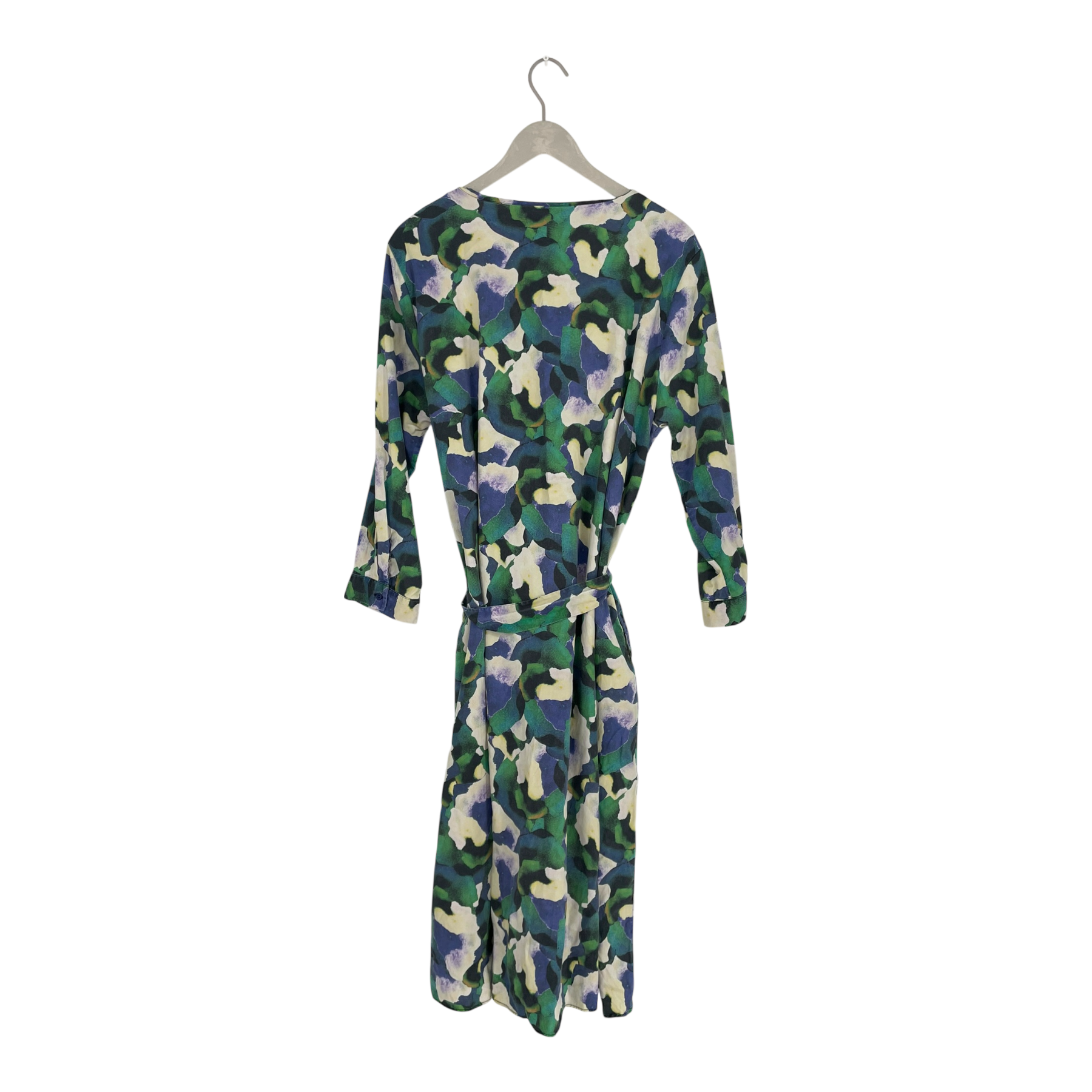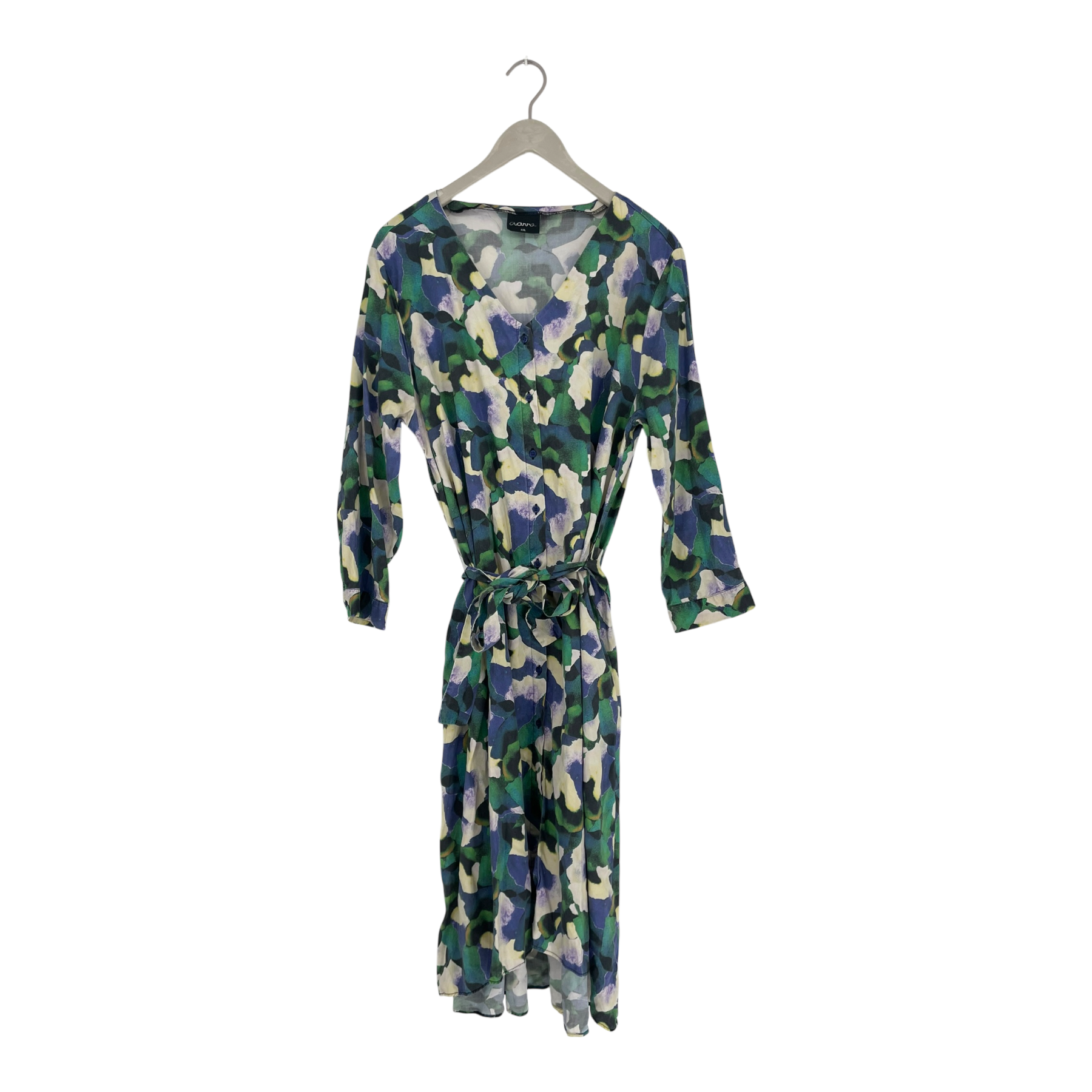 Aarre dress with an abstract painterly print. This midi dress features a V-neck, a button-down front, 2/3 sleeves, and a removable tie-belt for a defined waist.