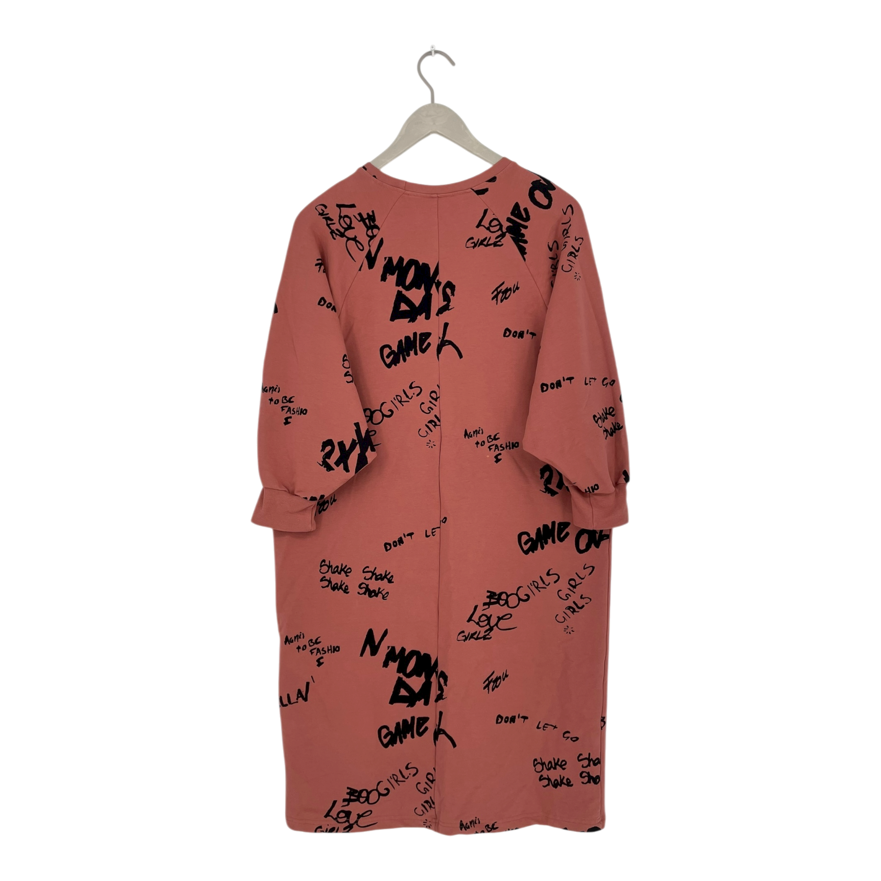 Aarre women's sweat dress in a dusky rose color and text print. Loose fit dropped sleeves. The item has a run of thread and one stain that appears to be easily removable, as shown in the pictures.