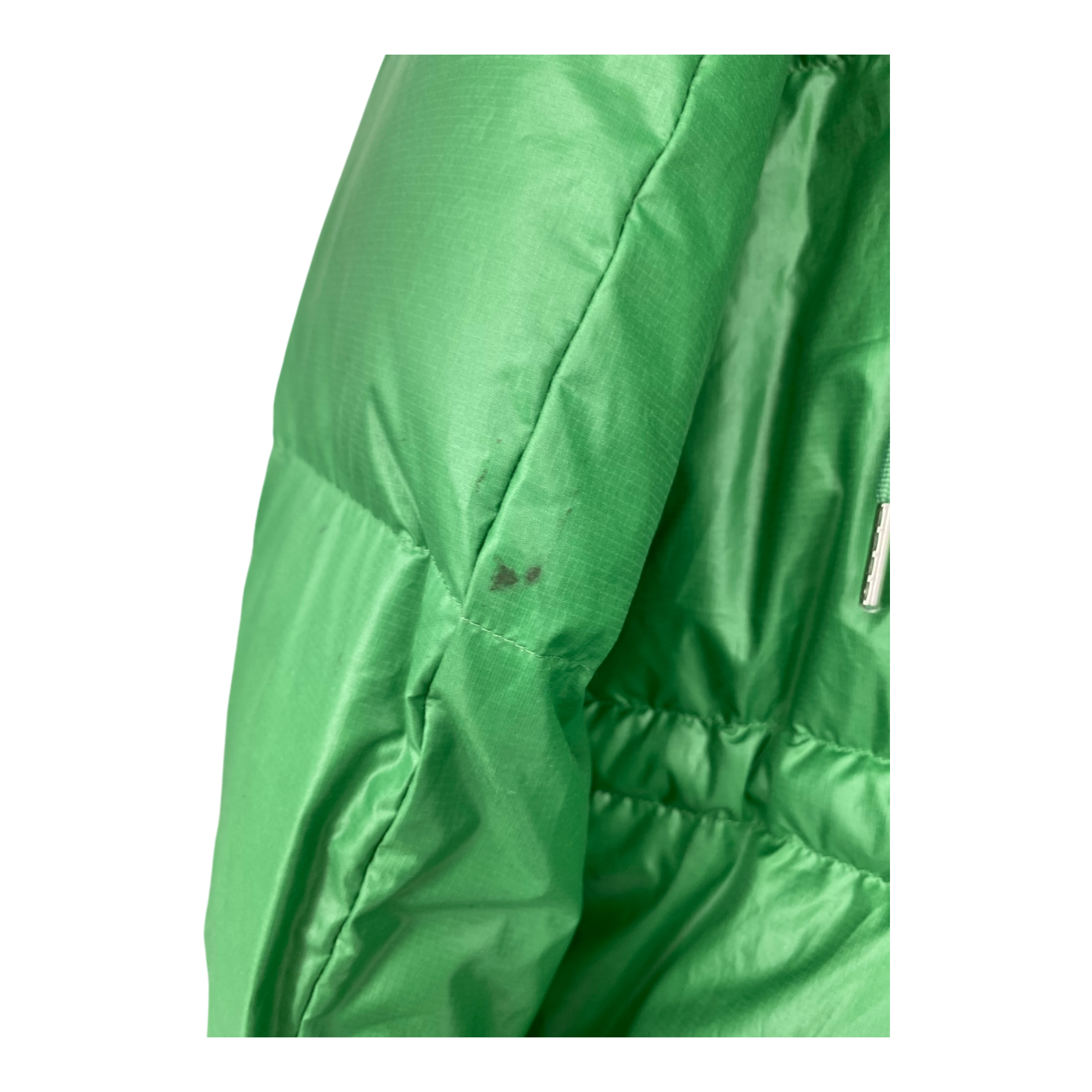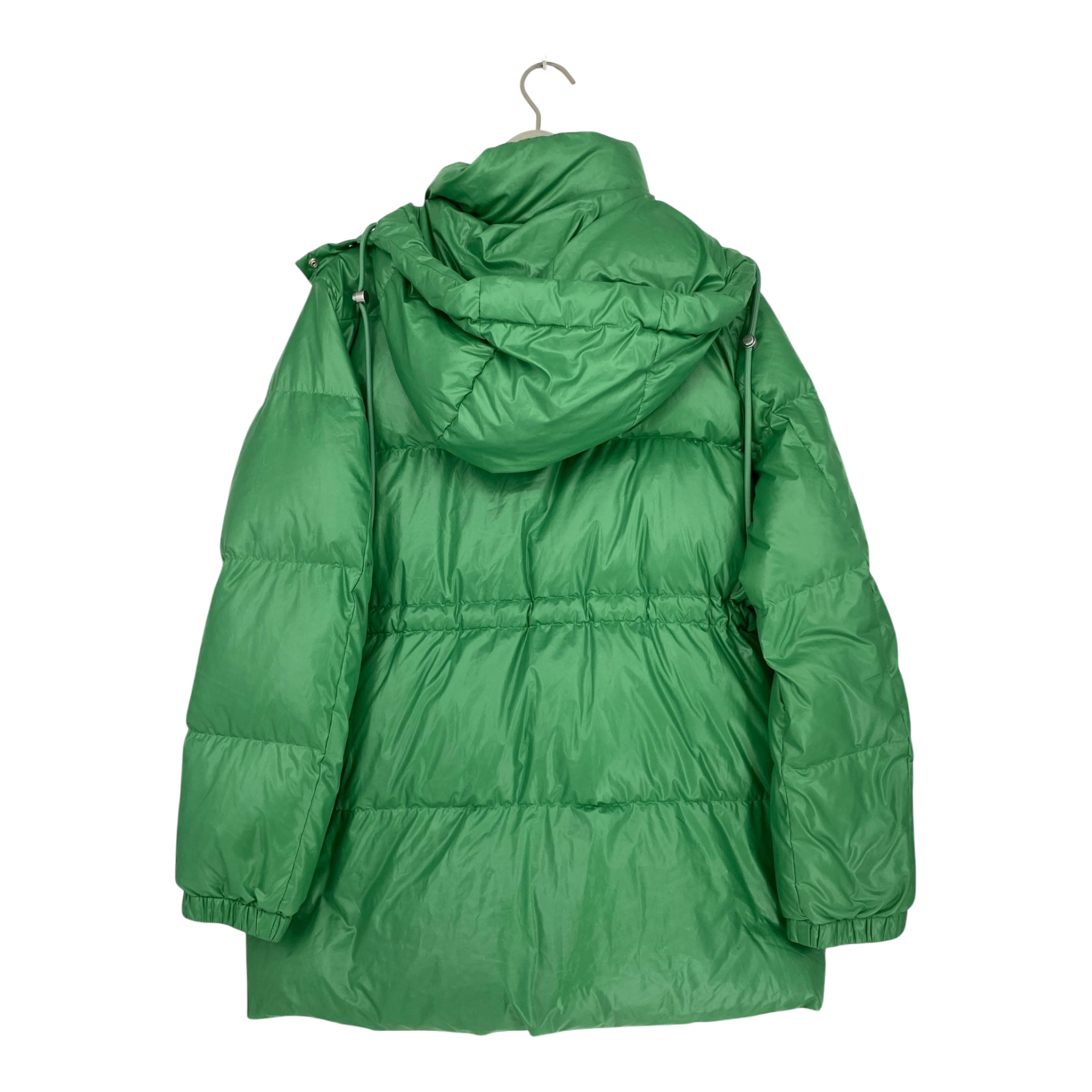 The Arket down puffer jacket gives a distinct shape and is ideal for stylish and warm winter looks. The jacket has full zipper closure, removable hood with string tightening and snap closure, string tightening on waist, two open front pockets and one inner breast pocket with zipper. The jacket is made fully from recycled down and feathers. The item has one visible stain, as shown in the pictures, but is otherwise in very good condition.