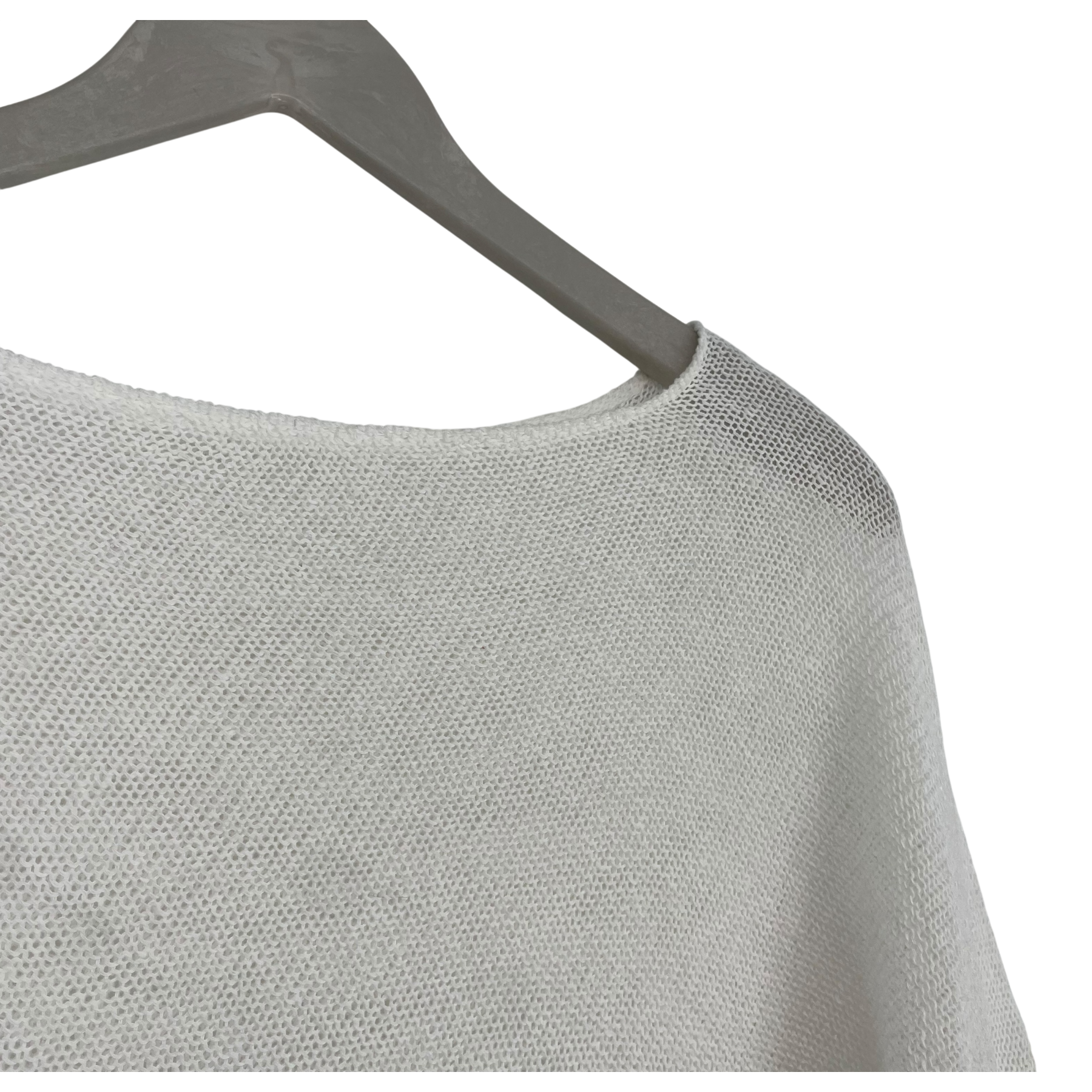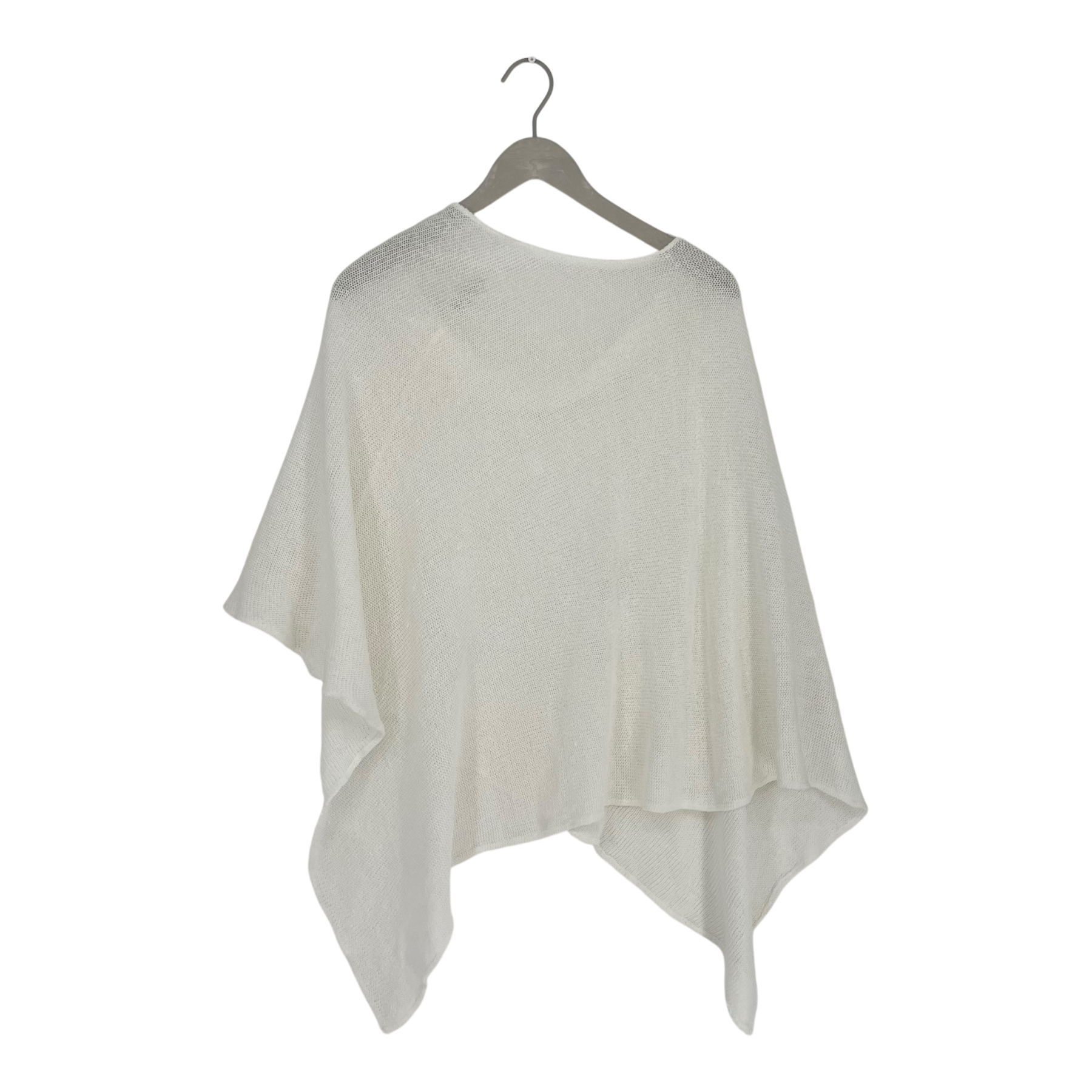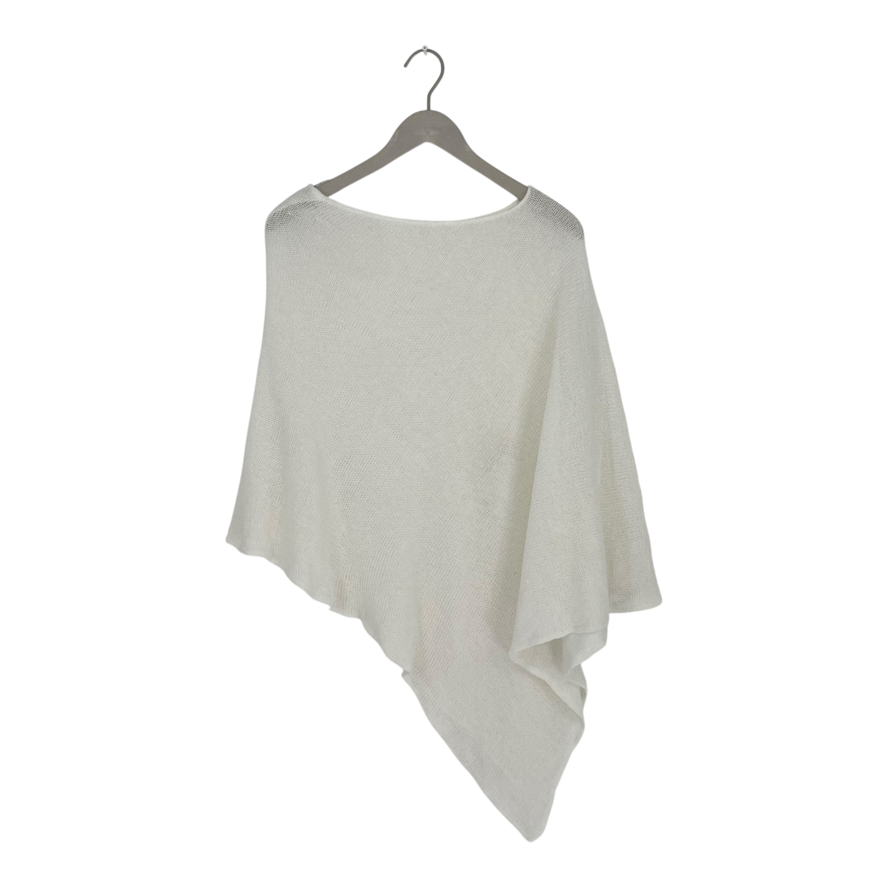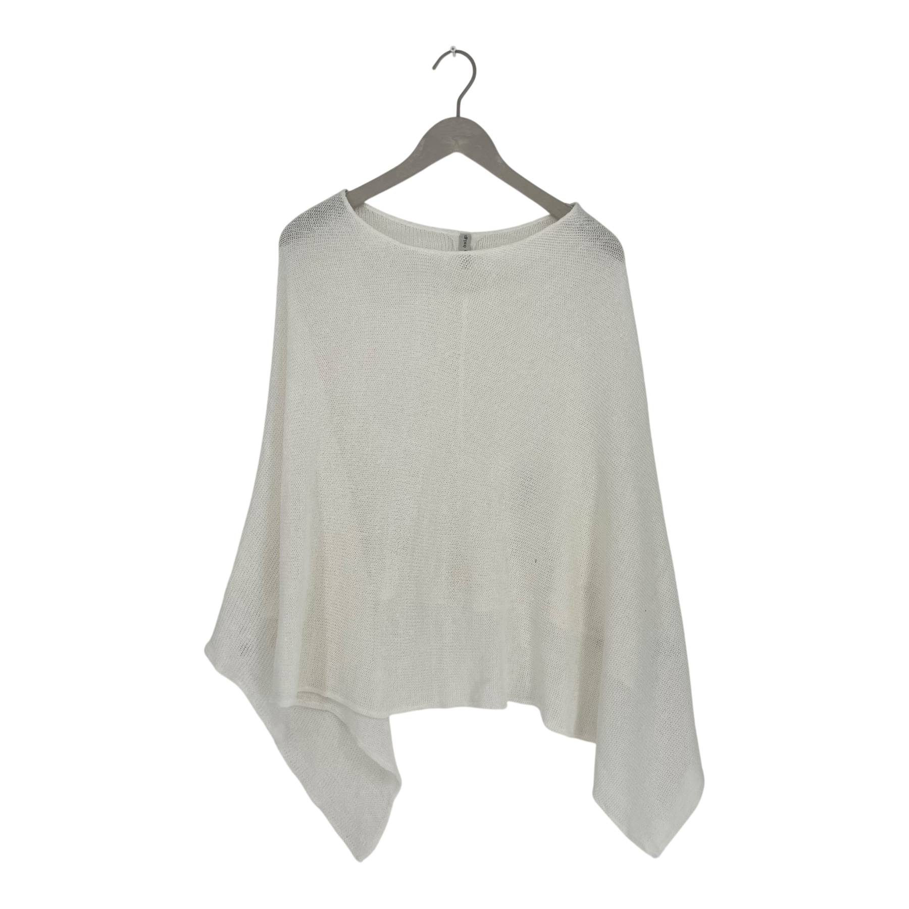 Bypias fine knit poncho. This piece features a loose, open-knit construction, a wide boat neckline, and an asymmetrical hemline that creates a cascading drape.It can be worn so, that the longer sides come on the front or that the longer sides are on top of the arms.
