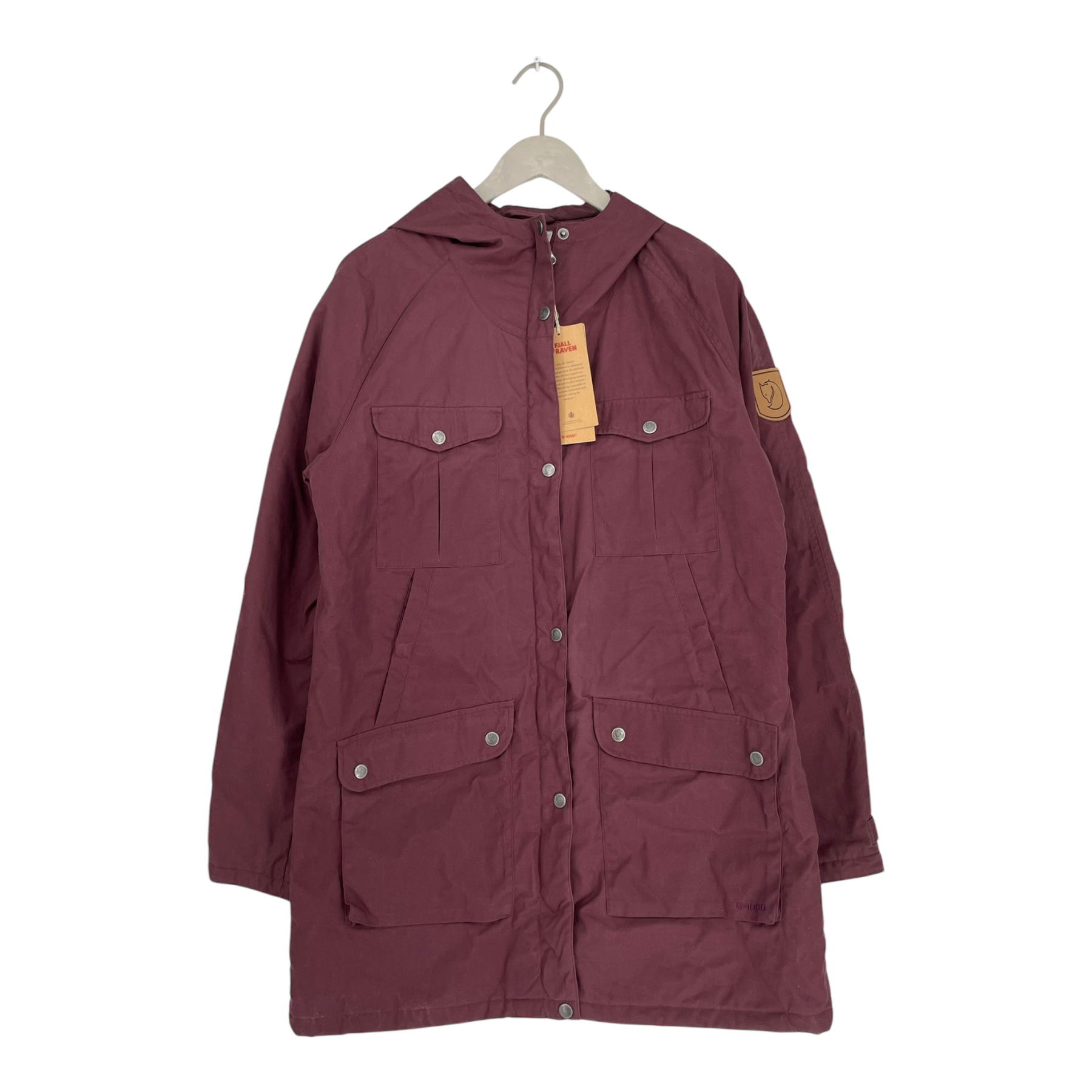 Fjällräven women's Greenland G-1000 parka jacket with seven pockets, a leather Fjällräven logo on the sleeve, a hood and string tightening on waist. The hood is not removable. There is a quilted lining on the inside. The item appears unused, the product tags are still attached. The item has some dust marks from storage, but they are removable with a brushing.