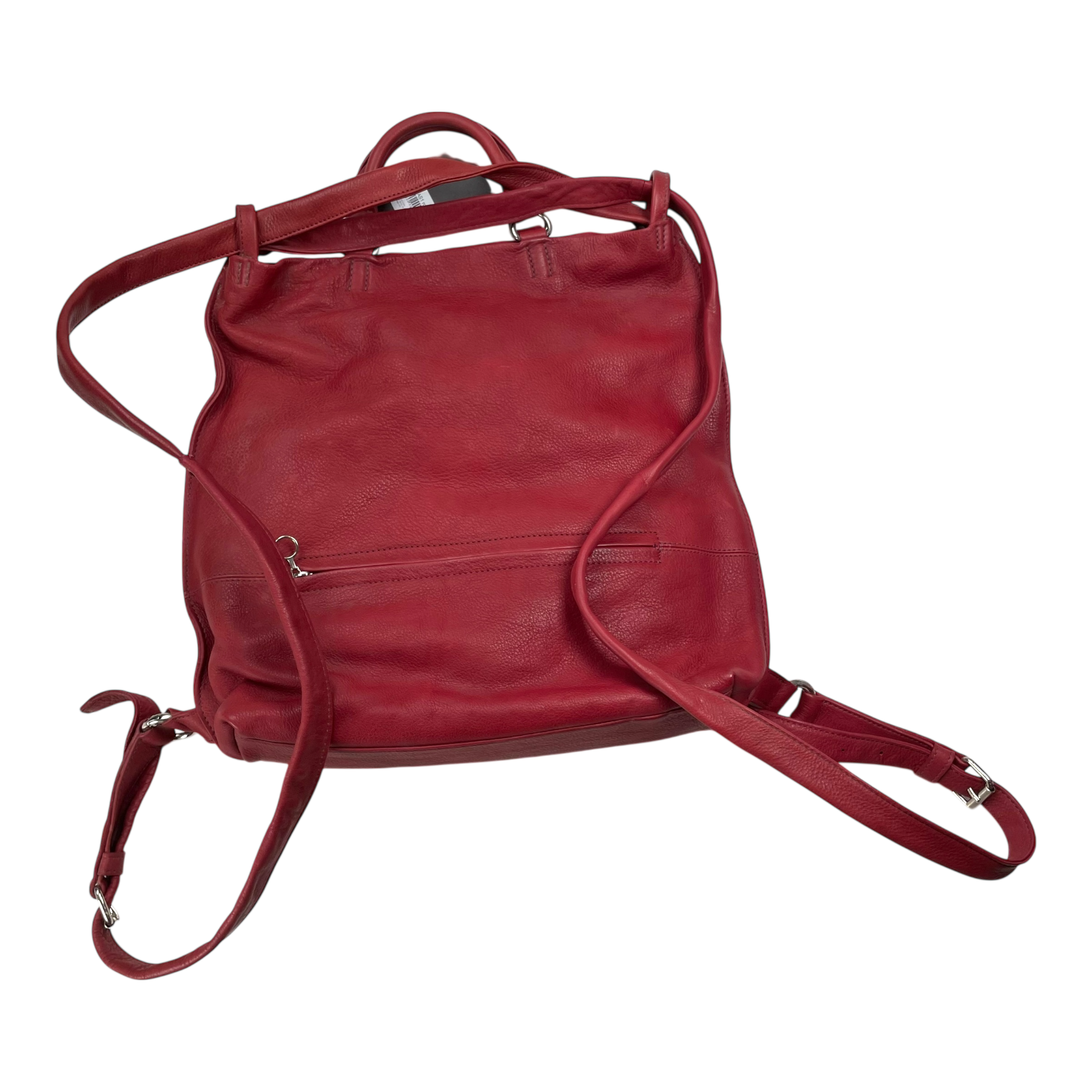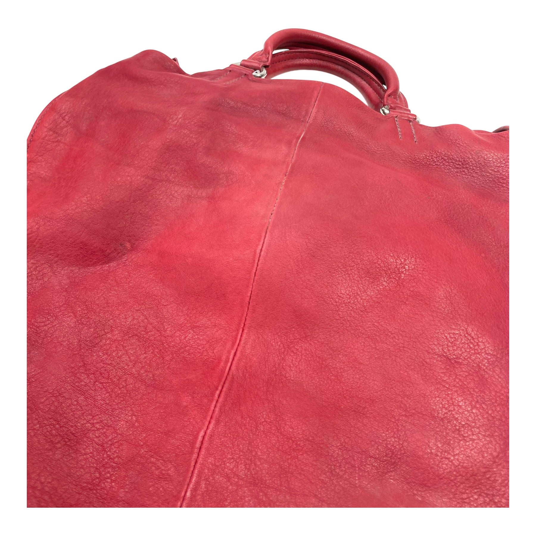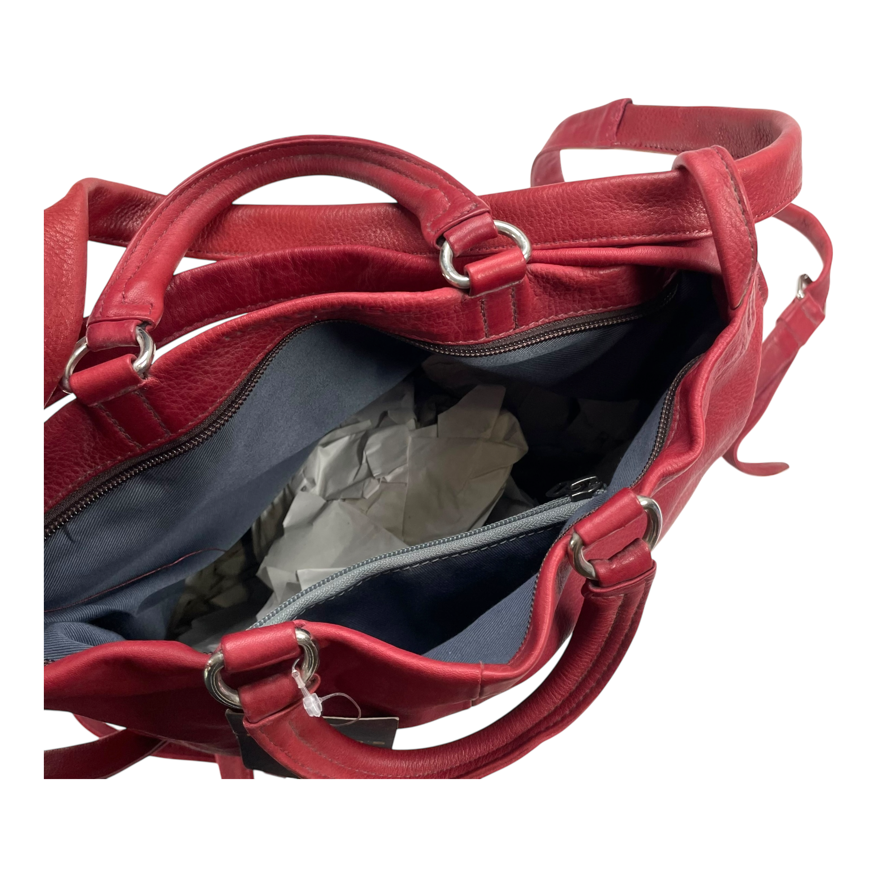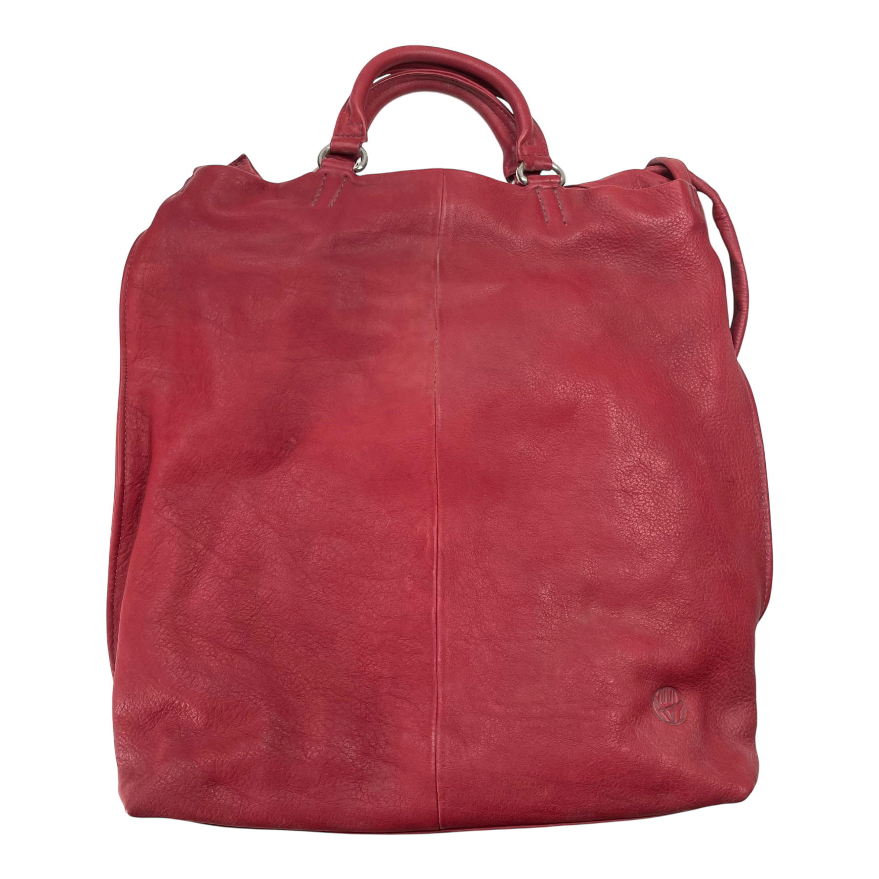 Harold's Bags leather bag can be worn as a shoulder bag or a backpack. The bag has two handles and adjustable and removable straps that can be worn on the shoulder or on the back. There is one zippered main compartment and on zippered pocket on the back.