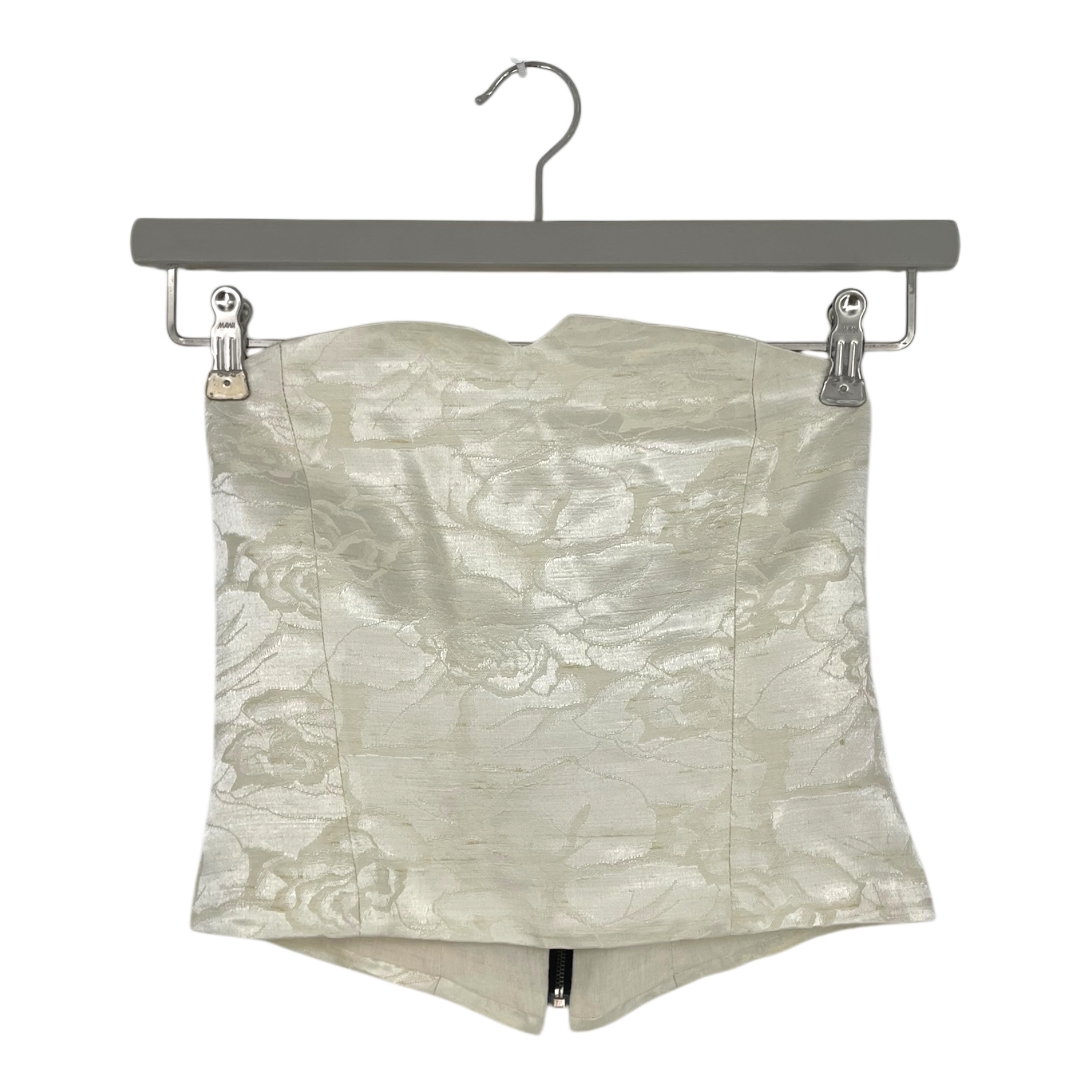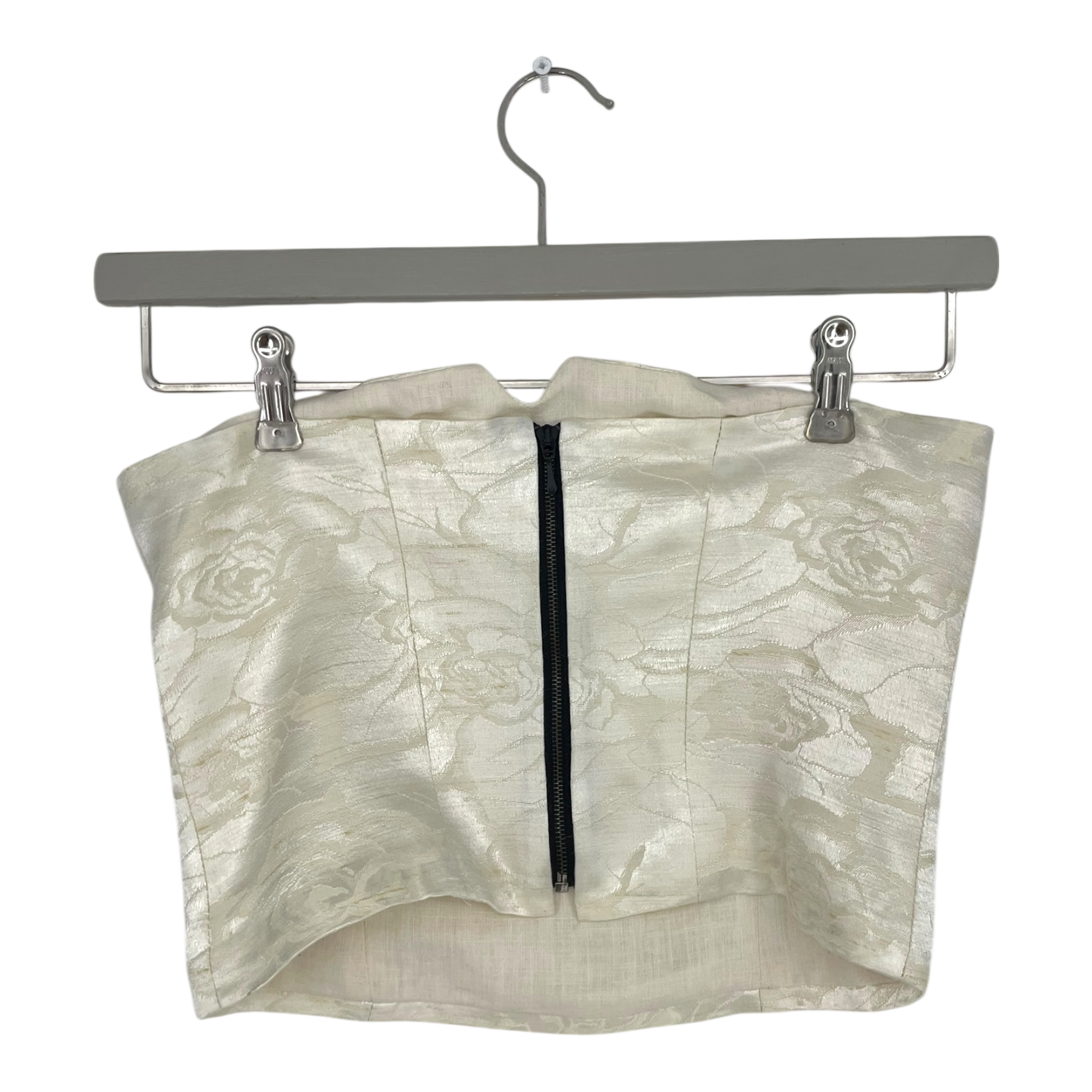 Lovia bandeau top with zipper closure in woven rose pattern. Lined. This product is a sample.
