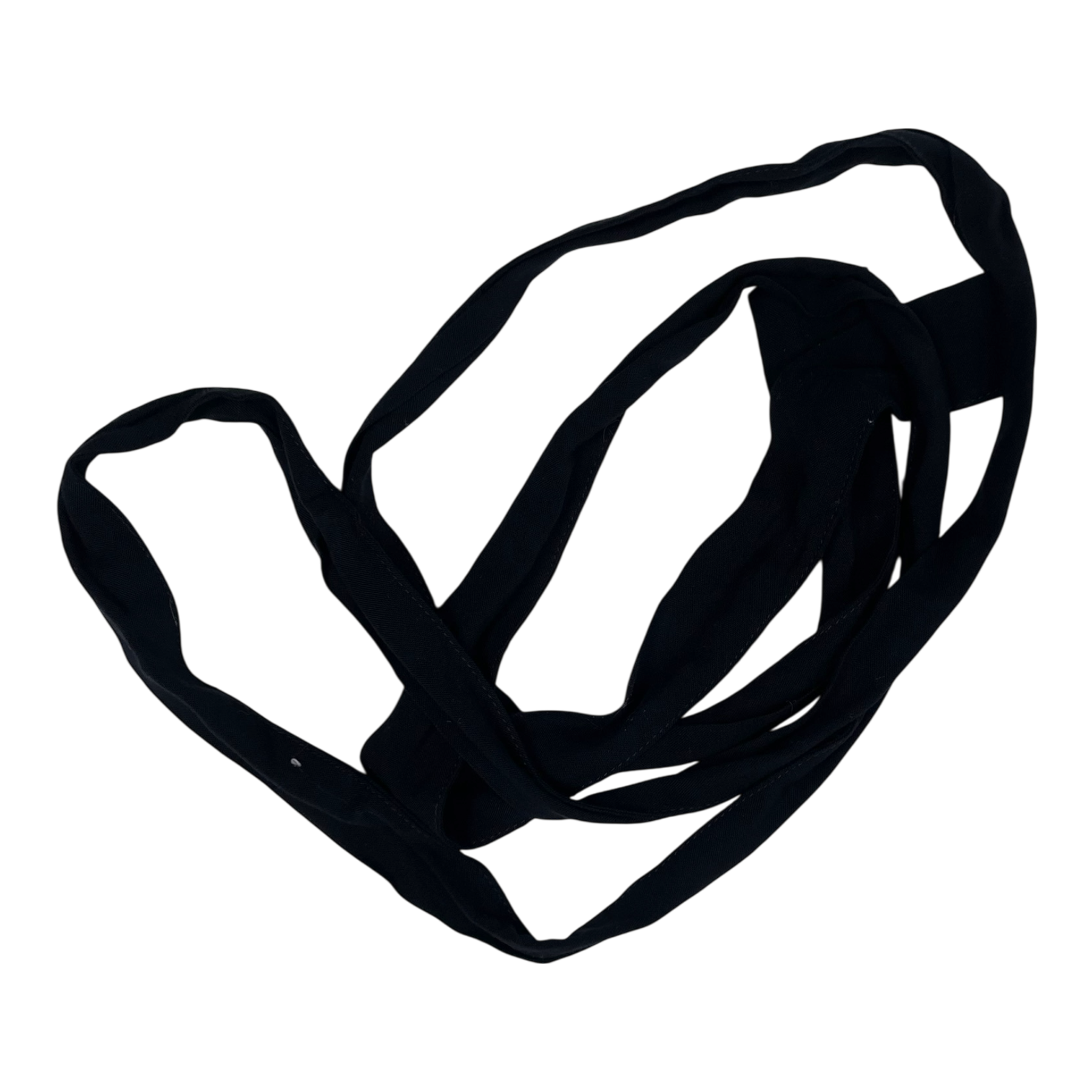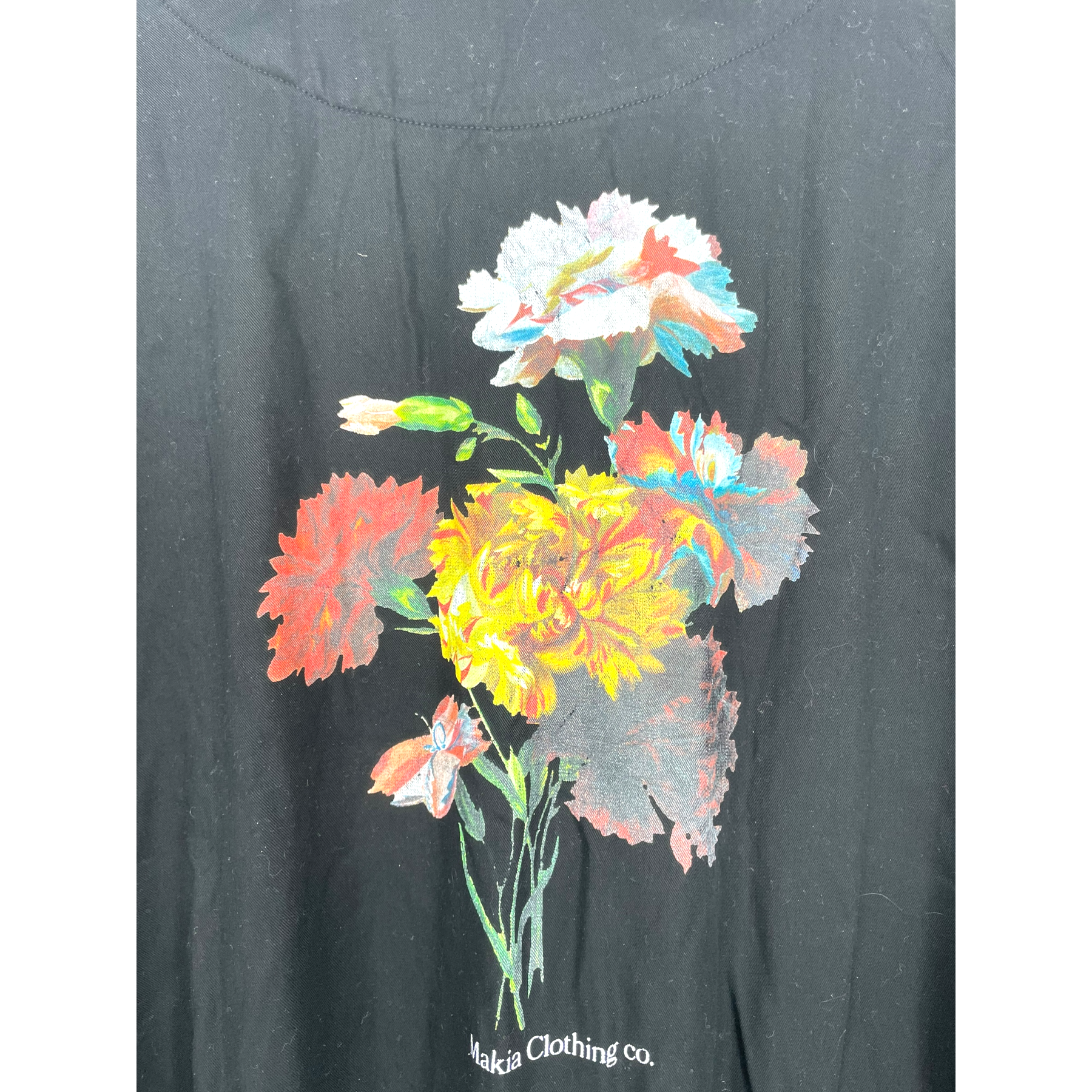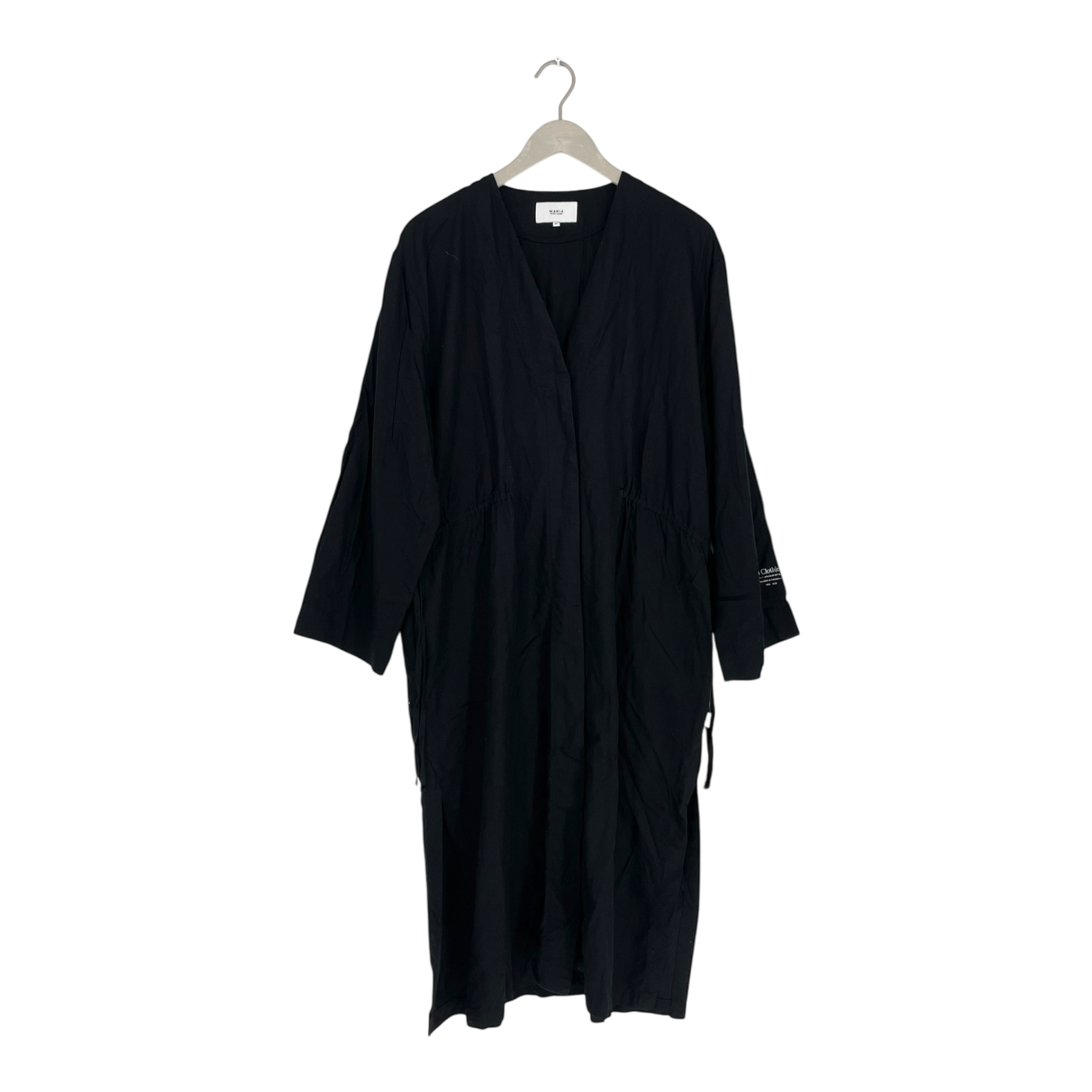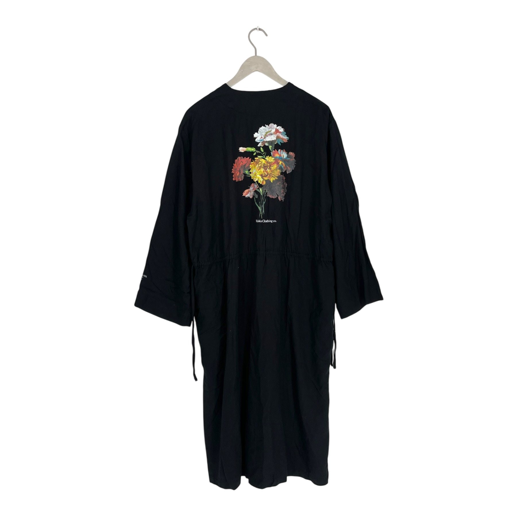 Makia black dress with a floral back print, matching fabric belt, and adjustable drawstrings.