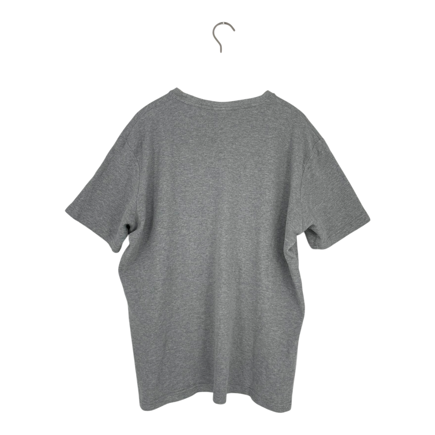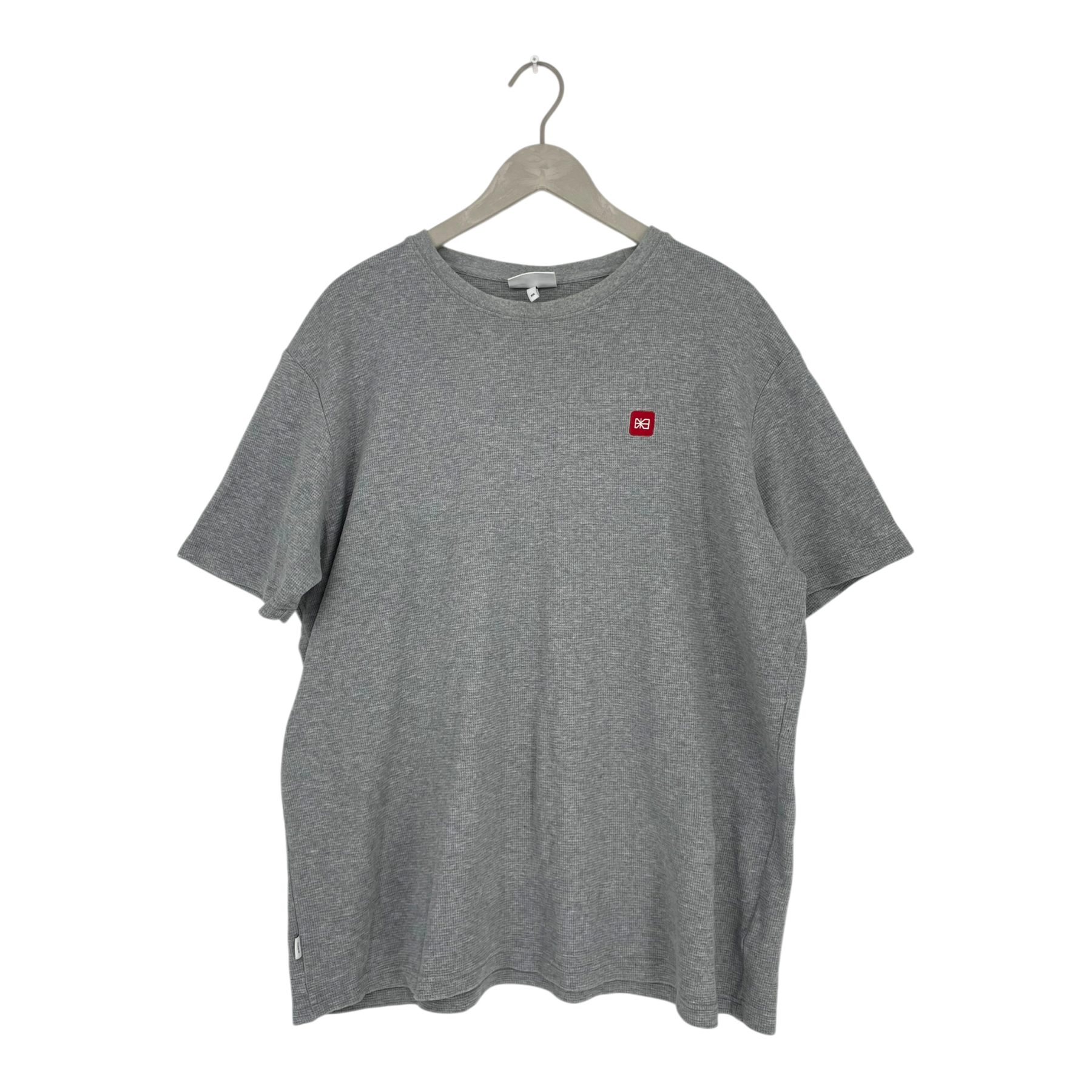 Makia t-shirt in small waffle fabric with a red logo on the chest. The neckline has some light wear to it.