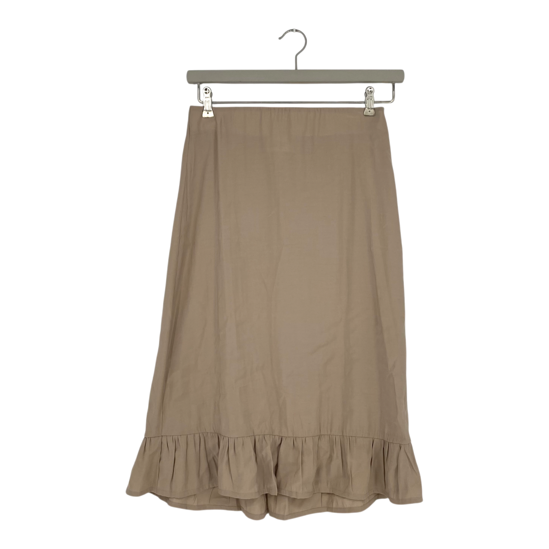 Makia skirt is flowy with a ruffle hem detail. Hidden zipper on side and hidden elastic band on waist. Unlined.