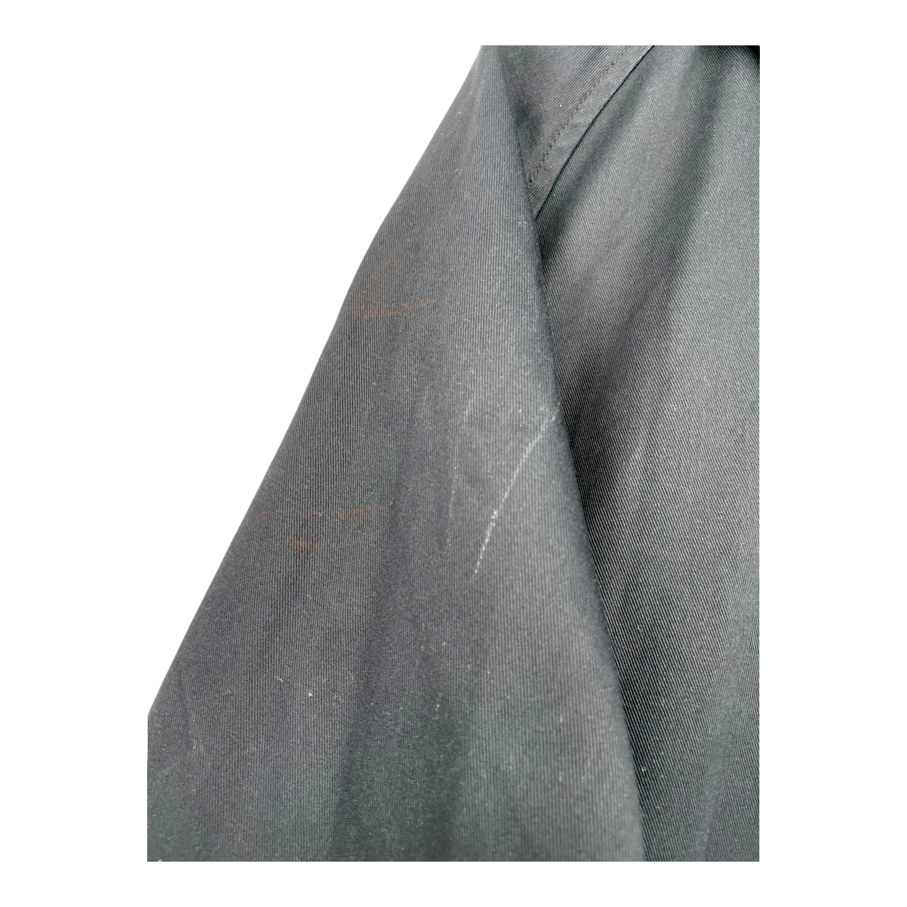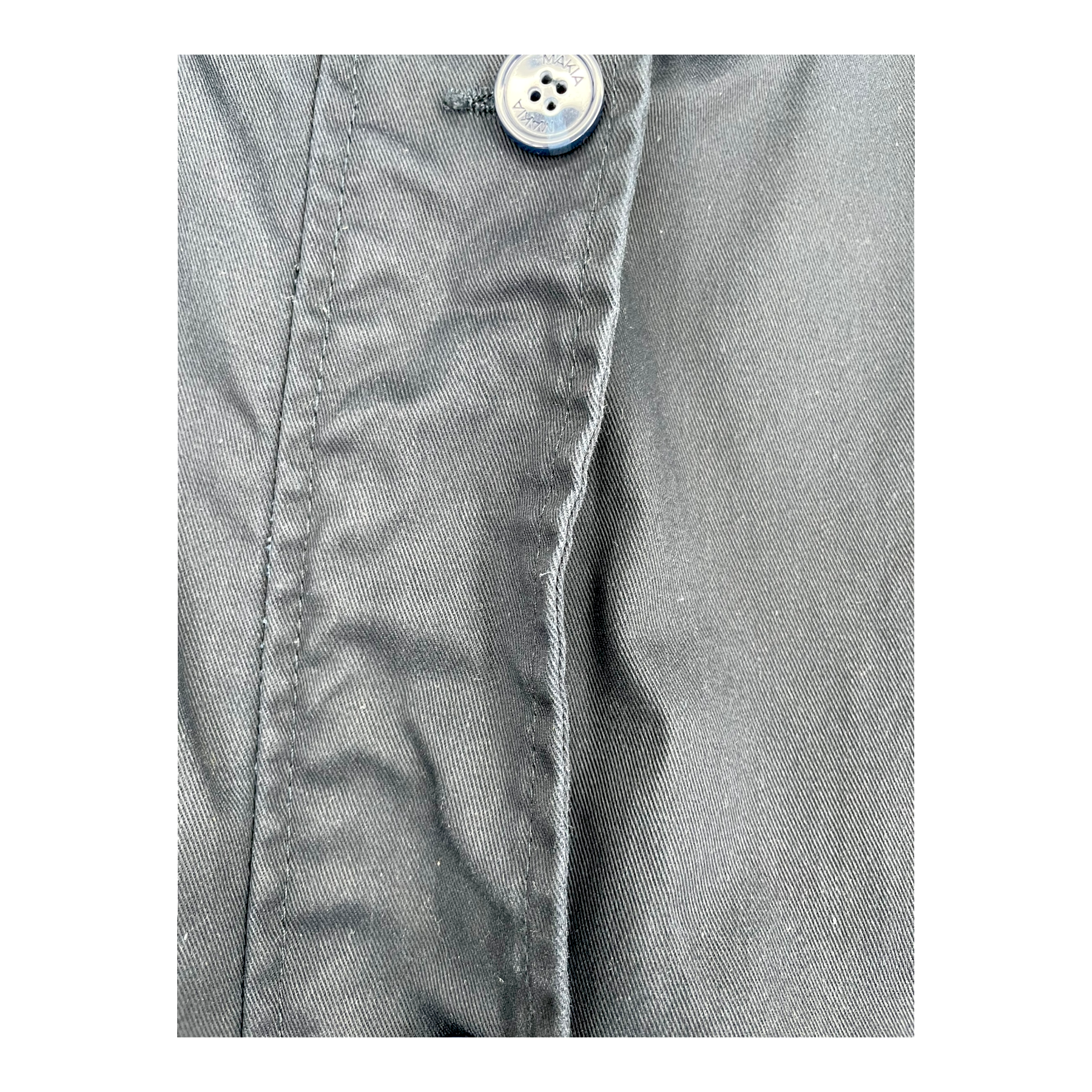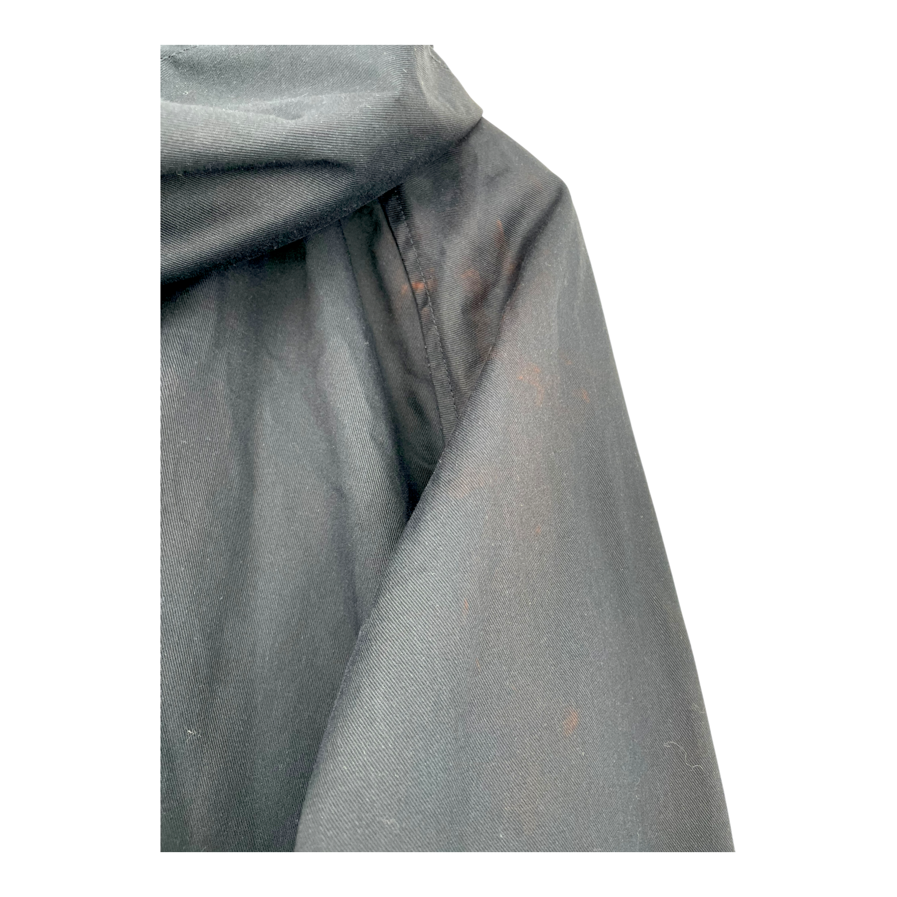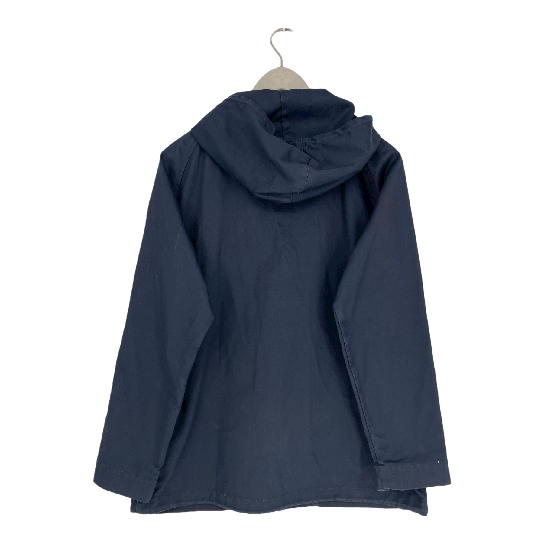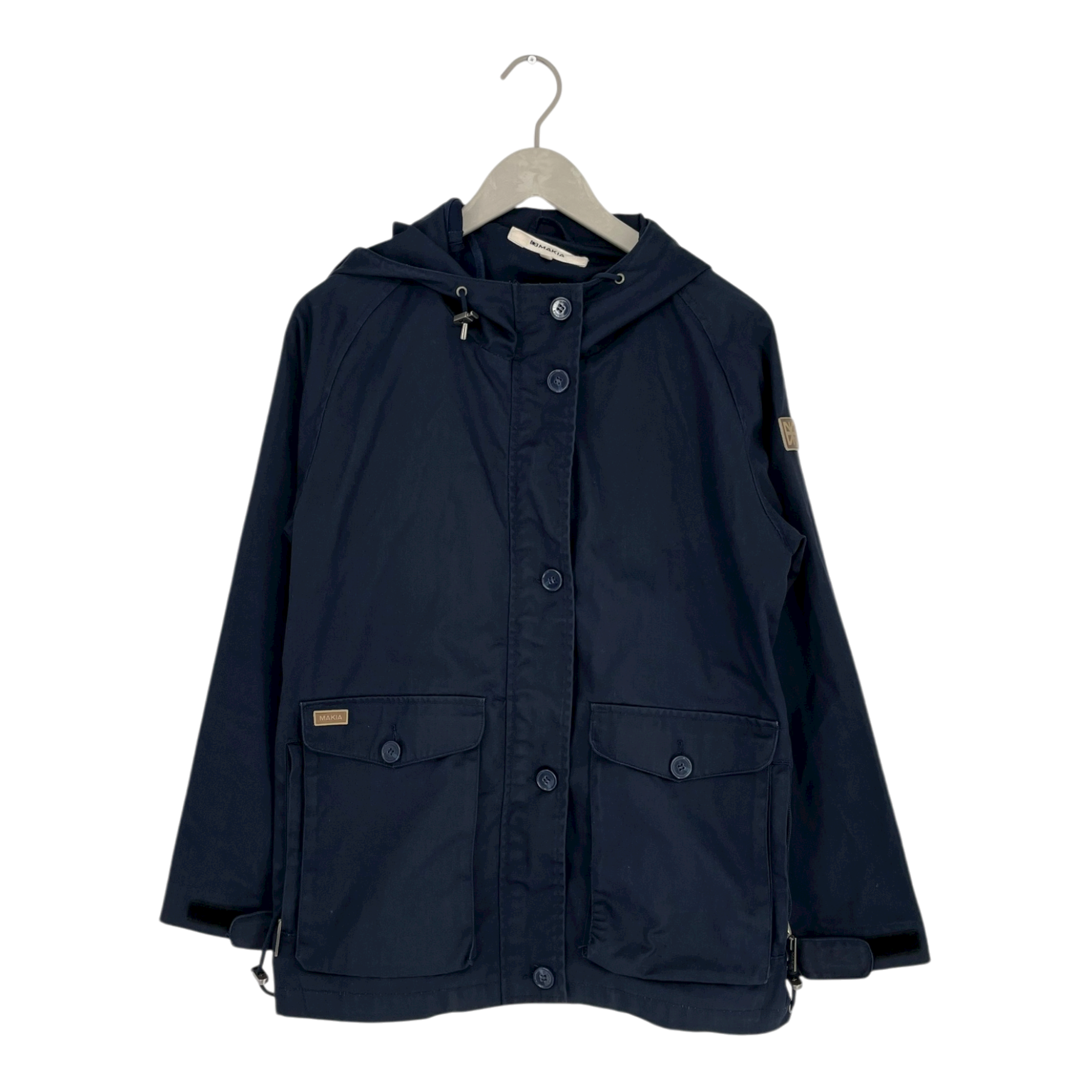 Makia midseason jacket with wide hood, drawstring tightening on hem, buttoned wind flap and two pockets on front. The item has a large stain on the right arm and some wear on the fabric, as shown in the pictures.