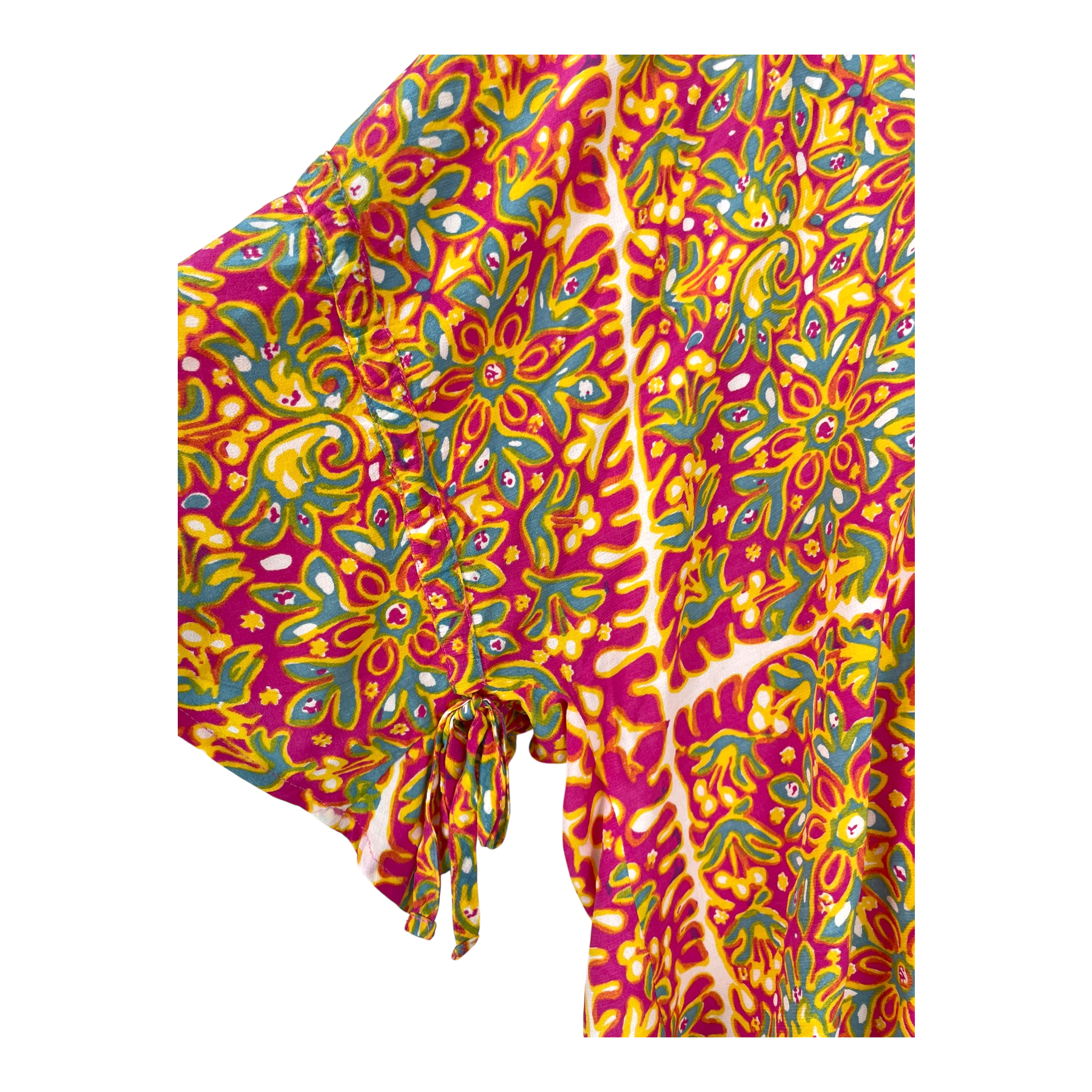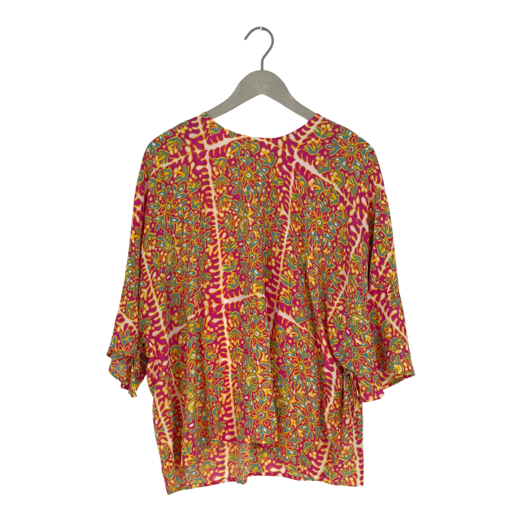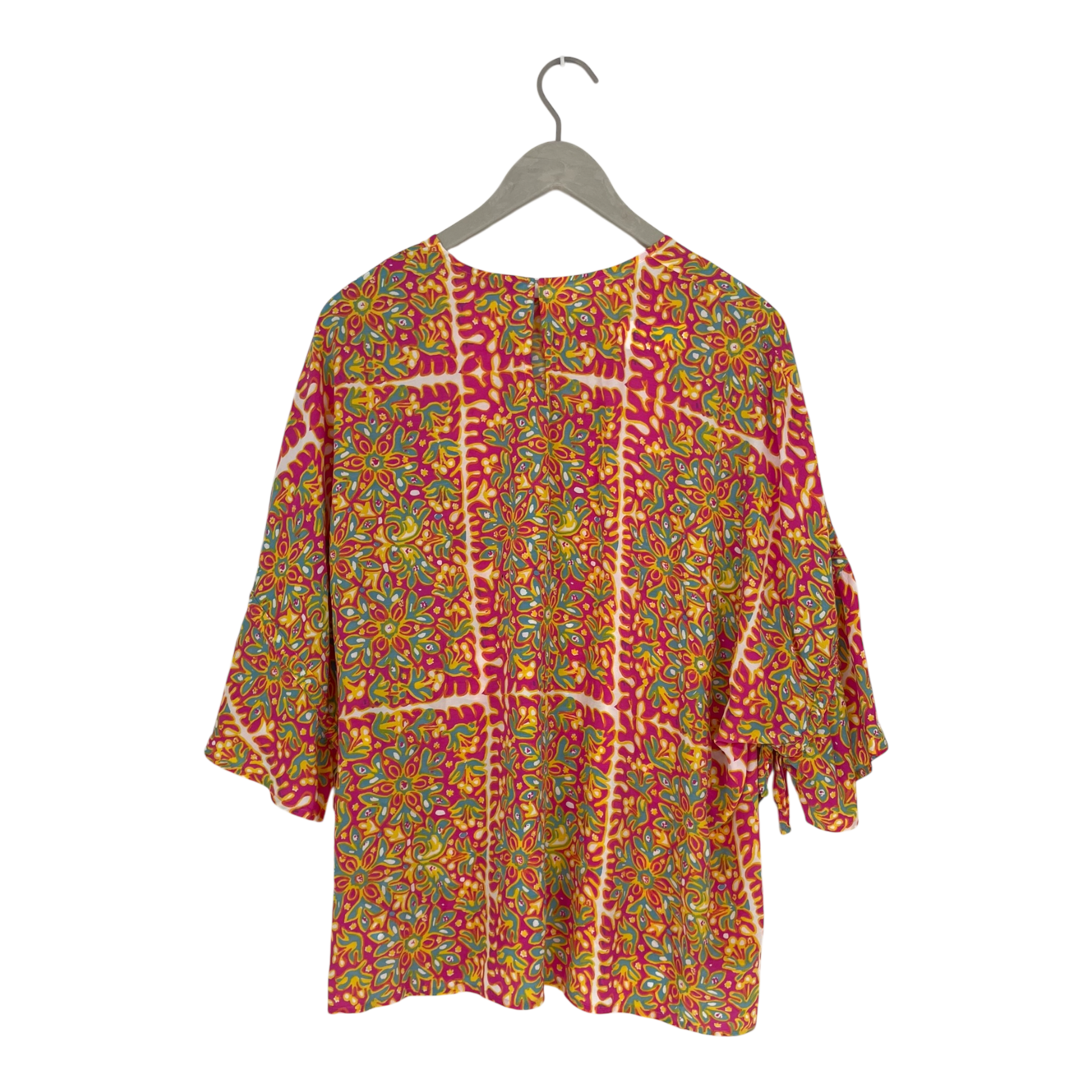 Marimekko Jade flowy viscose shirt with metal clasp closure and 3/4 sleeves with string fastening in the bright and retro Simbad print of the 60s.