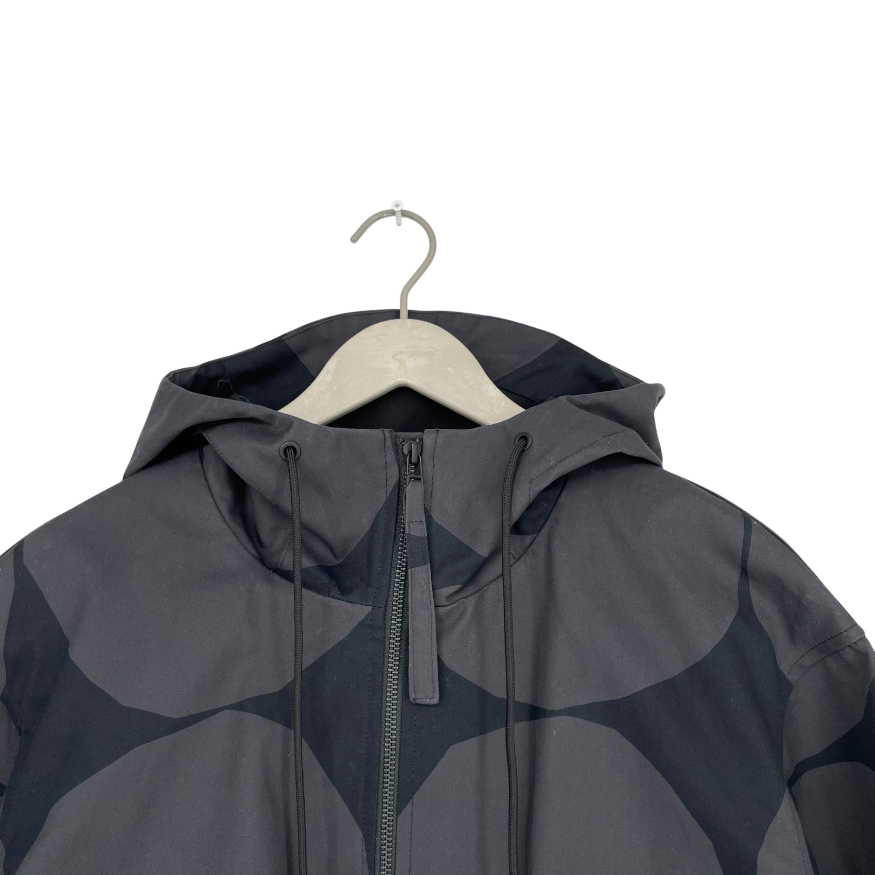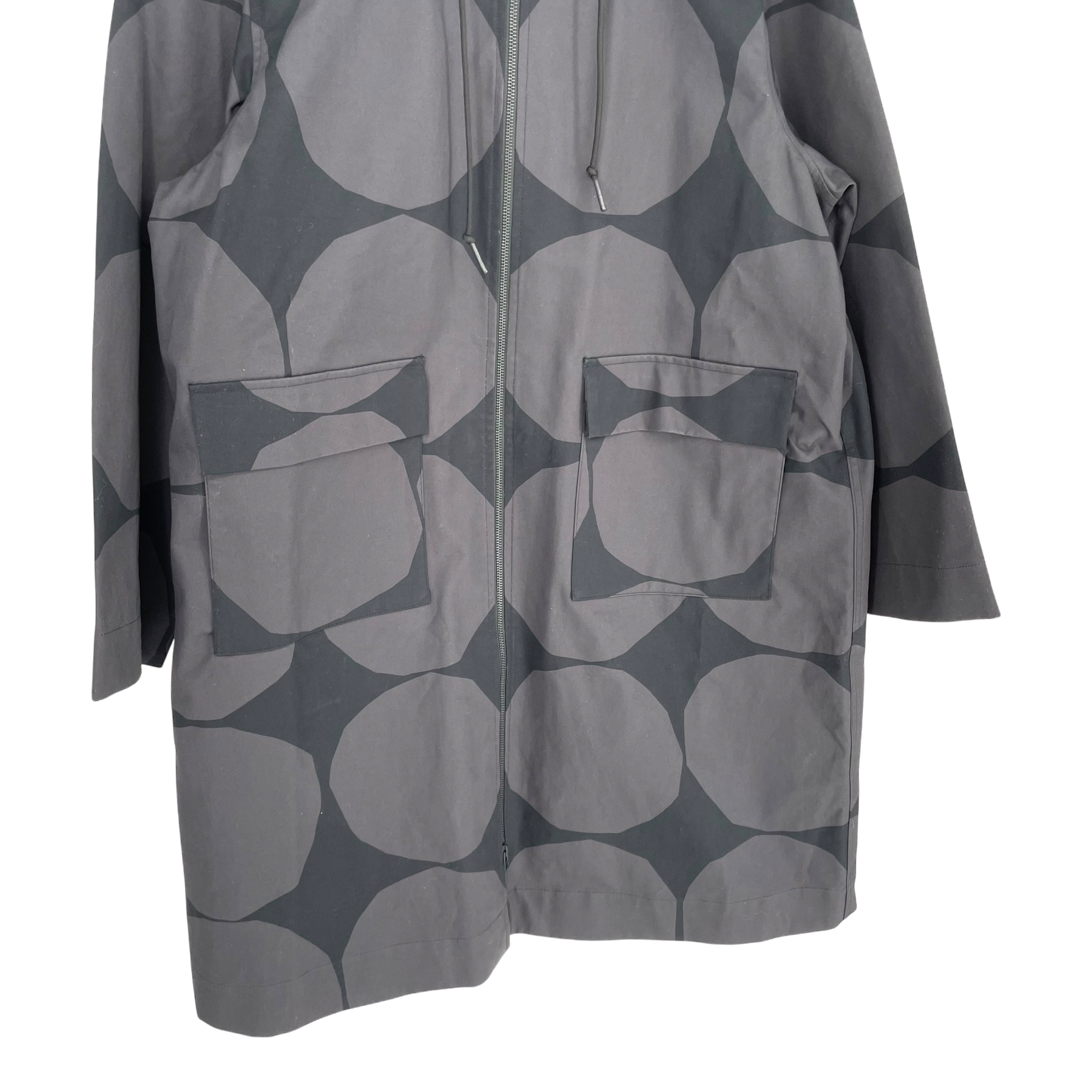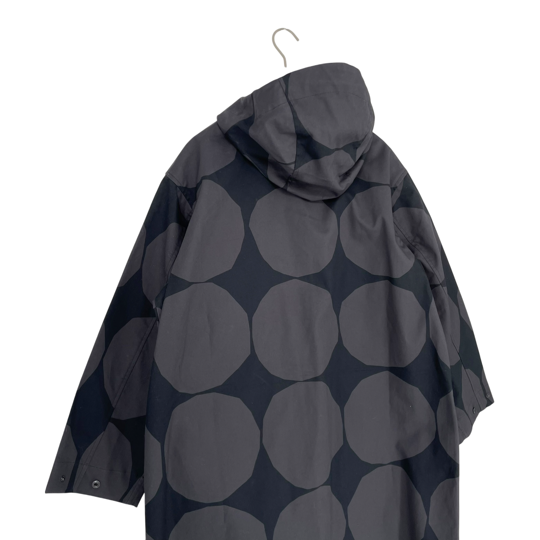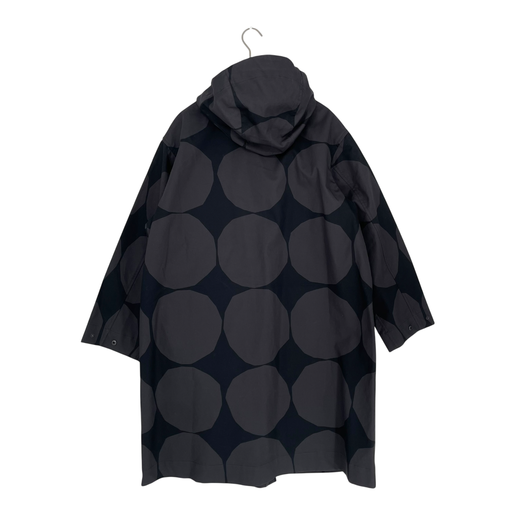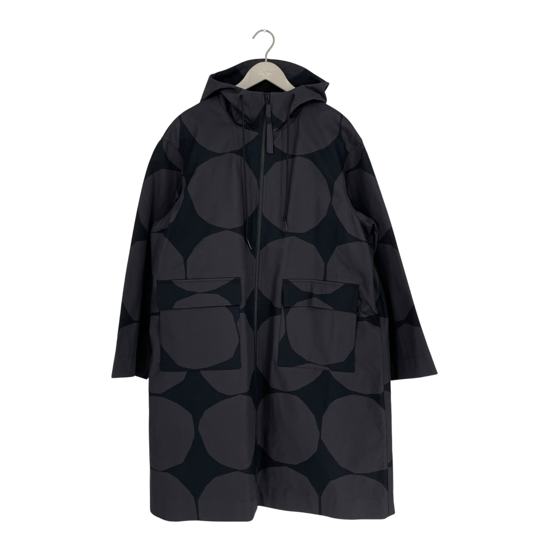 Marimekko Mangaani Kivet parka jacket. The jacket is made of thick, water-repellent cotton twill, where two layers of fabric are bonded together. The jacket has a relaxed fit, a straight cut and a Kivet pattern. The jacket has a high collar and a hood adjustable with drawstrings, a two-way metal zipper and flap pockets at the front. The cuffs have press stud fastening.