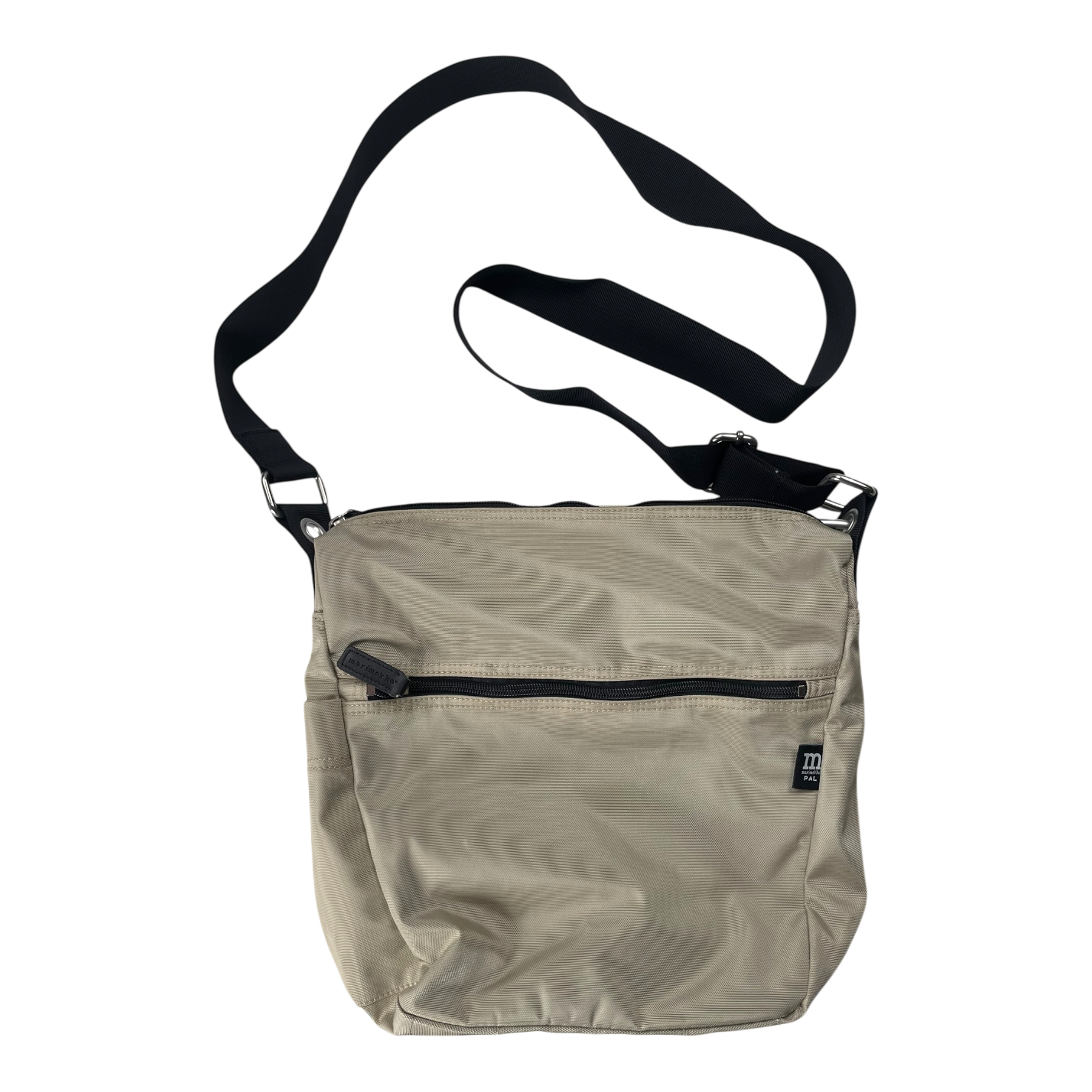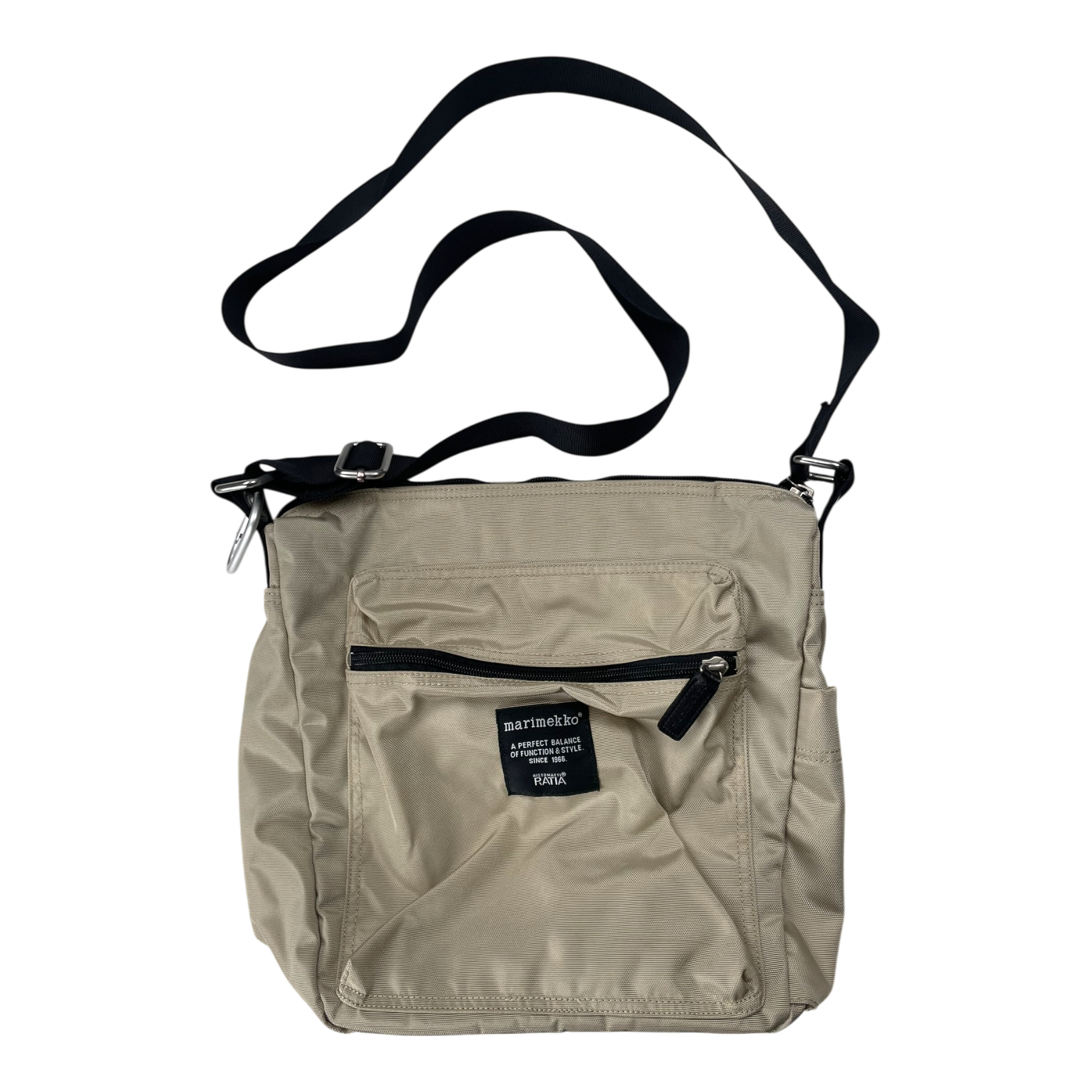 Marimekko Pal bag with an adjustable strap, one main pocket with zipper closure and a smaller inner pocket with zip closure, two outside pockets with zipper closure and one smaller open side pocket. Carabiner clip included.