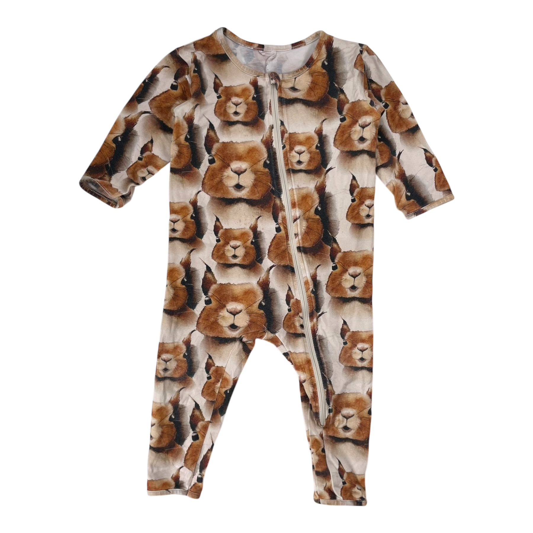 Metsola jumpsuit in squirrel print has a hood and a zipper.