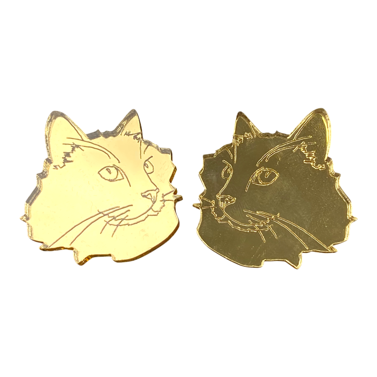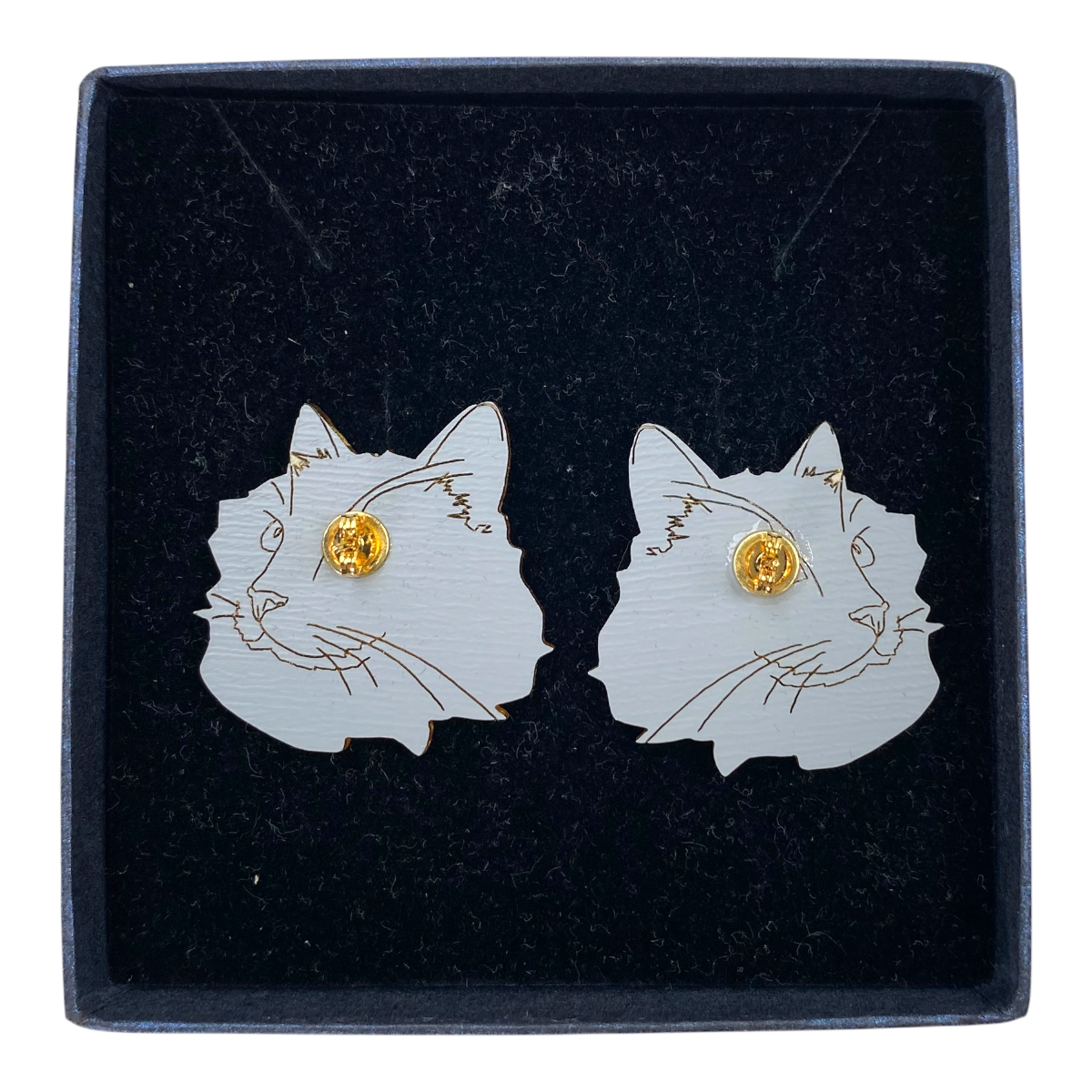 Miia Halmesmaa Kissa (Cat) earrings are made of mirror-surfaced acrylic and they are cut to shape with a laser in Helsinki, the jewelry is assembled in Turku, the pin and the clasp part of the earring are made of surgical steel.