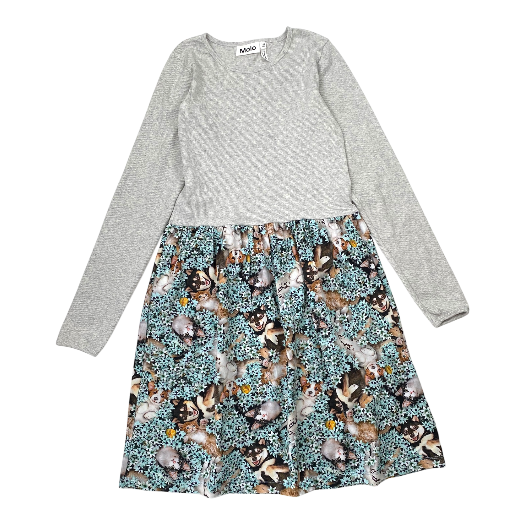 Molo credence long sleeved dress in grey with Park life print on the bottom. The top is rib-style fabric and the bottom is tricot fabric.