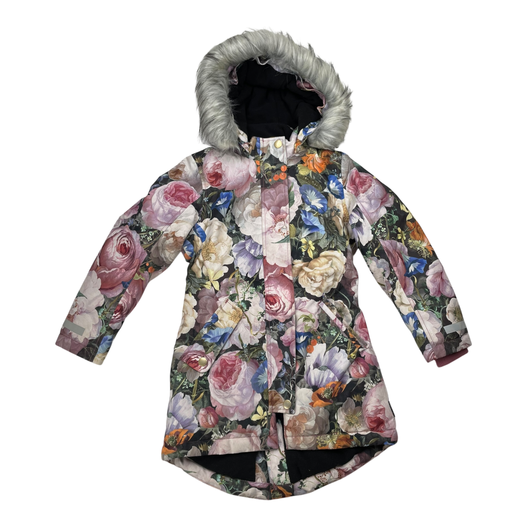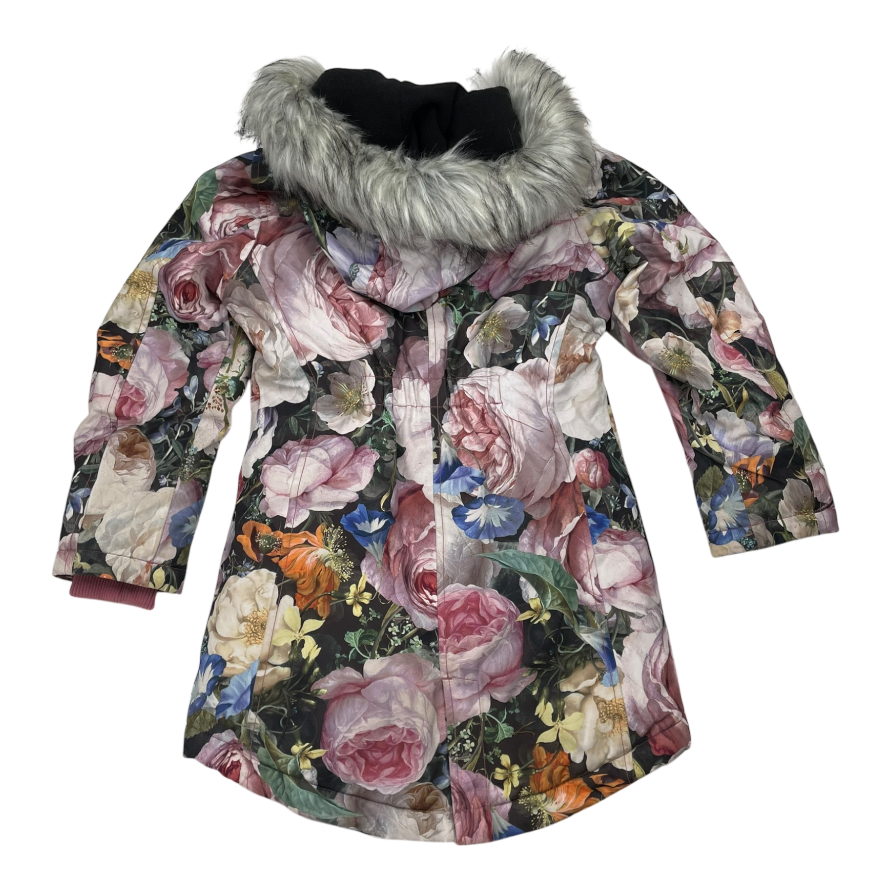 Molo Peace waterproof winter parka jacket with a detachable hood with a detachable faux fur edge, reflector, a hidden zipper with a placket, sleeve openings with a wind flap, two front pockets and an elastic at the back for a fitted shape.