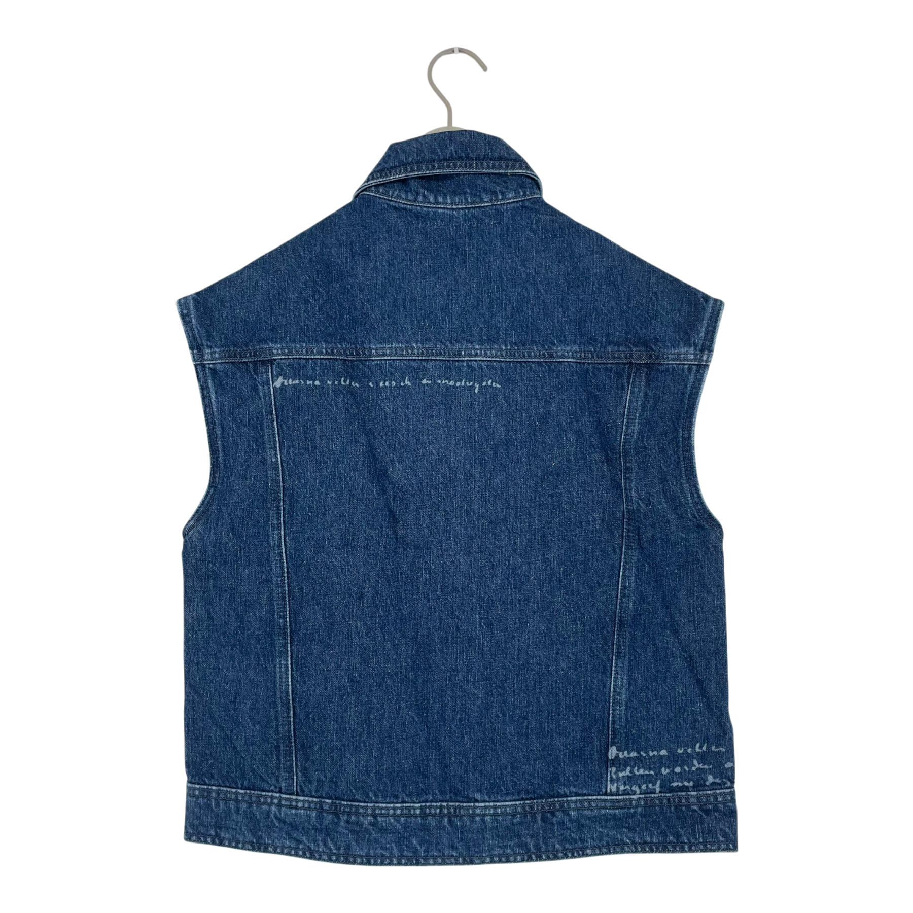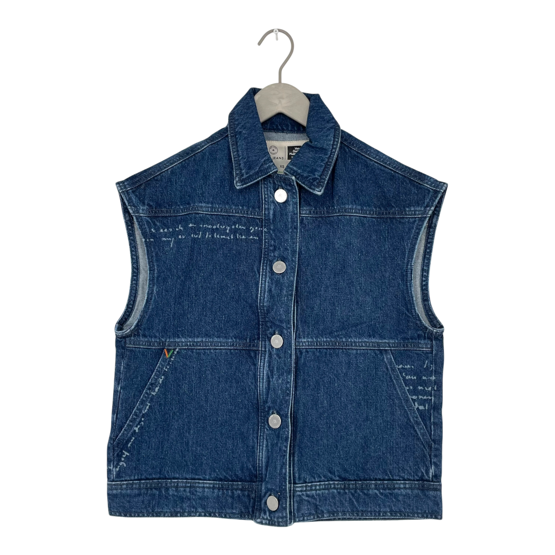 Mud Jeans van Gogh vest is a part pf the summer 2022 recycled denim capsule collection. Collaboration between Van Gogh Museum and MUD Jeans – the world’s first circular denim brand. The items in the collection feature lasered details of Vincent van Gogh’s handwriting, from his letters, and embroidered back prints of his masterpieces Almond Blossom and Self-Portrait with Grey Felt Hat.