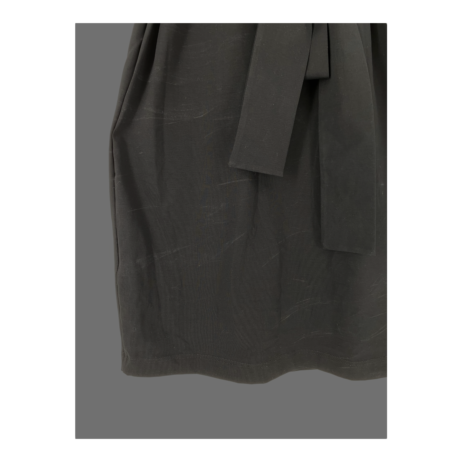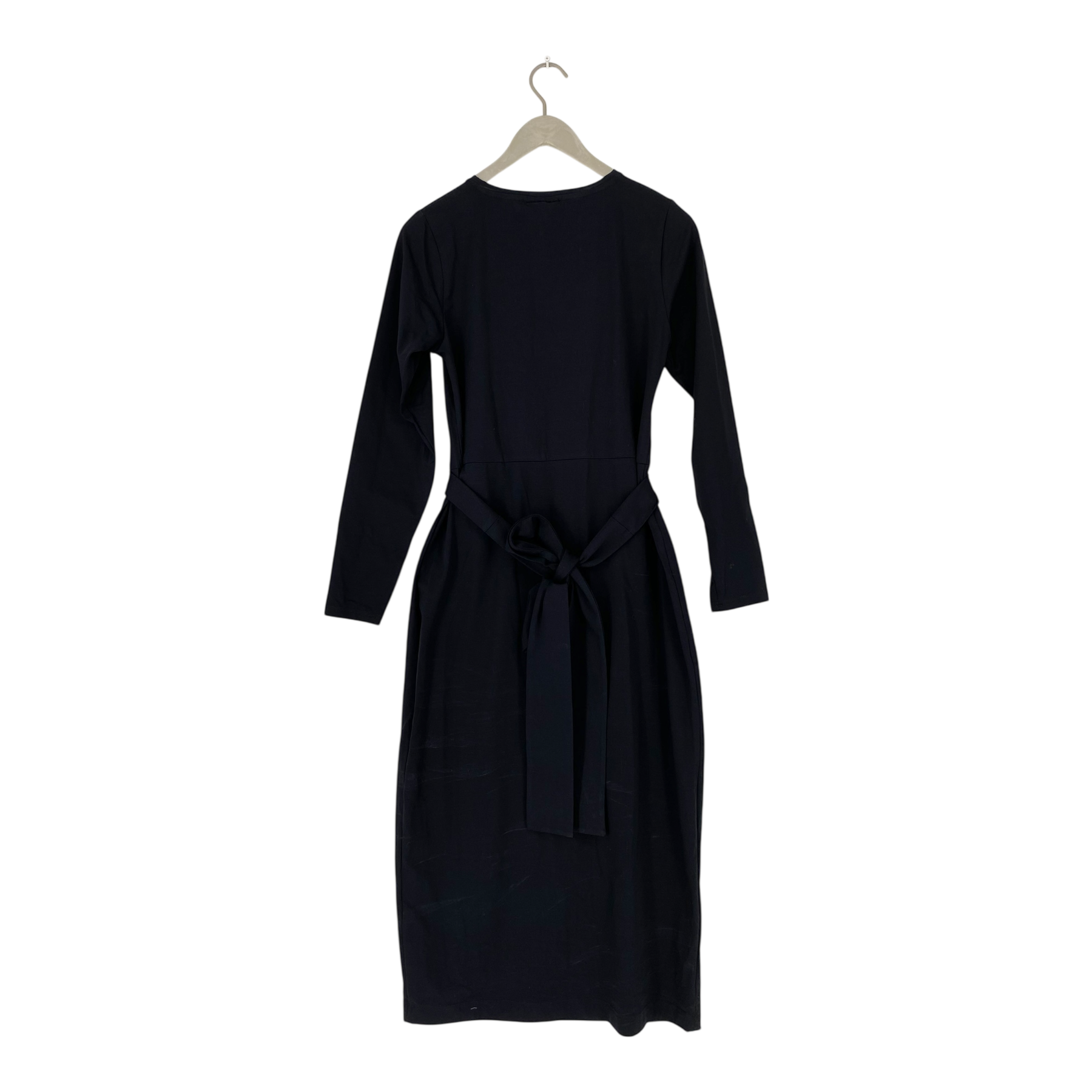 Nakoa belted slim fit dress in black tricot with long sleeves. The product tags are still attached, but the dress has some stains from fitting that can most likely be removed.