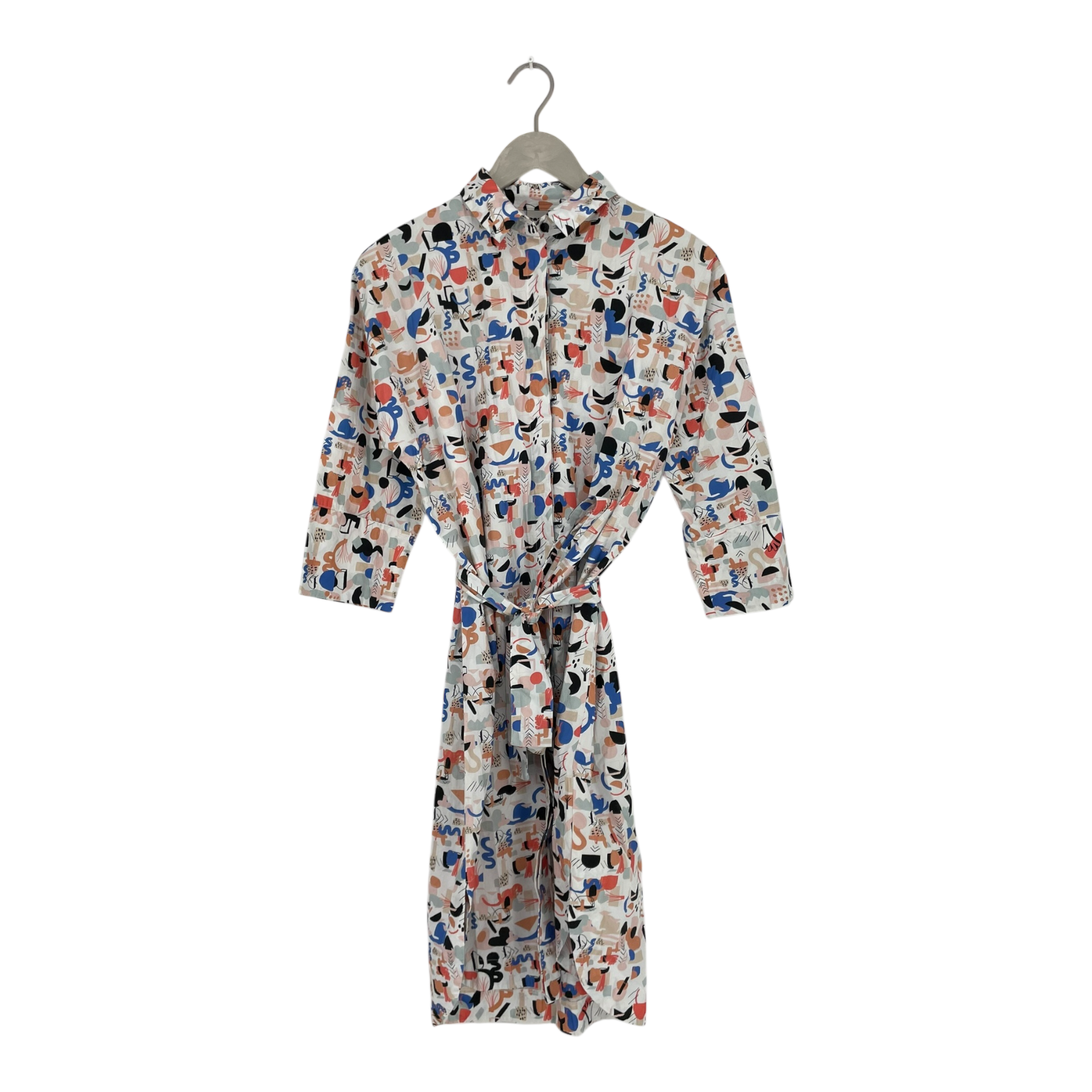 Papu women's woven buttoned dress with collar. Hidden buttons down the front, separate fabric belt. Uneven hem is longer from the back. 3/4 sleeves. Basic fit. The colours have faded somewhat.