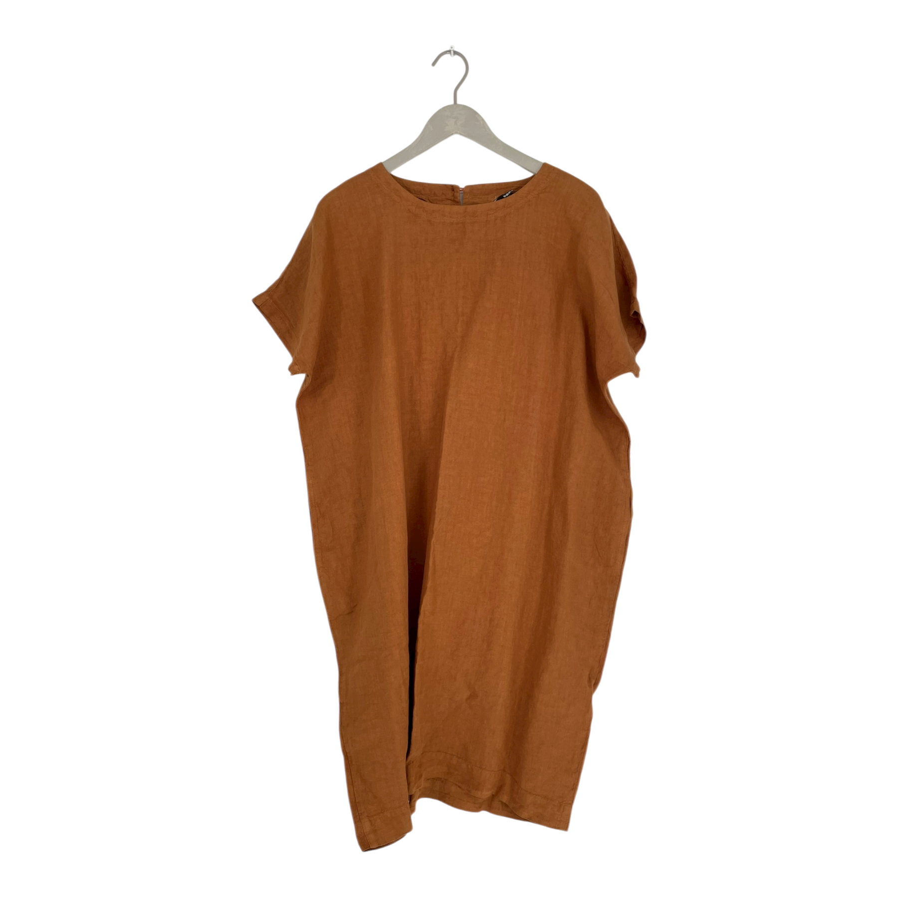 Papu Women's linen dress in brown with a button and slit in the back, pockets on the sides. The product tags are still attached, the item is in excellent condition. The size tag says size S, but the item fits most likely sizes S-L because of the oversize fit.