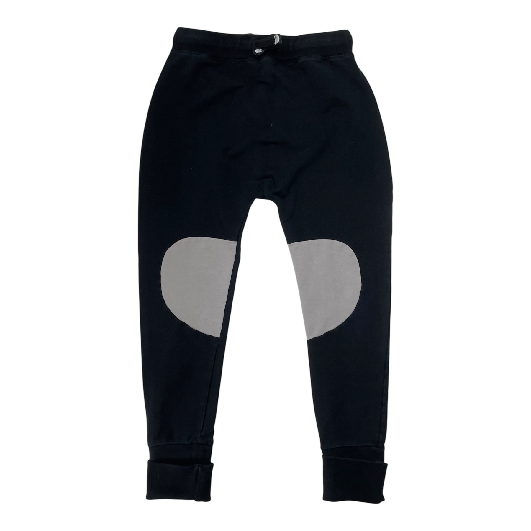 Papu college sweatpants with contrast color knee patches and foldable leg ends. String at waist. Foldable leg ends for a longer fit for one child.